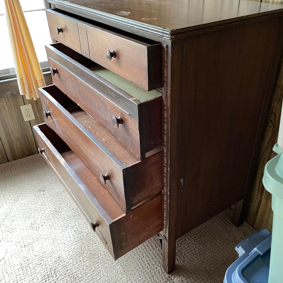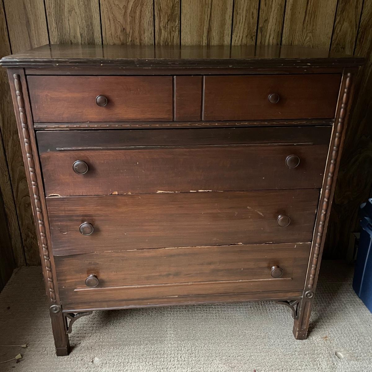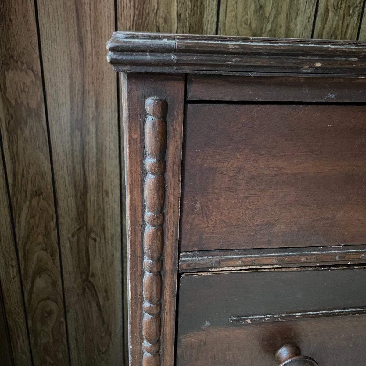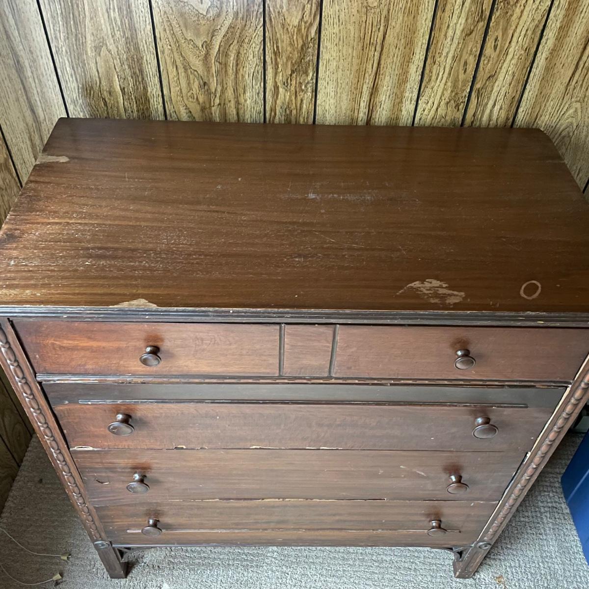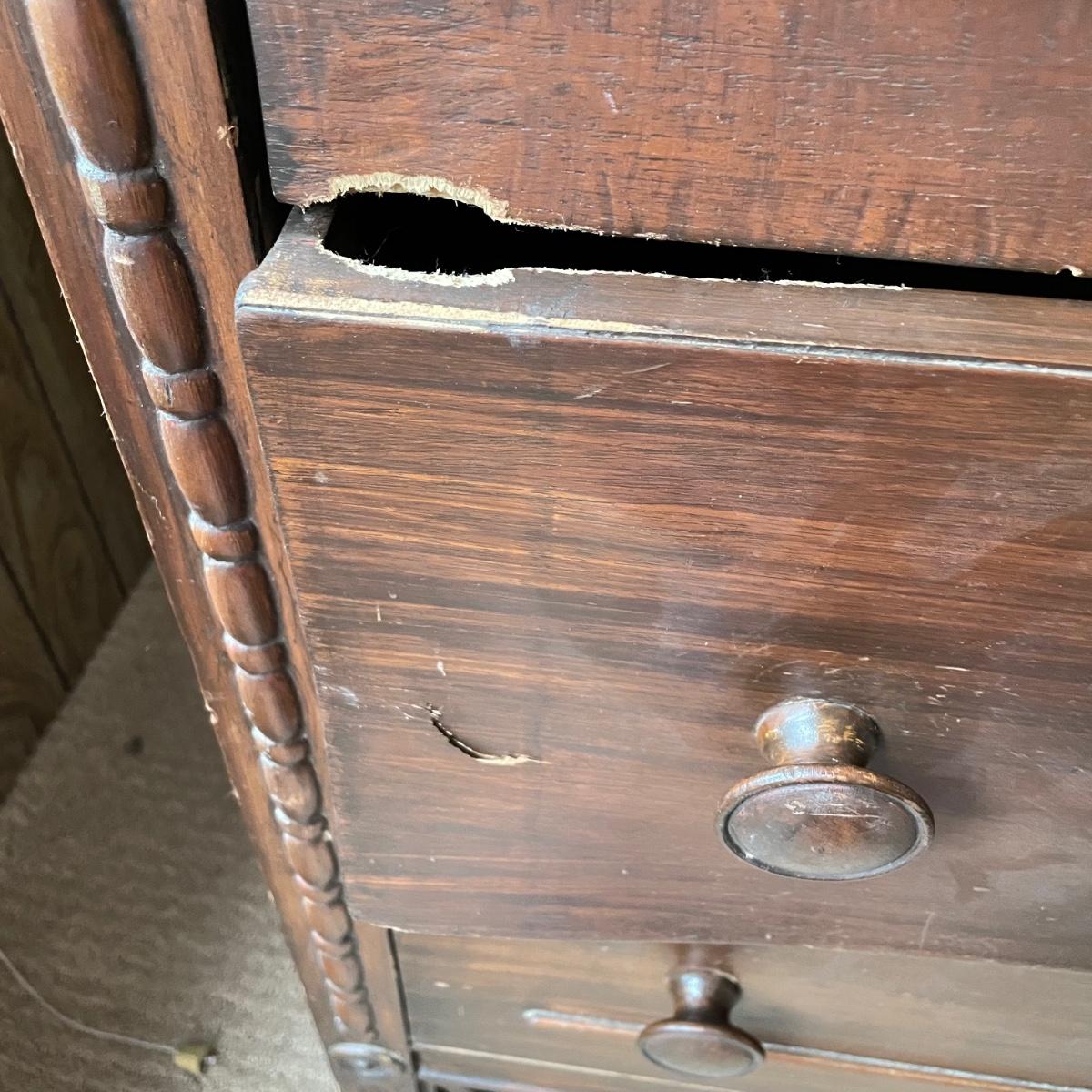 Piece two of three in this bedroom suite. This antique dresser has four dovetail drawers and nice carved embellishments. Each drawer has two wooden pulls. The third drawer down has its veneer pulling away from the drawer front. The second and third drawers both have some significant blemishes, but the overall charm of the piece is strong. This dresser is sturdy and measures 38” x 20” x 41.5”. See images. Bring help to load, local pick up only.