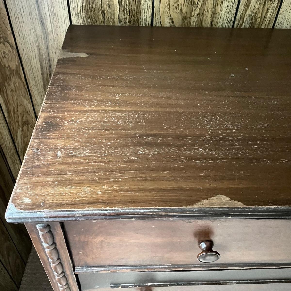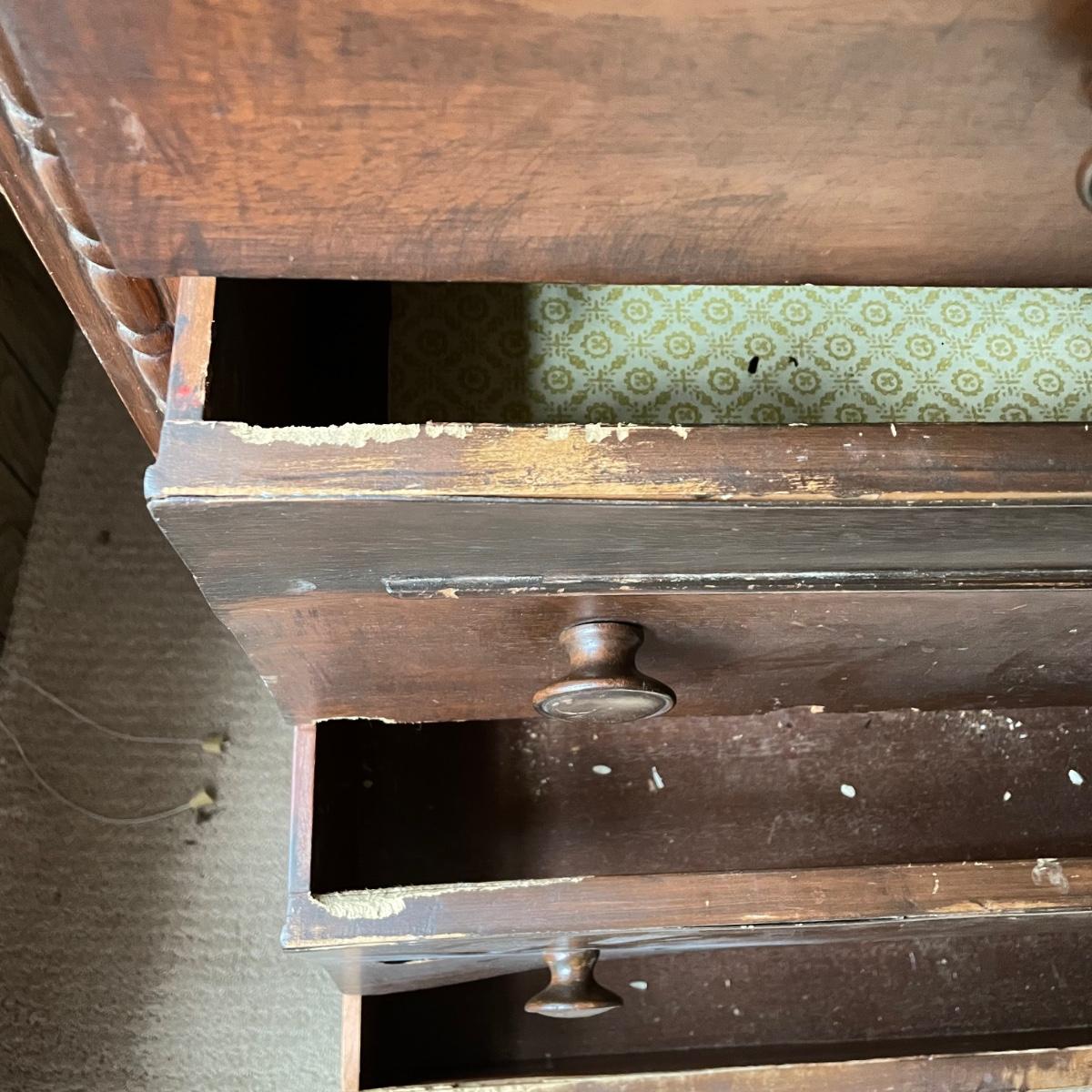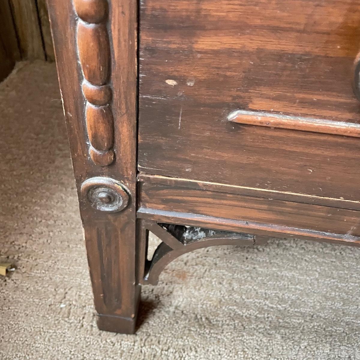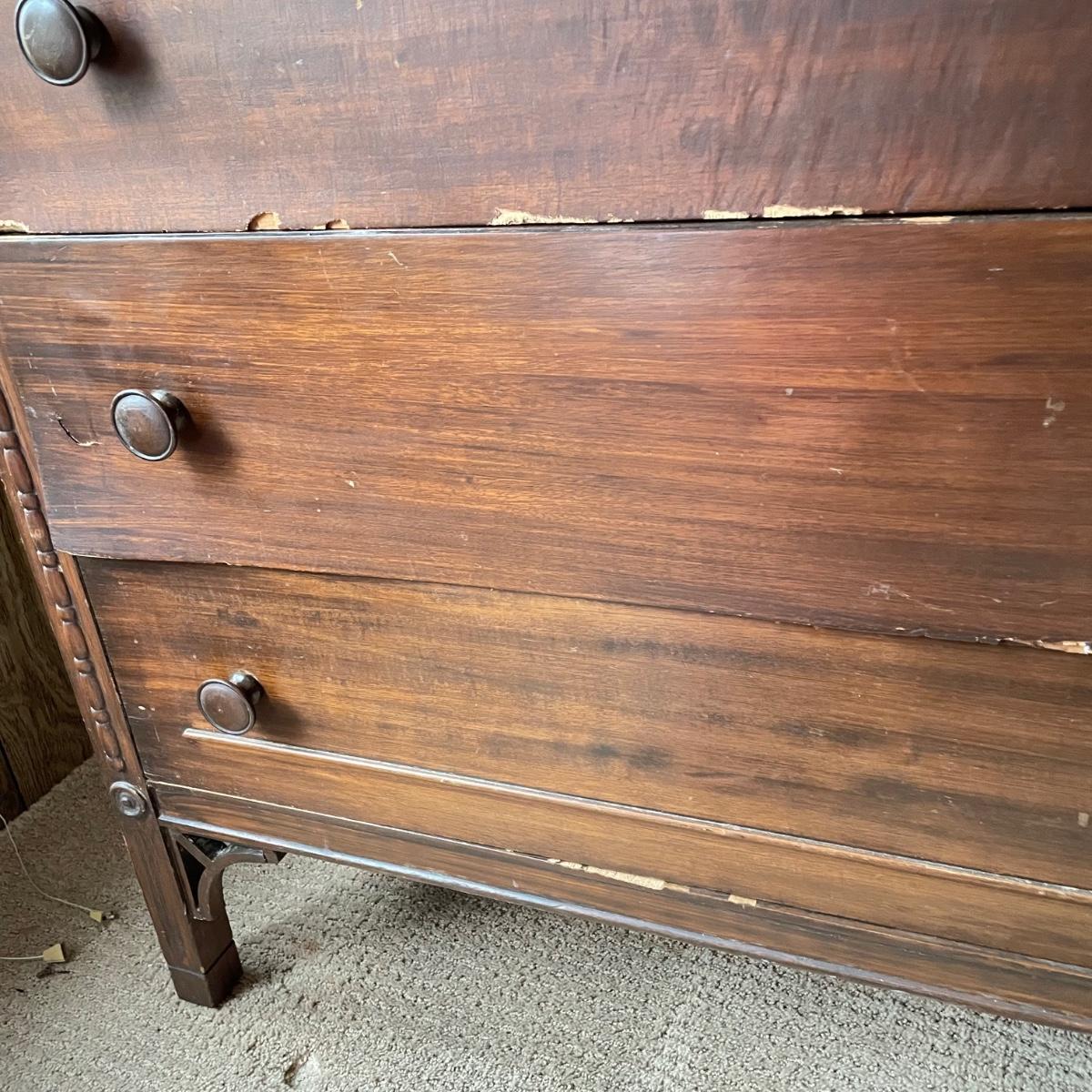 Piece two of three in this bedroom suite. This antique dresser has four dovetail drawers and nice carved embellishments. Each drawer has two wooden pulls. The third drawer down has its veneer pulling away from the drawer front. The second and third drawers both have some significant blemishes, but the overall charm of the piece is strong. This dresser is sturdy and measures 38” x 20” x 41.5”. See images. Bring help to load, local pick up only.