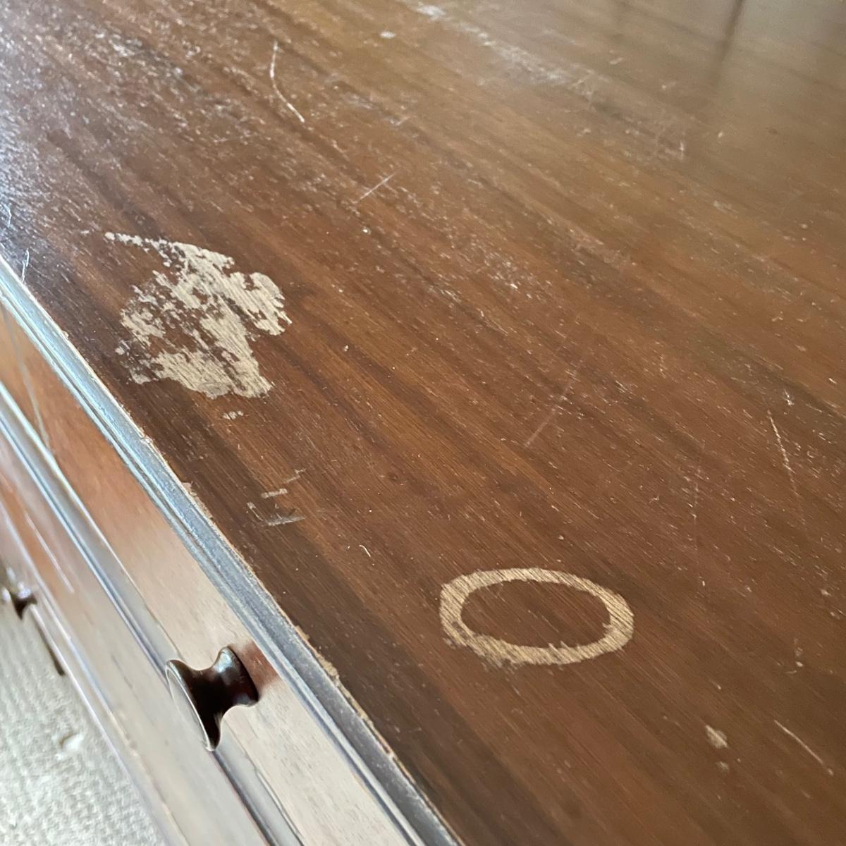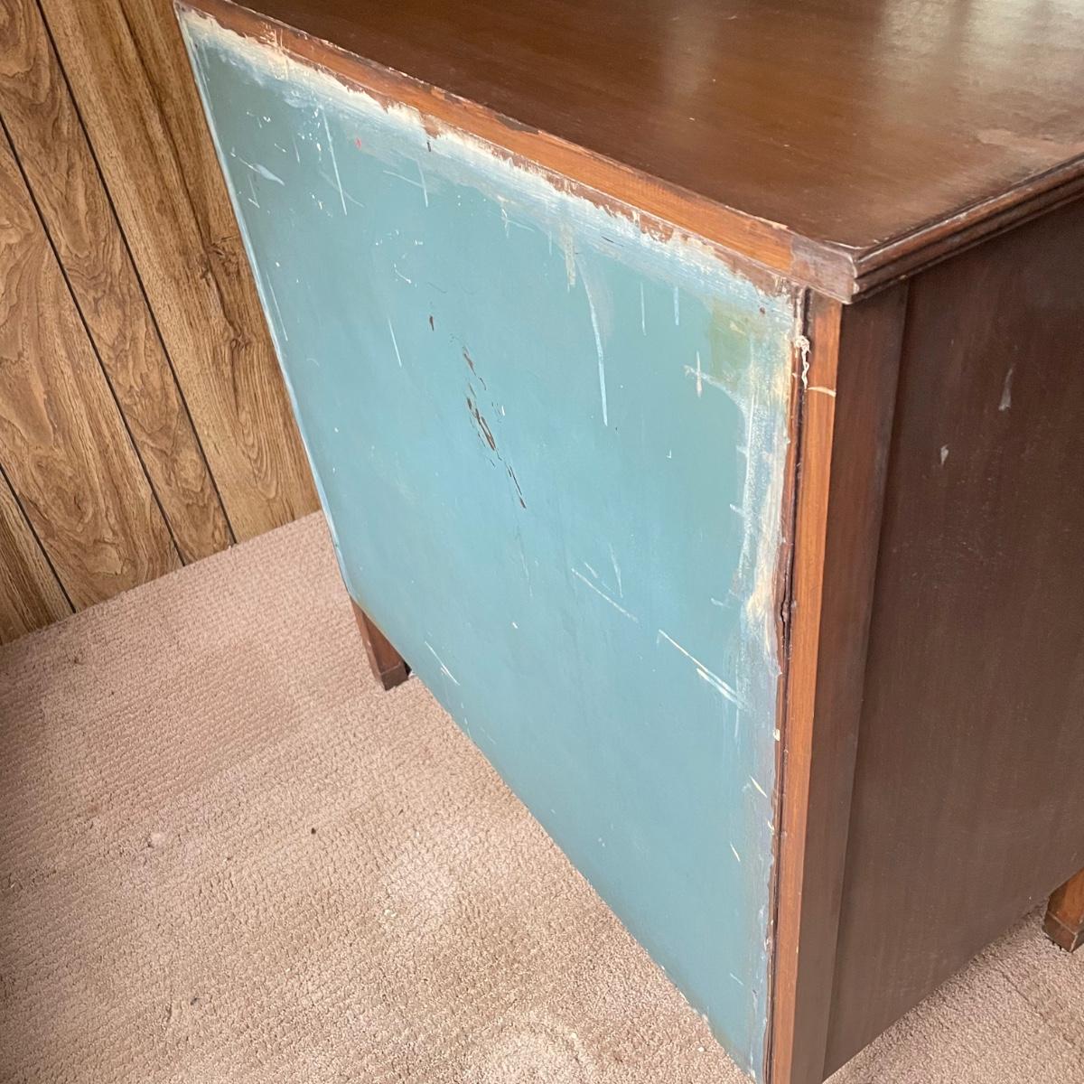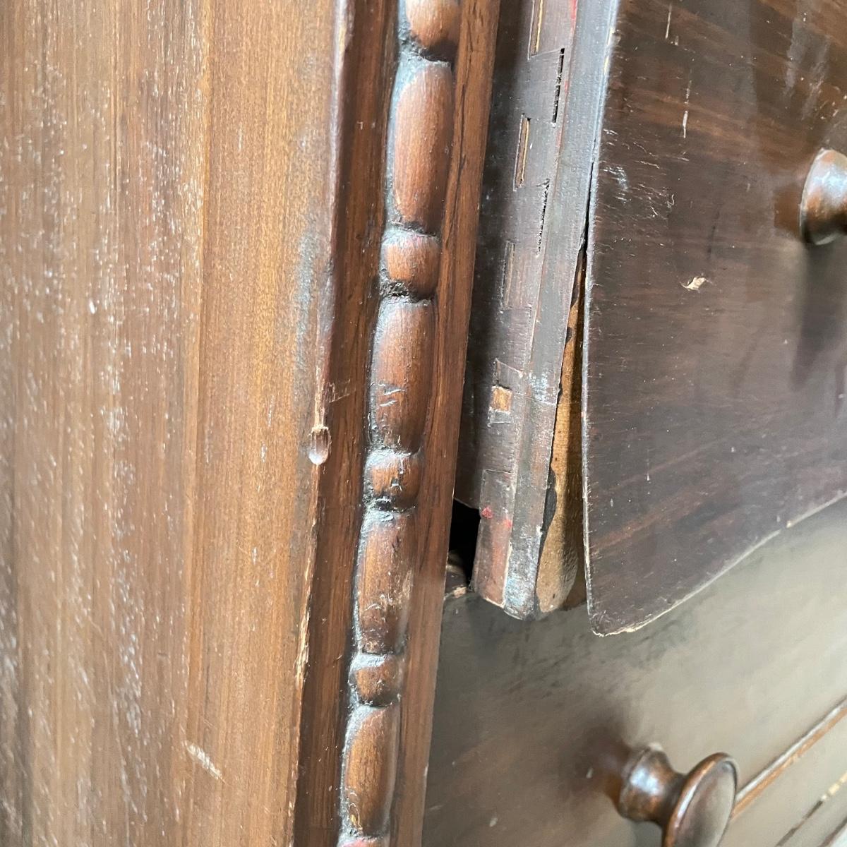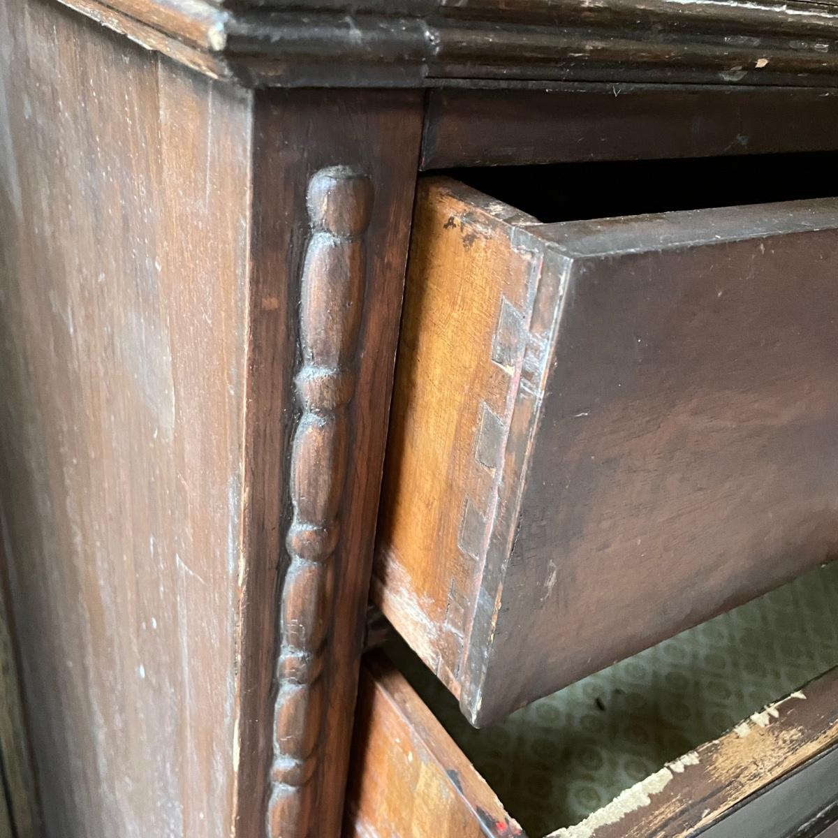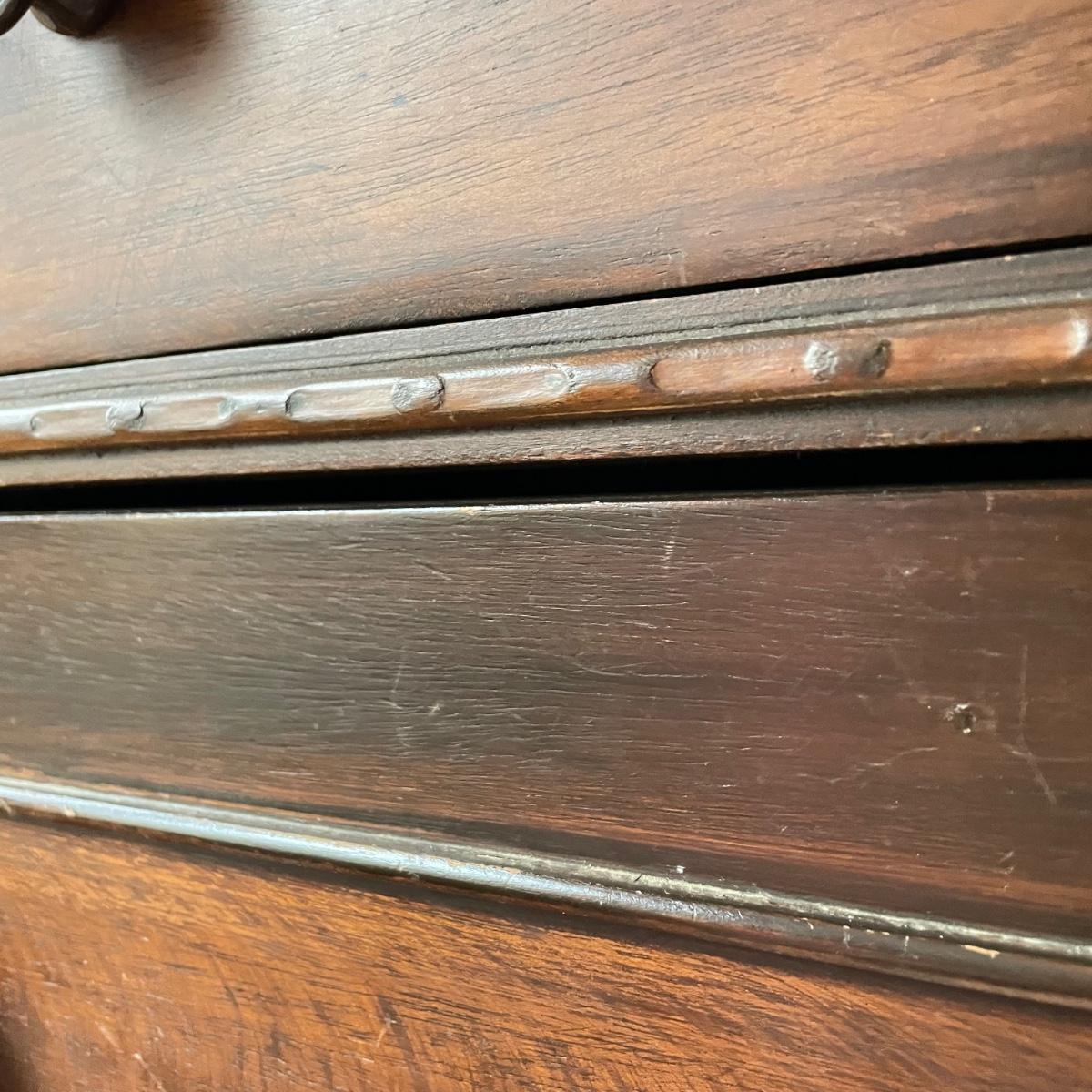 Piece two of three in this bedroom suite. This antique dresser has four dovetail drawers and nice carved embellishments. Each drawer has two wooden pulls. The third drawer down has its veneer pulling away from the drawer front. The second and third drawers both have some significant blemishes, but the overall charm of the piece is strong. This dresser is sturdy and measures 38” x 20” x 41.5”. See images. Bring help to load, local pick up only.