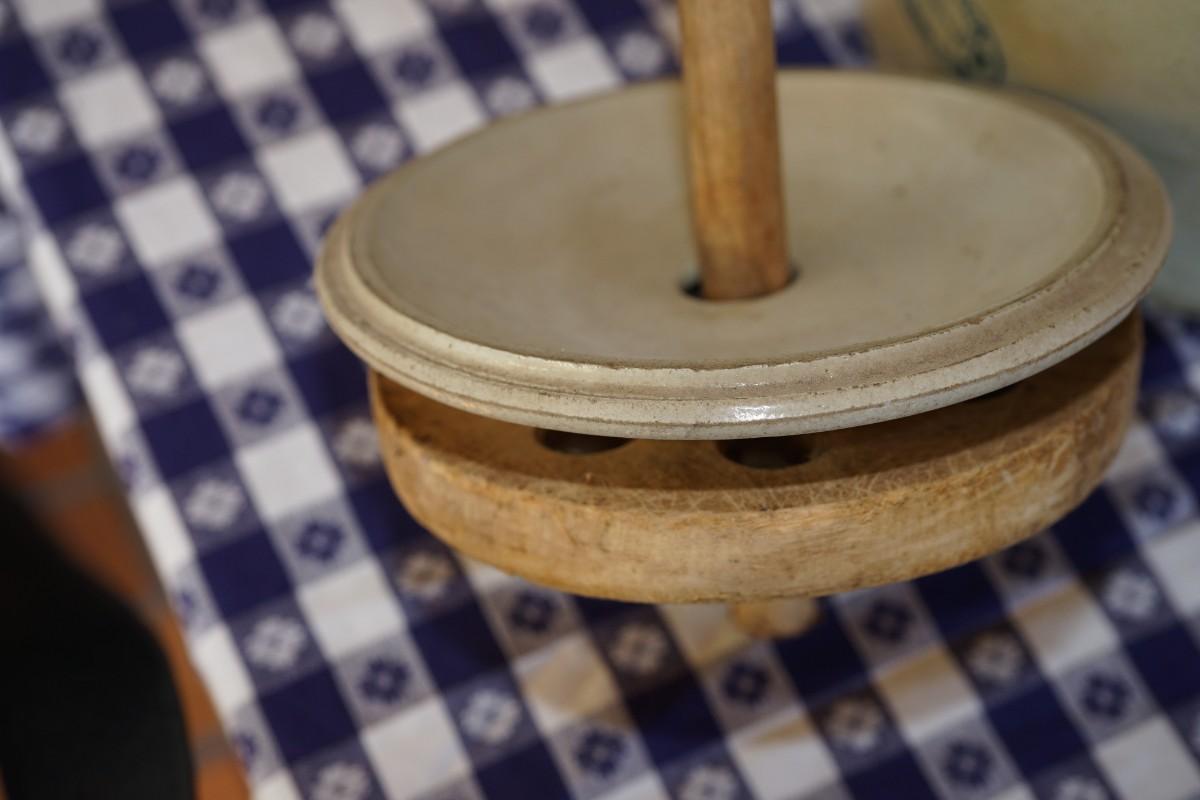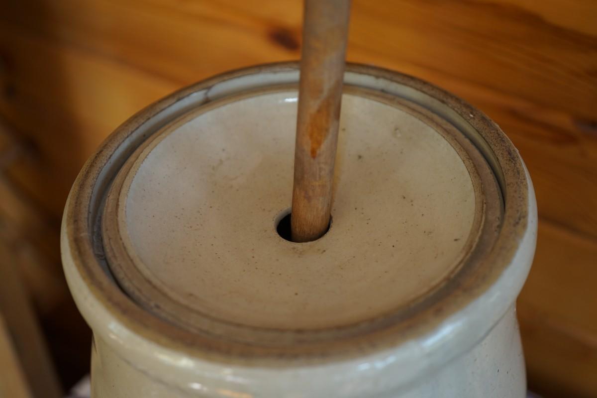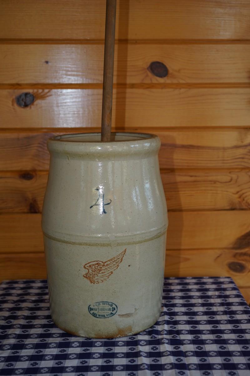the churn as the stoneware and wooden dasher or plunger. a rare find from what I can tell.