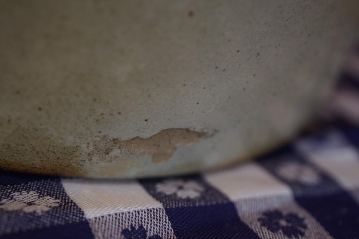 the churn does not have any cracks. There is some discoloration at the base and a few older surface chips.
