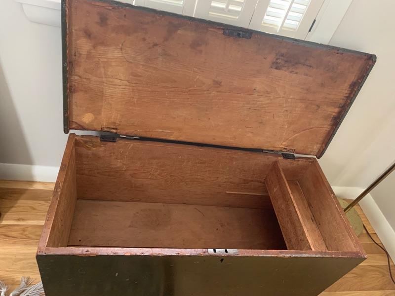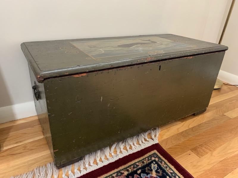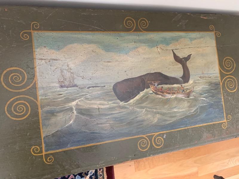 An early New England 6-board pine blanket chest with an old painted folk art whaling scene on the top. Purchased many years ago on Cape Cod. Interior has til, hinges have been replaced at some point in it's life, cast iron handles on each end. Chest has dings & dents, some missing paint and old nail holes as expected in an antique primitive piece.