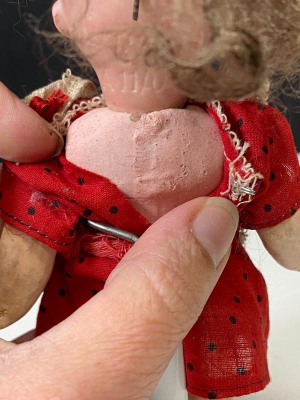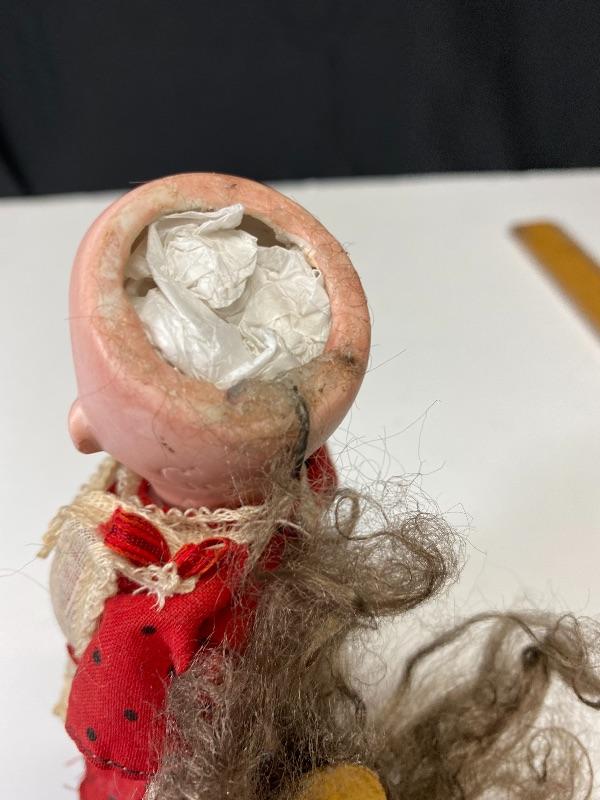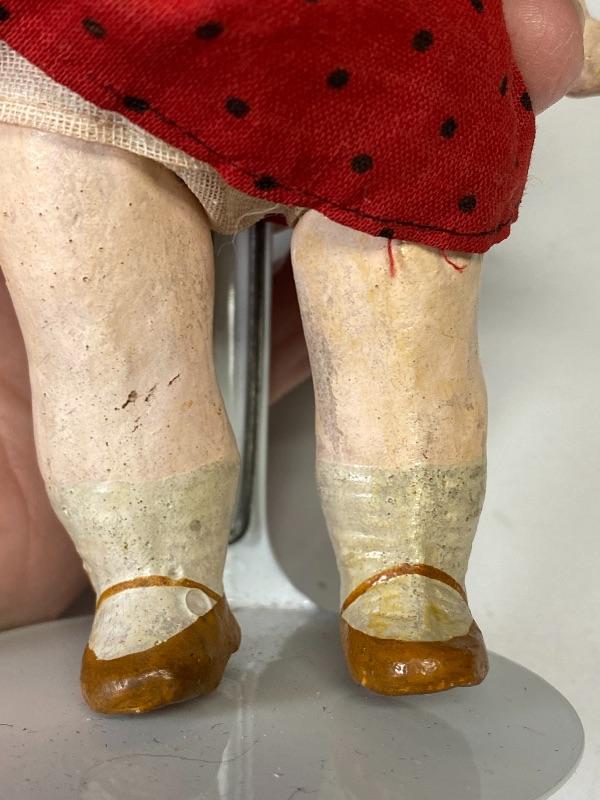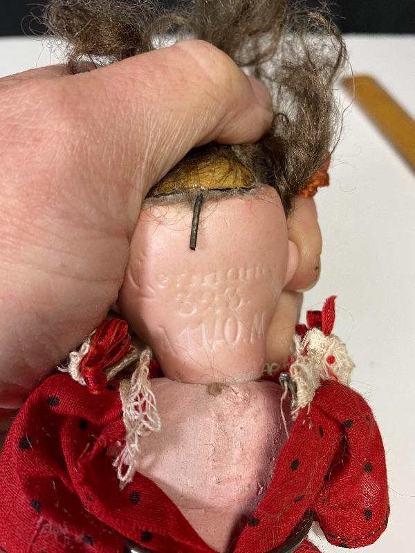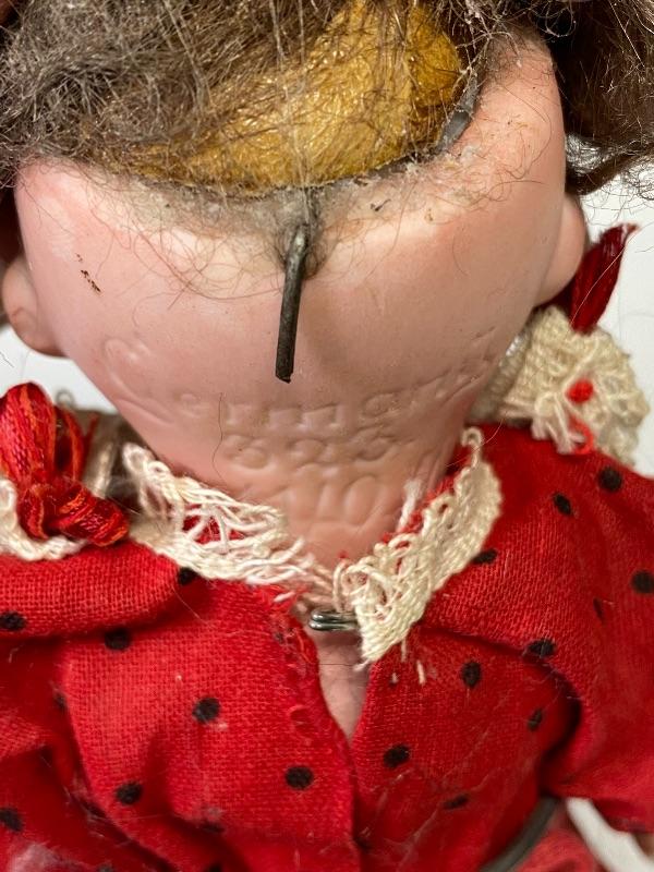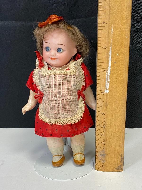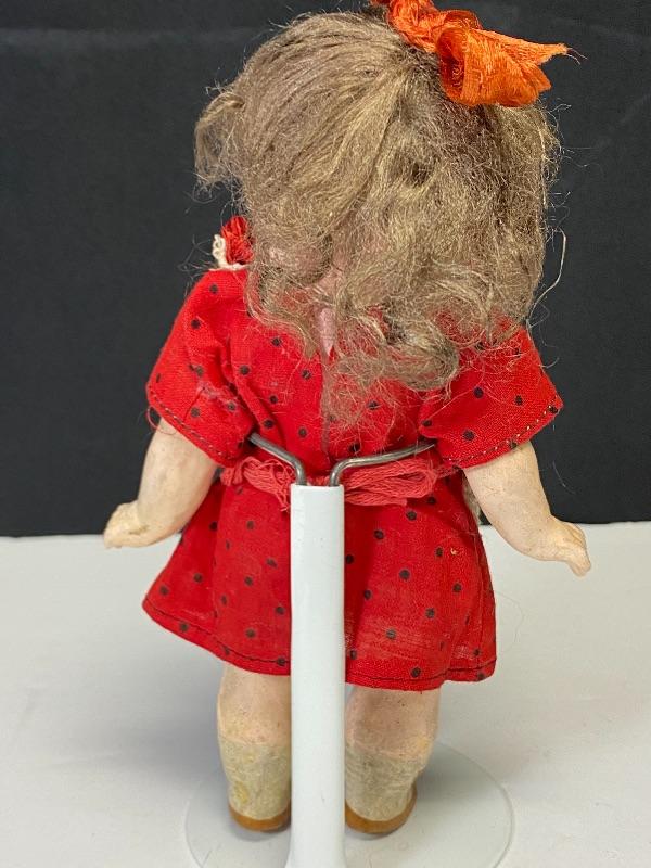 Antique 7" Armand Marseille googly eyed bisque & composite doll. Blue eyes that look to the right, they are sleep eye also but there is paper stuff in her head. Her head is marked Germany 323 AM 11/0. Chubby composite body is not in great condition, possibly repainted, repaired. Comes with stand.