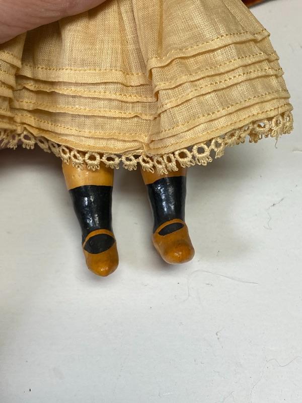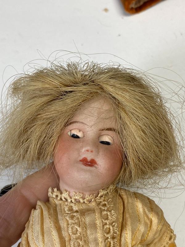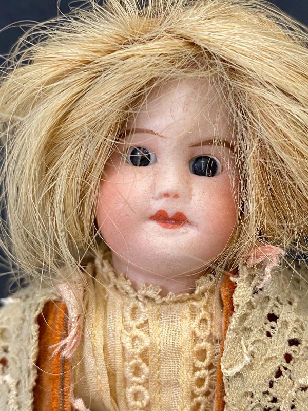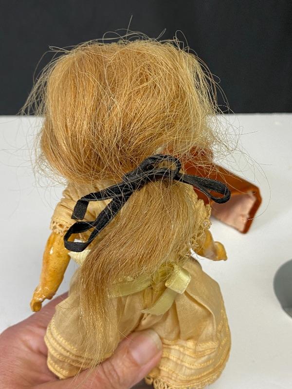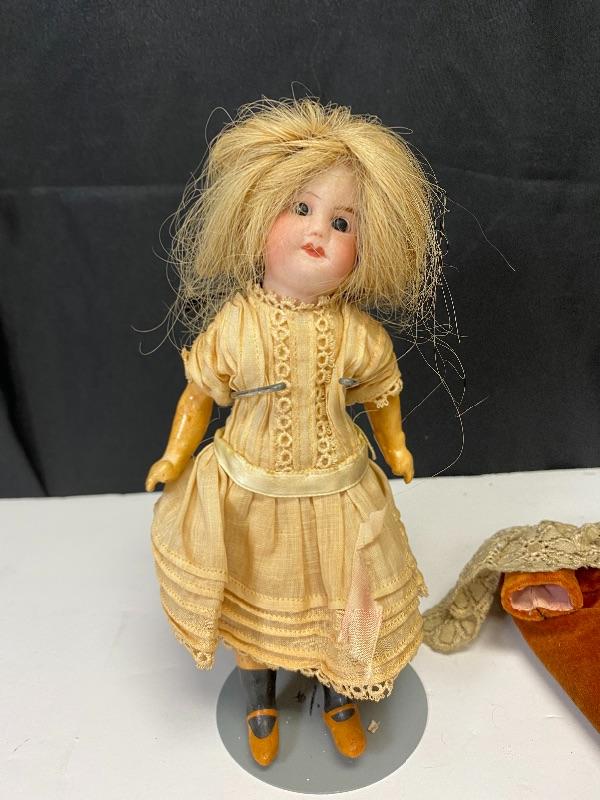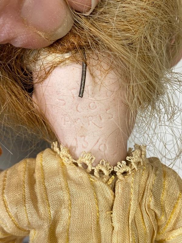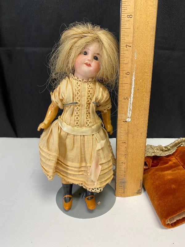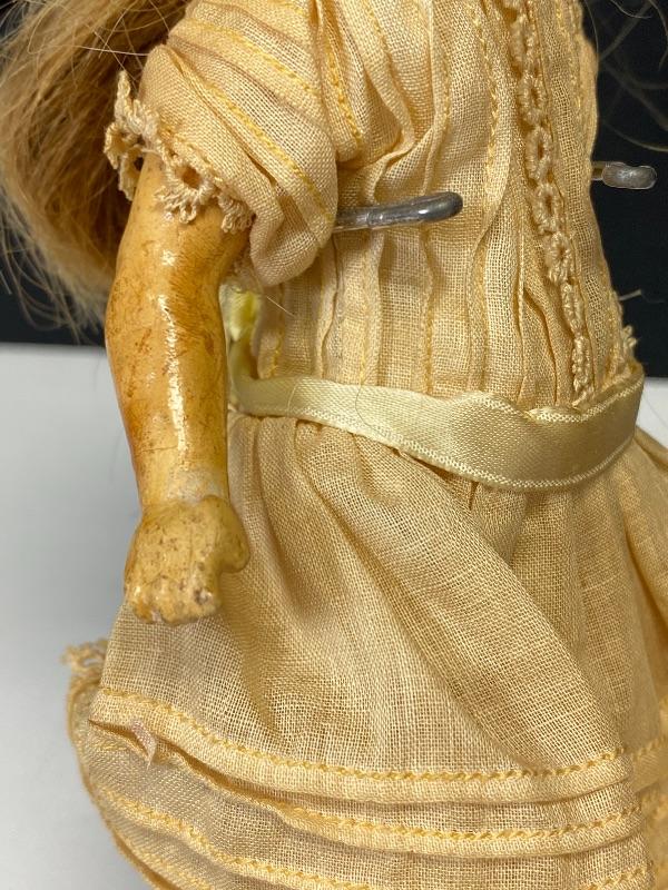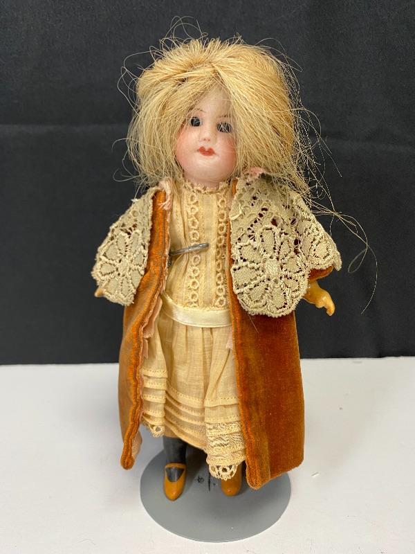 Antique 7" SFBJ 60 Paris 13/0 jointed doll. Bisque head and composite body. Head is marked. She has a Victorian style outfit on. Composite on arms is quite yellowed and is falling apart at the shoulders. She has sleep eyes that are dark colored, one pupil is bigger then the other. Her blonde wig feels like real hair. She has her issues but does display nice.