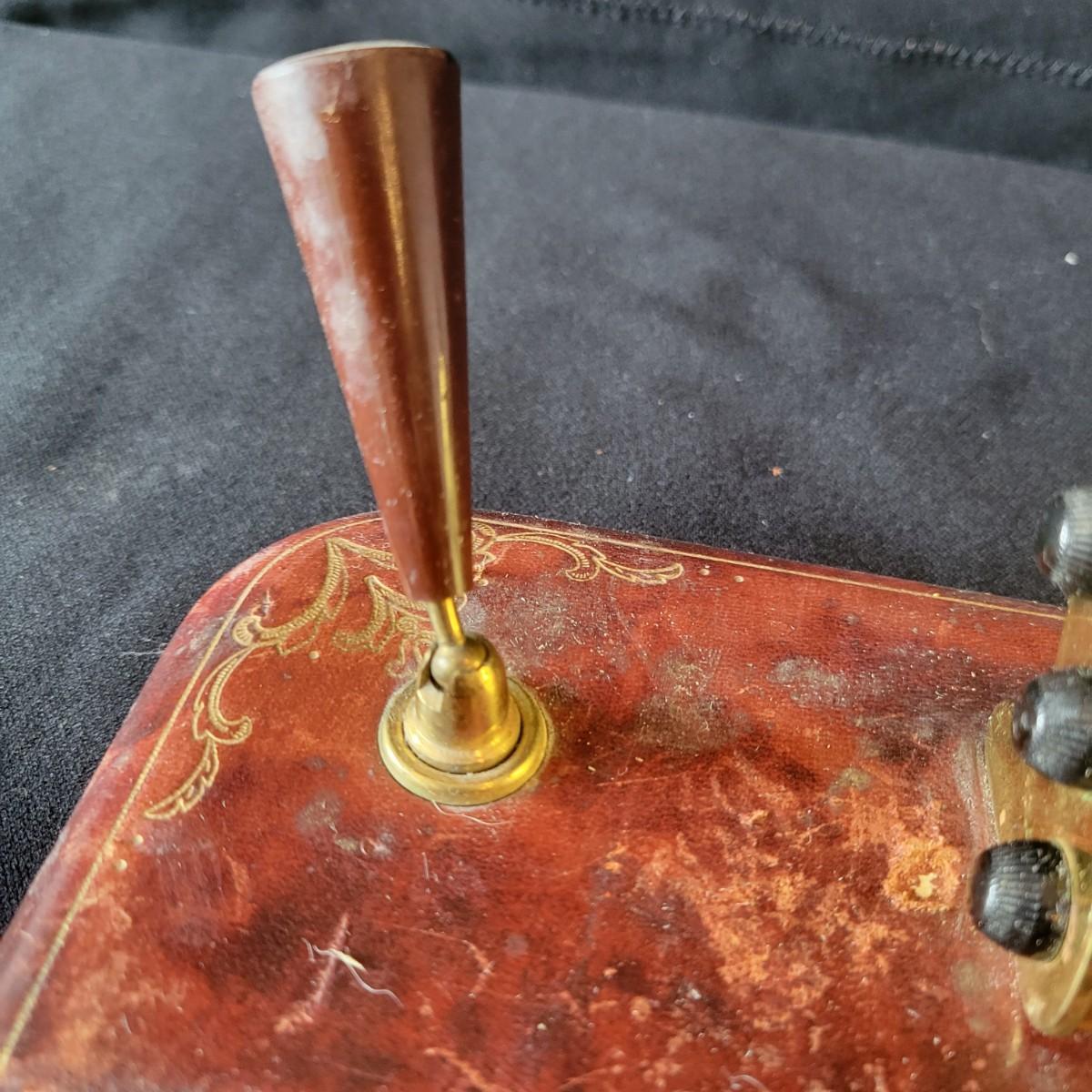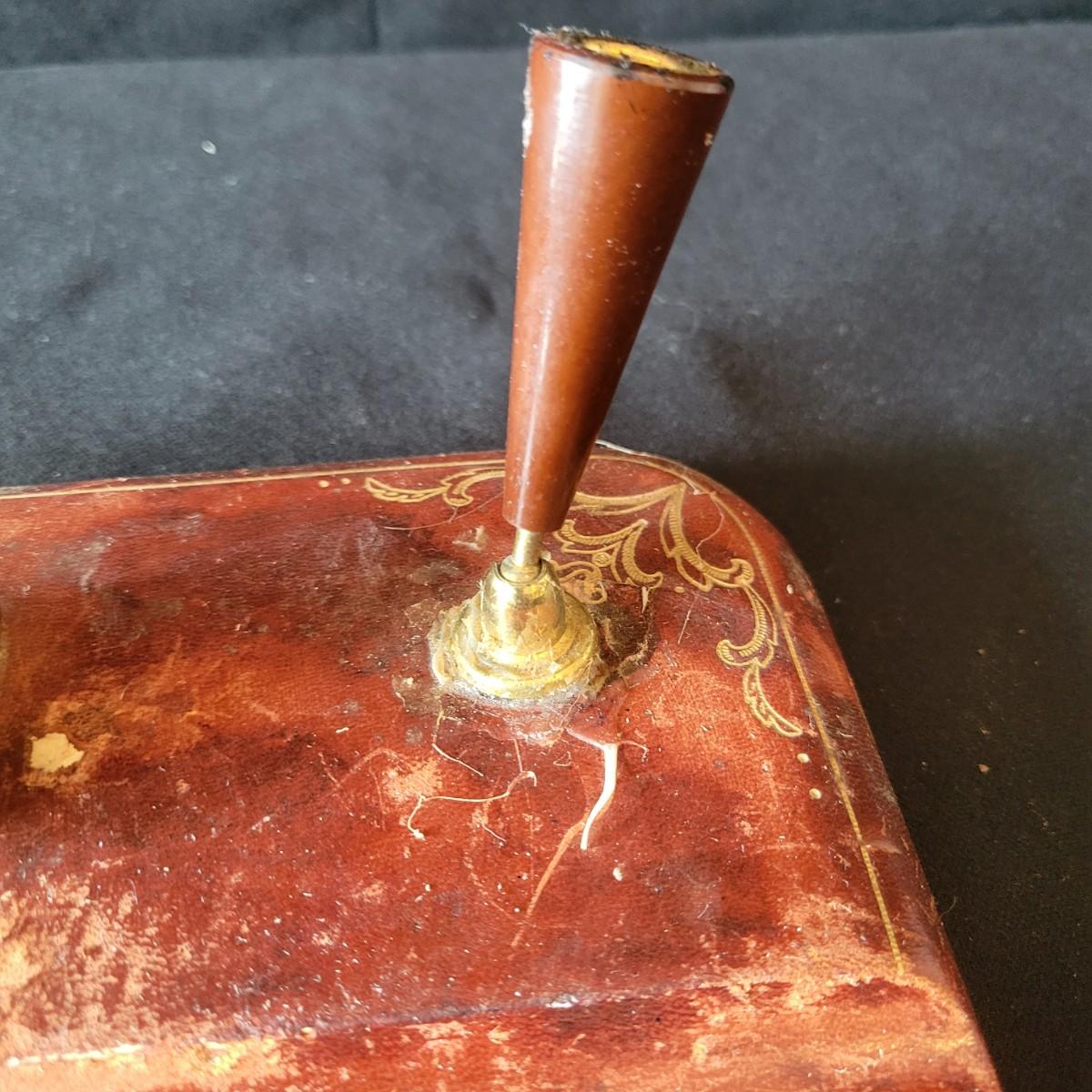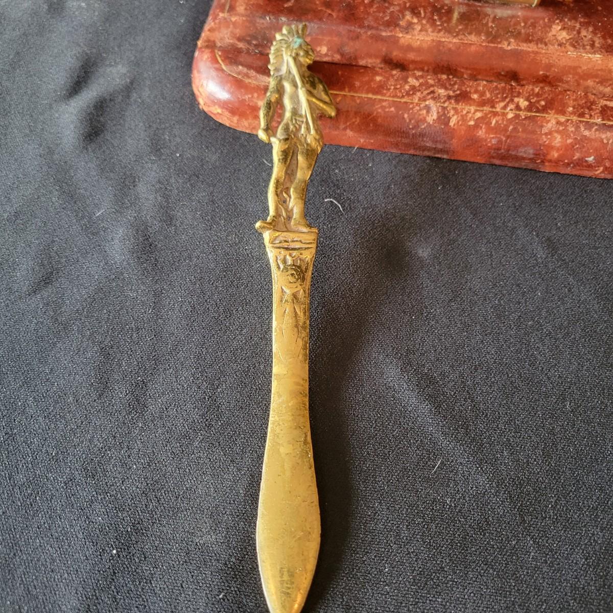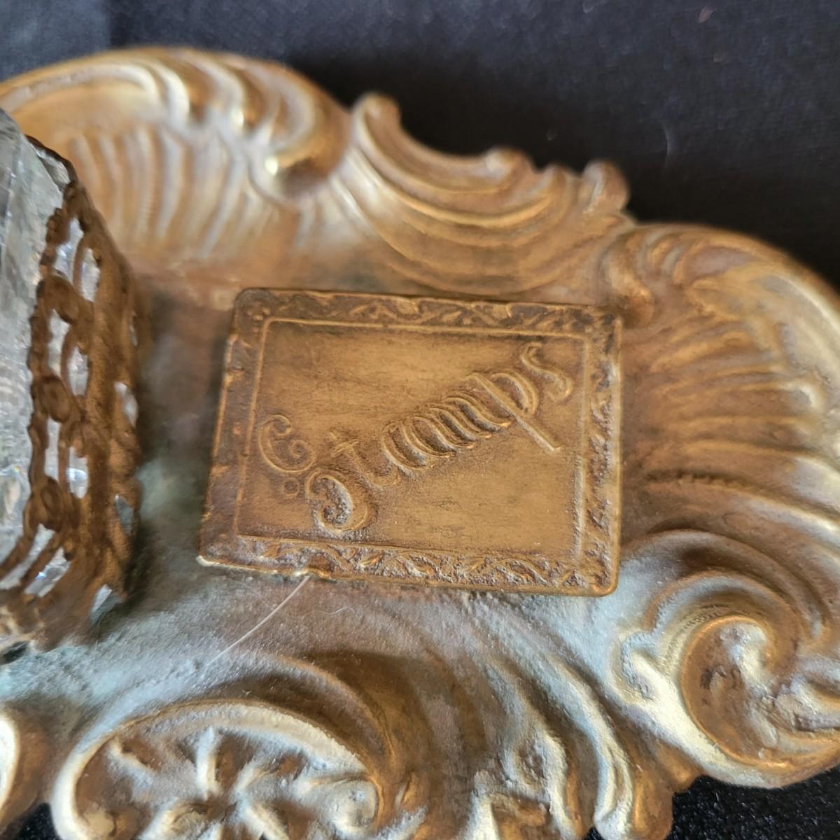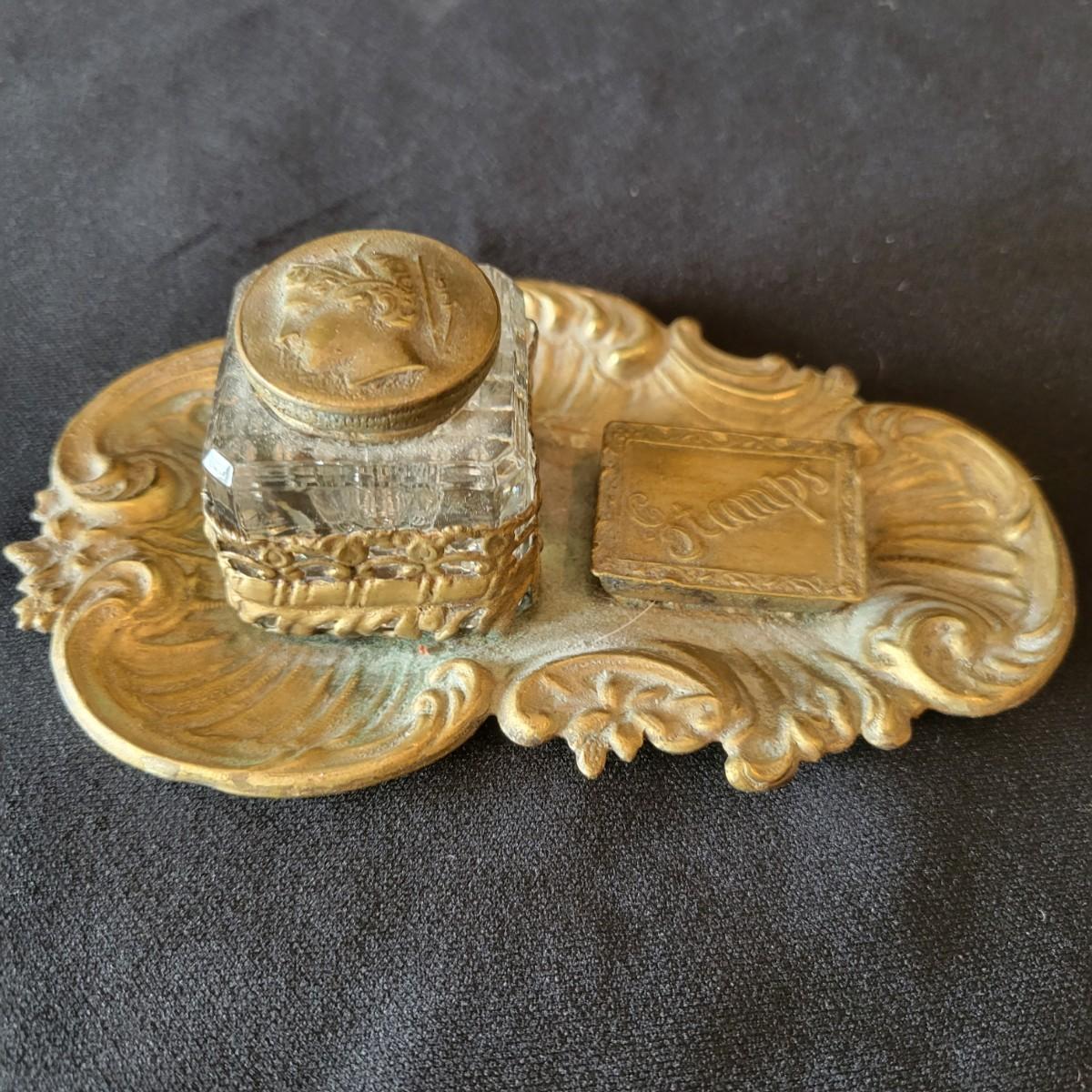 An assortment of antique office accessories that includes a pen holder, made of wood, with an adjustable calander made of brass. It has a marble like finish and measures approximately 10.5" x 6" x 4". Also includes a decorative ink well with a stamp holder, an unopened bottle of Waterman's blue ink, a brass letter opener with a native American figure, wooden horse themed dish with a glass bowl. Shipping available