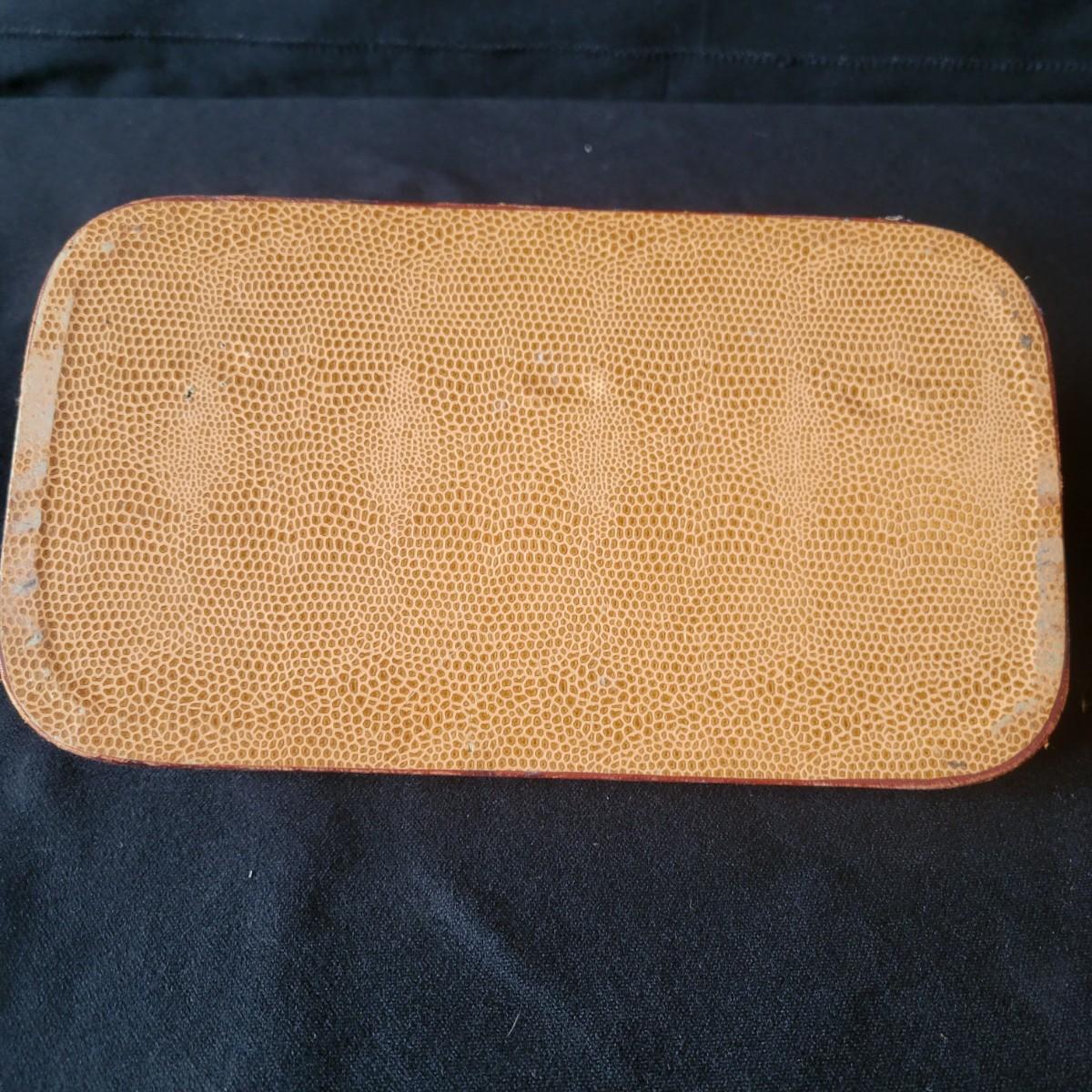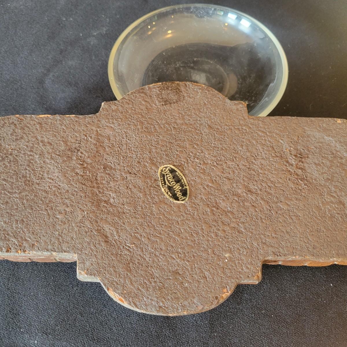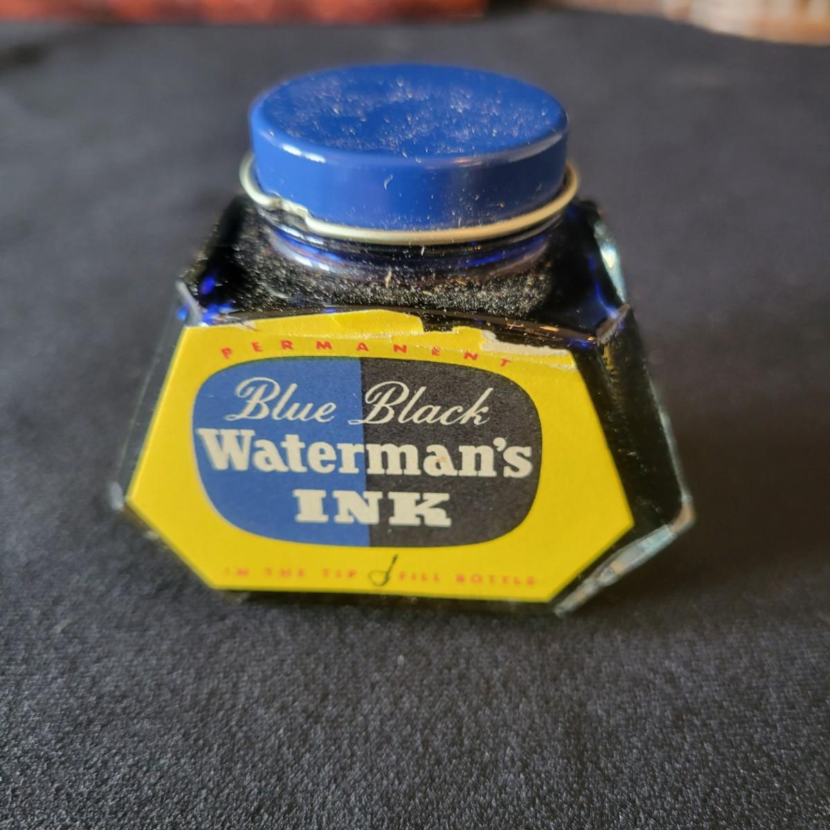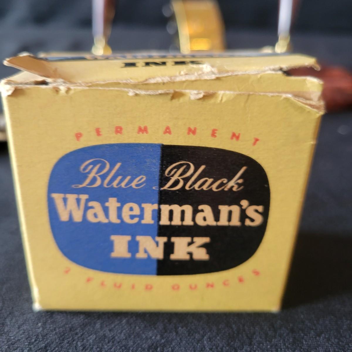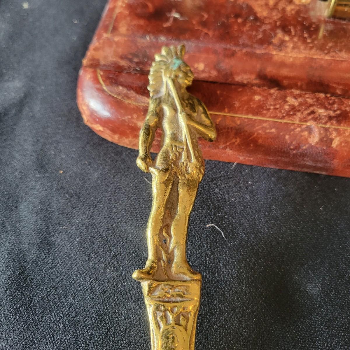 An assortment of antique office accessories that includes a pen holder, made of wood, with an adjustable calander made of brass. It has a marble like finish and measures approximately 10.5" x 6" x 4". Also includes a decorative ink well with a stamp holder, an unopened bottle of Waterman's blue ink, a brass letter opener with a native American figure, wooden horse themed dish with a glass bowl. Shipping available