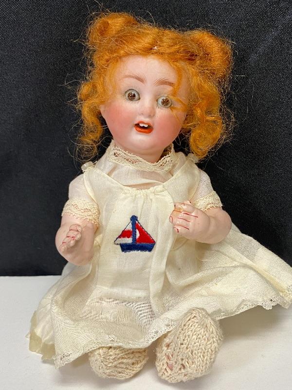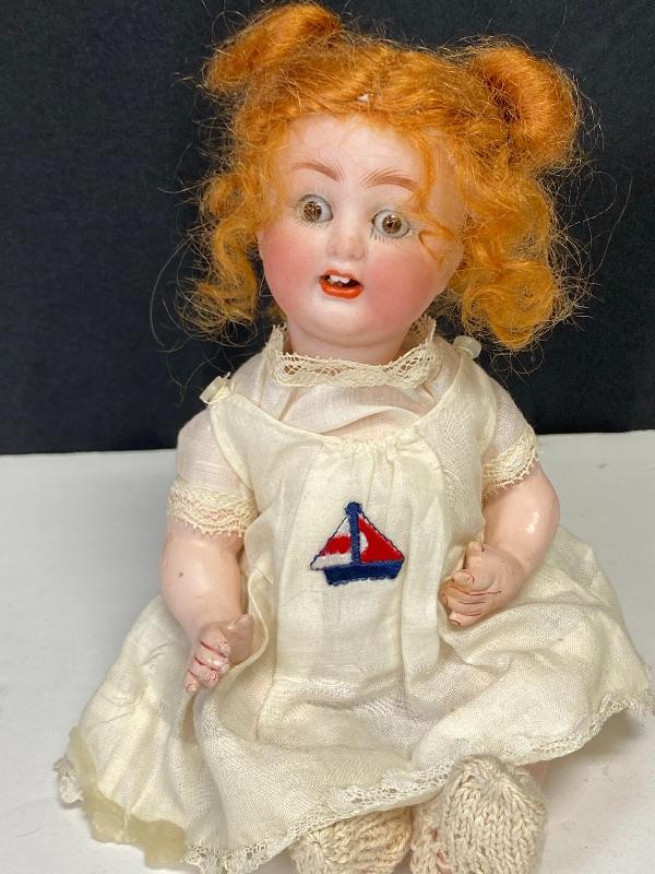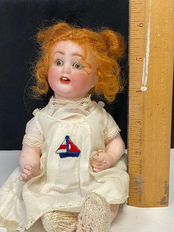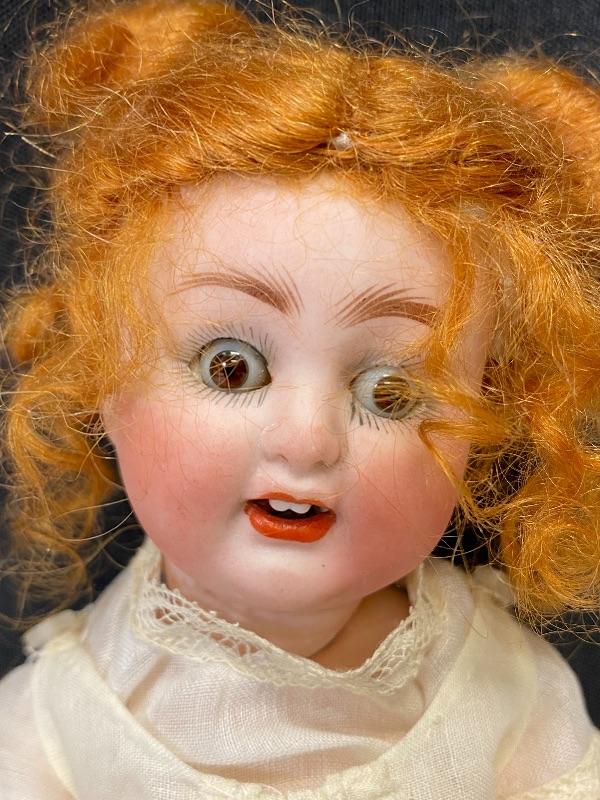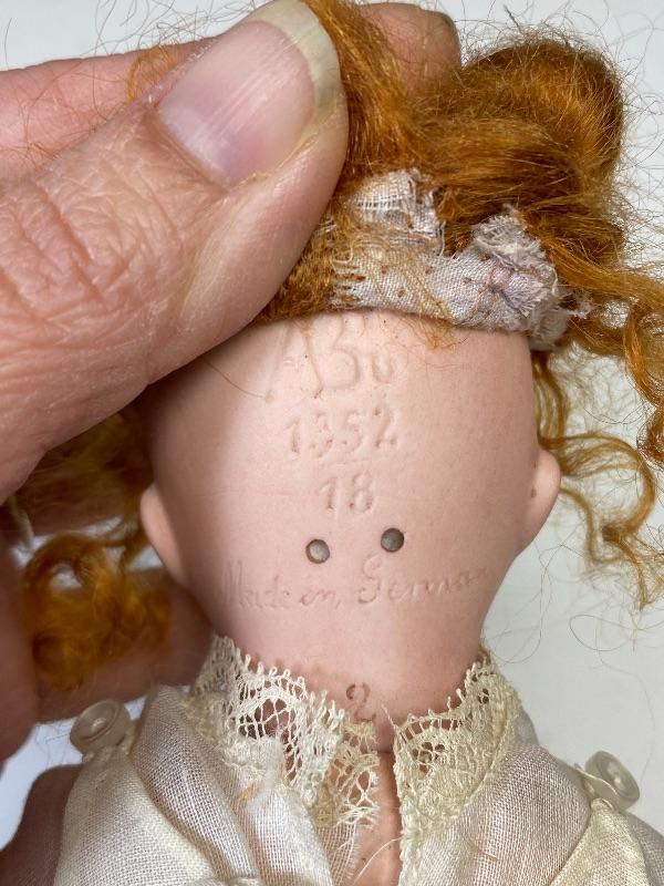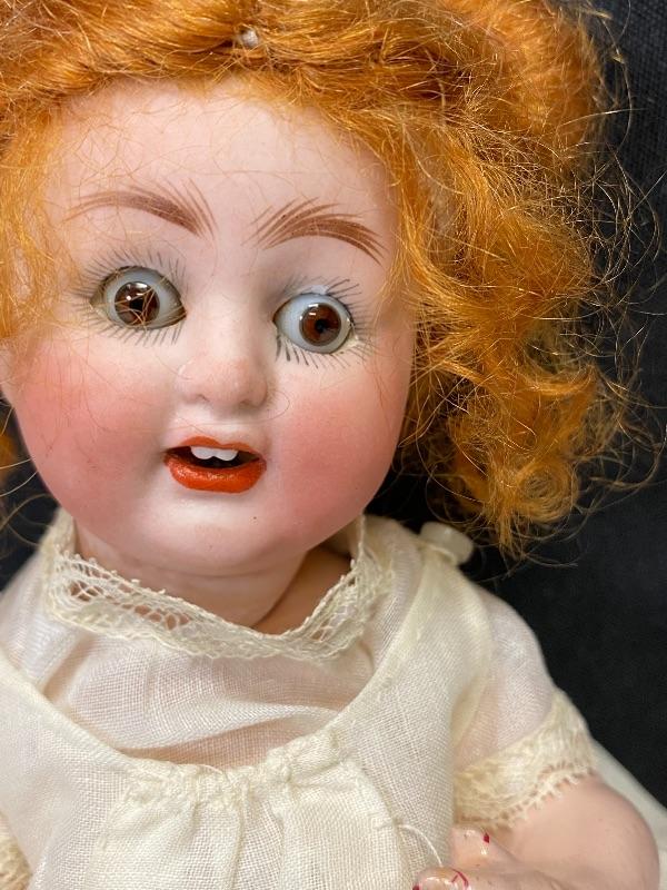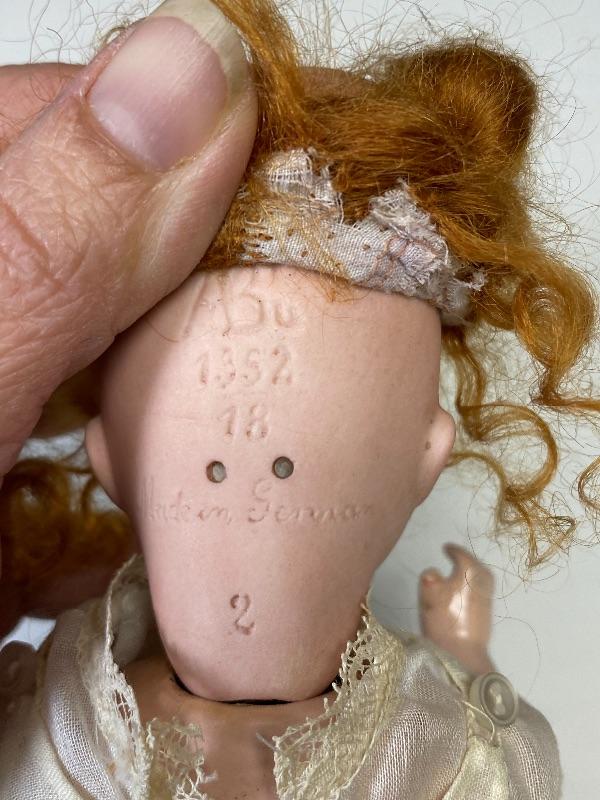 Antique Alt Beck & Gottschalck wild eyed bisque doll. Bisque head with composite body. She has a surprised deer in headlights look to her eyes. Head is marked ABG 1352/18. Bright red hair. Composite body, may have been repainted. About 8".