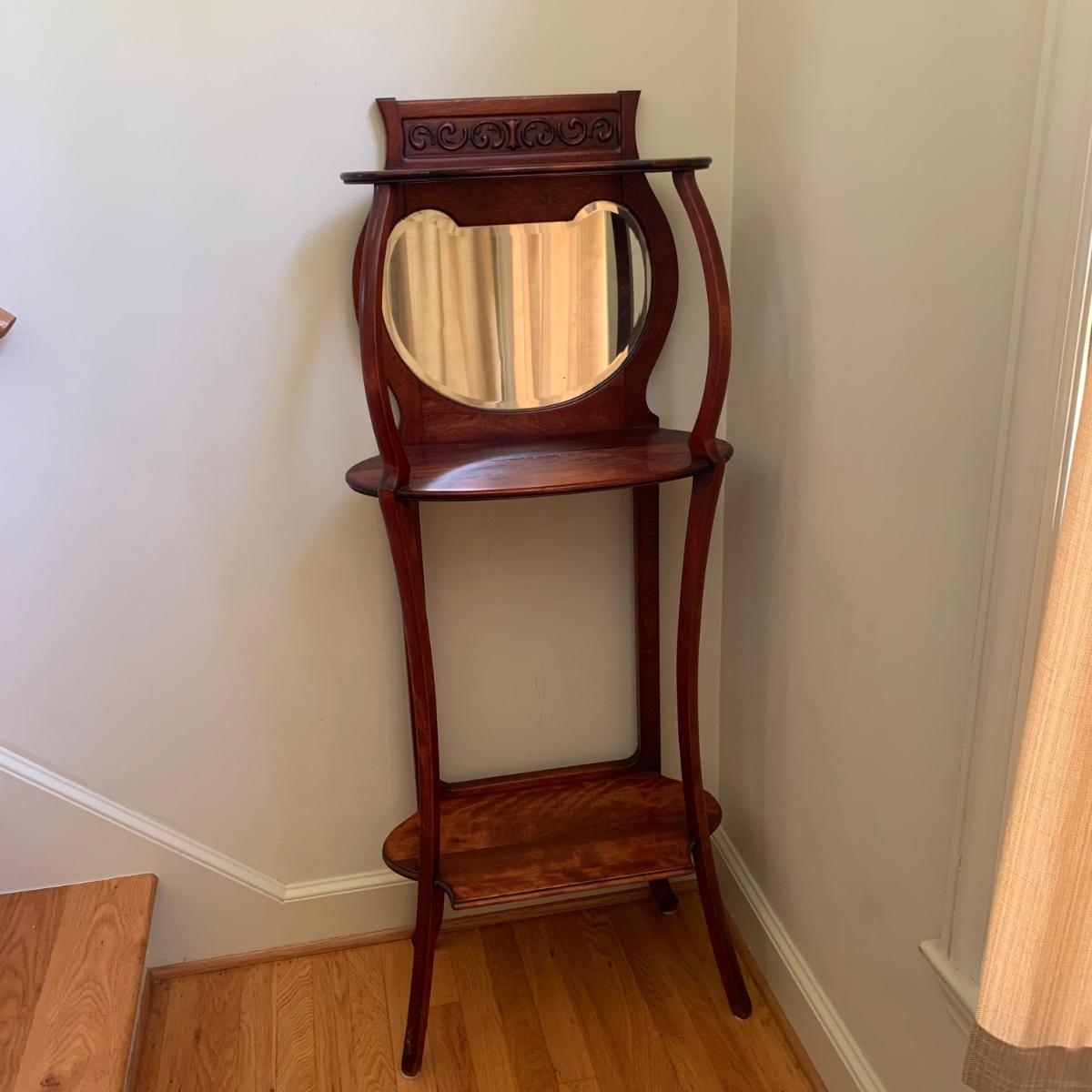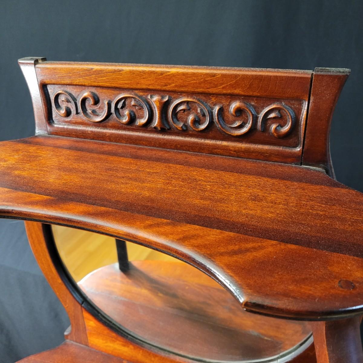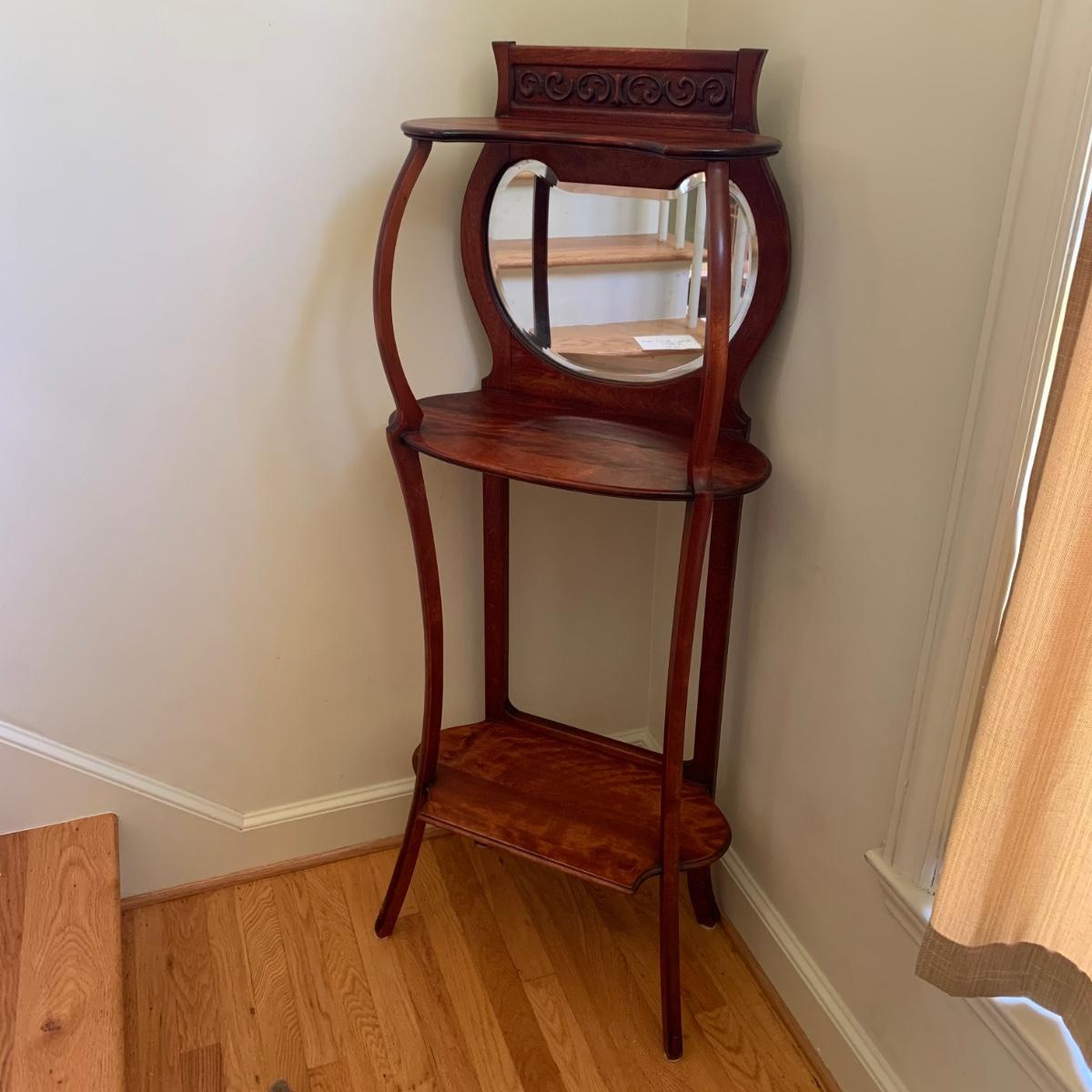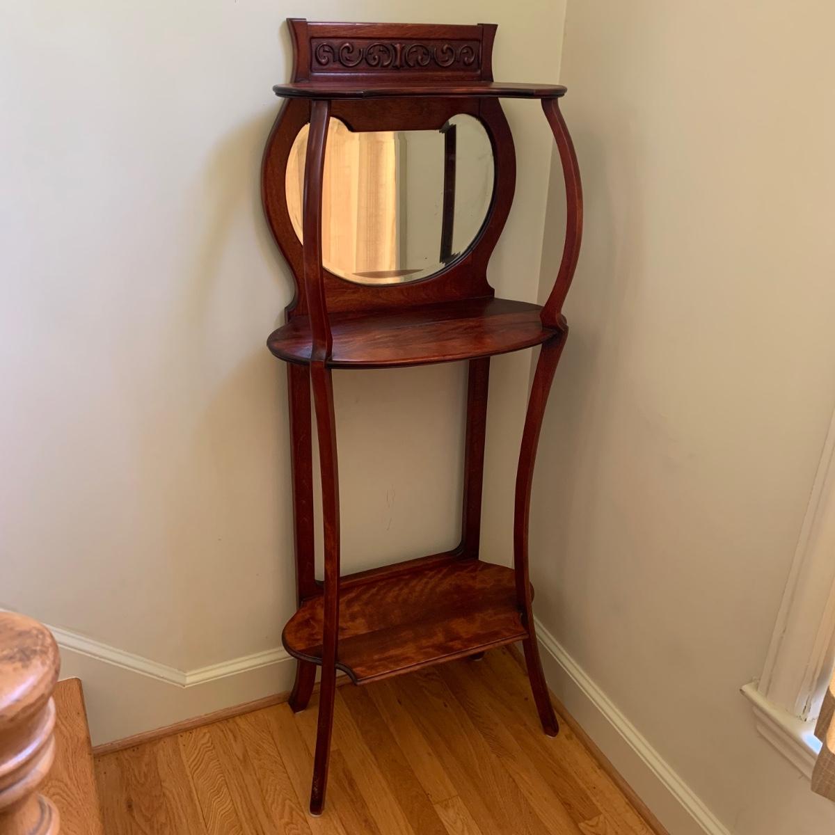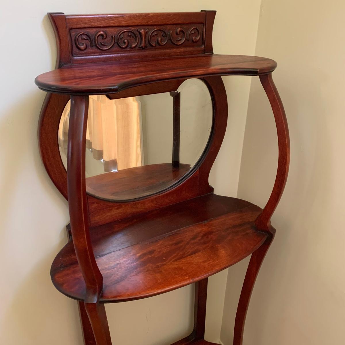 A beautiful antique accent shelf in good condition with no notable scratches, but the upper shelf does have a few blemishes and a crack from the wood splitting at a seam. See attached pictures for more detail. This piece features a beveled mirror and a beautiful dark stain and carved details at the top. Measures approximately 21" x 11" x 53". Local pickup only