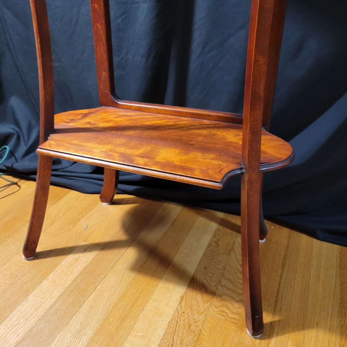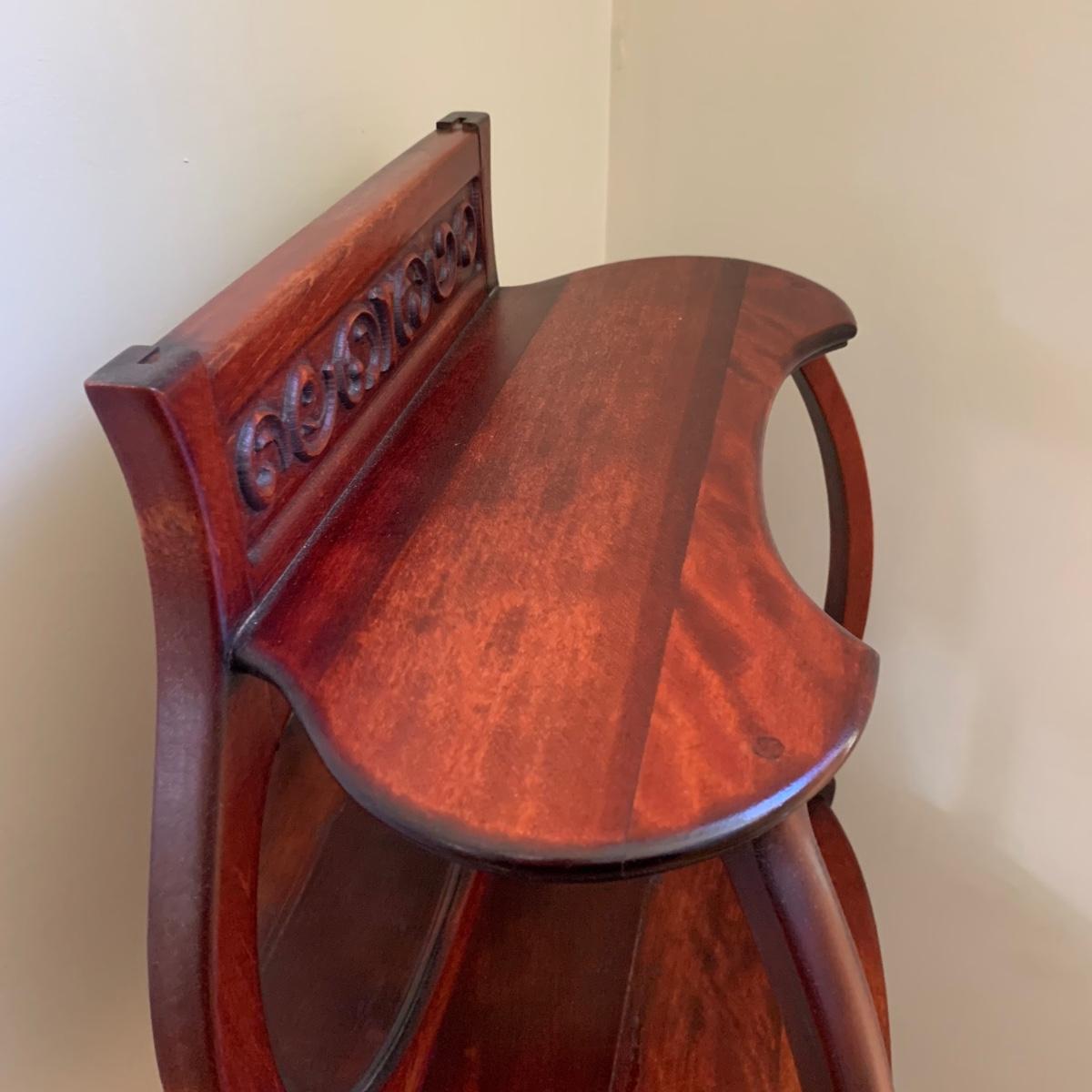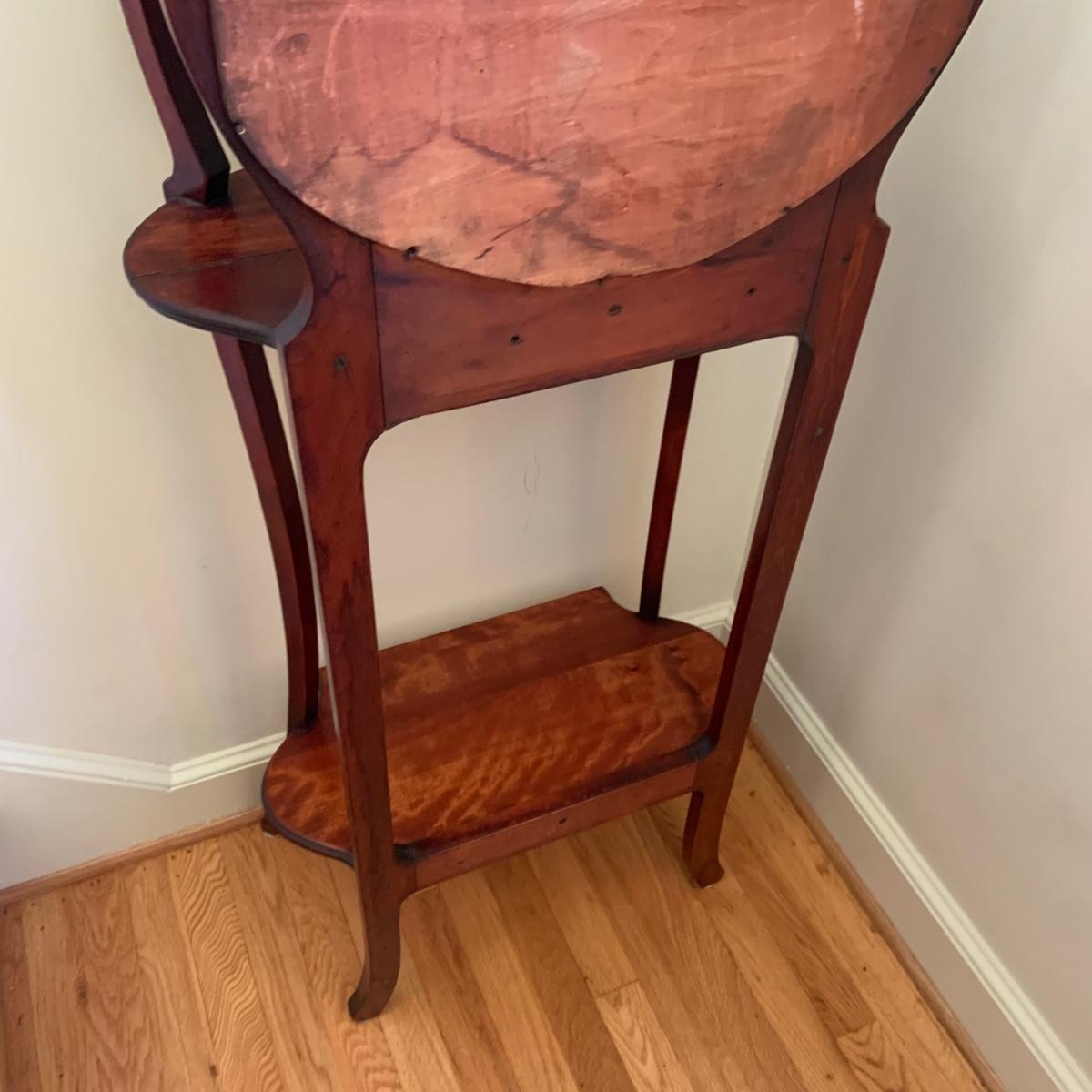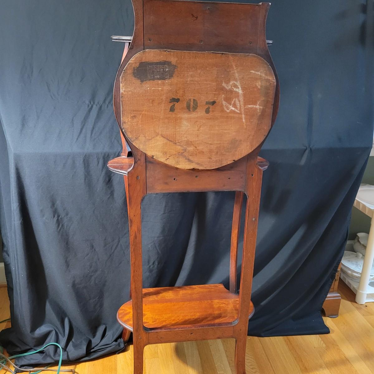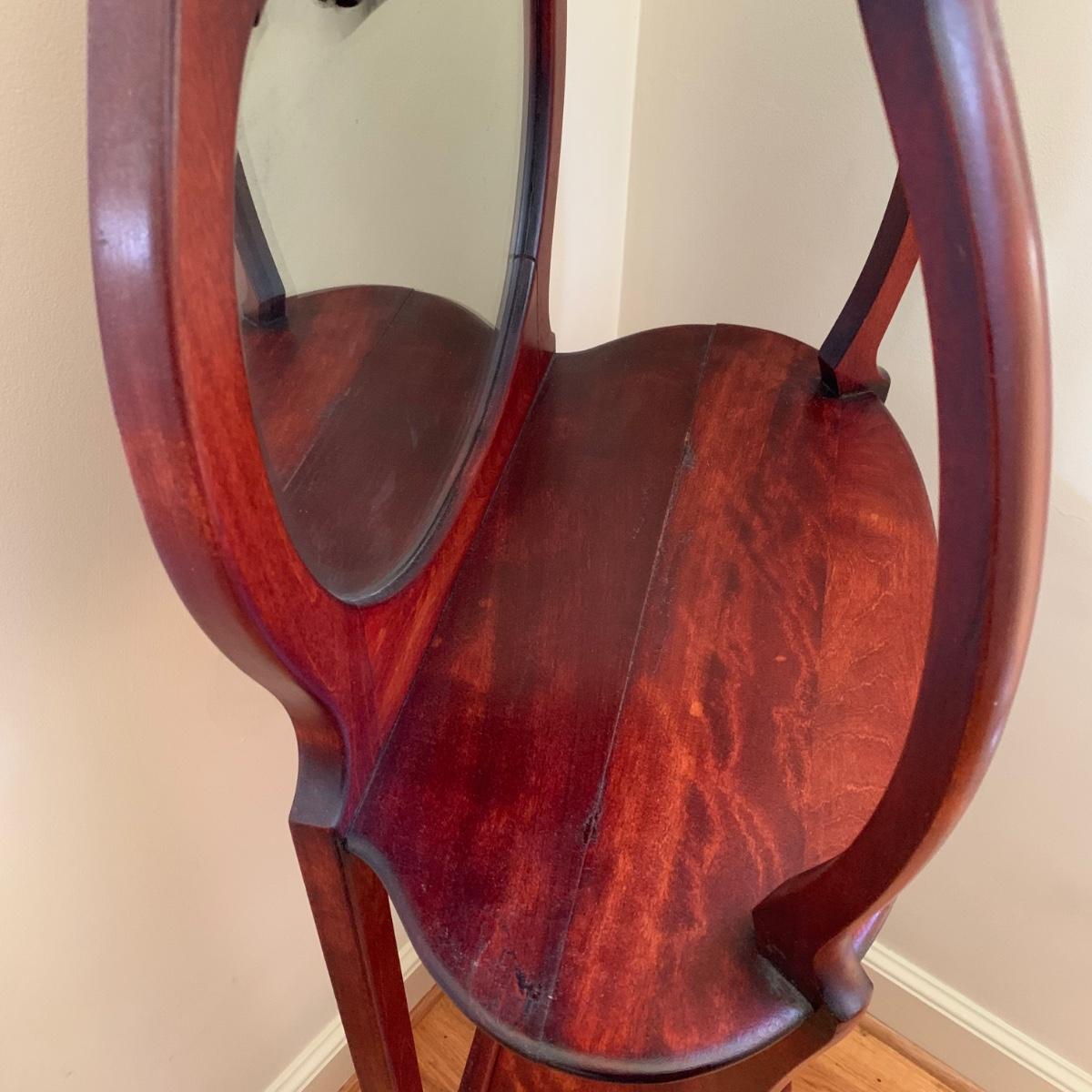A beautiful antique accent shelf in good condition with no notable scratches, but the upper shelf does have a few blemishes and a crack from the wood splitting at a seam. See attached pictures for more detail. This piece features a beveled mirror and a beautiful dark stain and carved details at the top. Measures approximately 21" x 11" x 53". Local pickup only