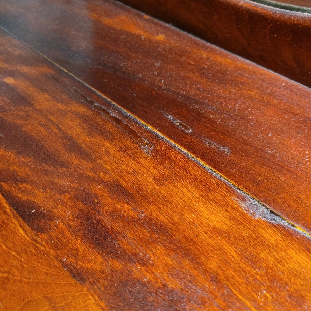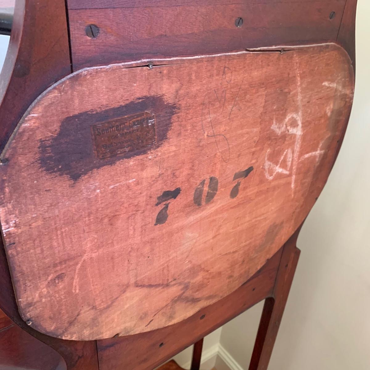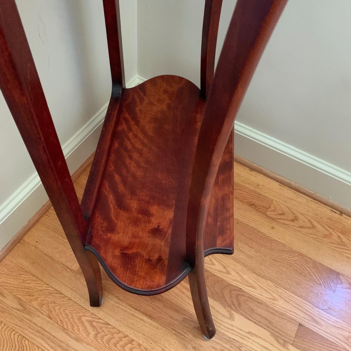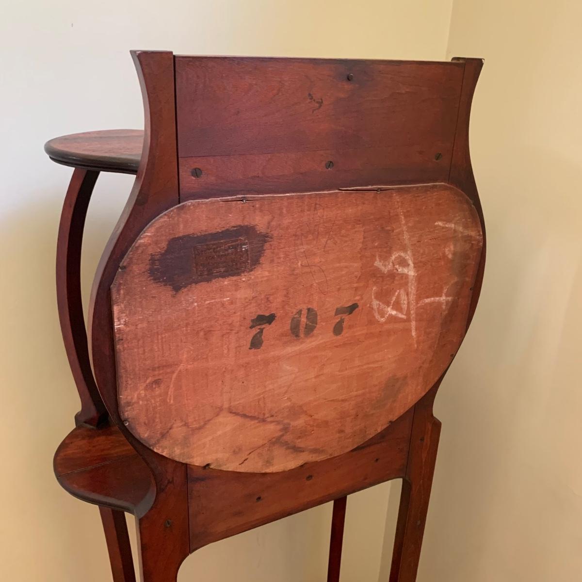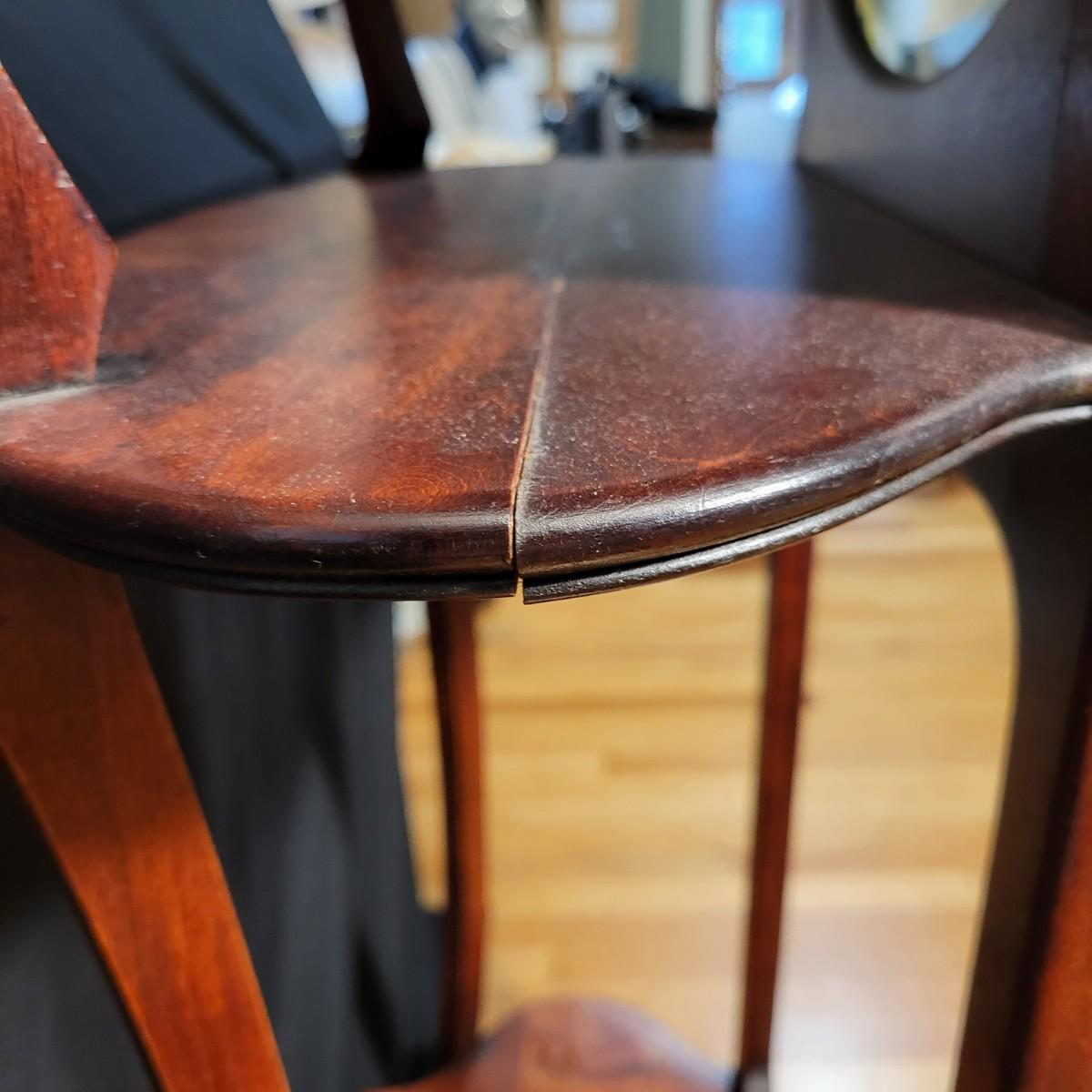 A beautiful antique accent shelf in good condition with no notable scratches, but the upper shelf does have a few blemishes and a crack from the wood splitting at a seam. See attached pictures for more detail. This piece features a beveled mirror and a beautiful dark stain and carved details at the top. Measures approximately 21" x 11" x 53". Local pickup only