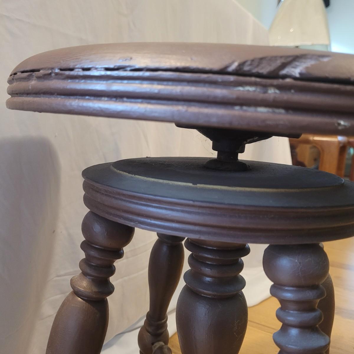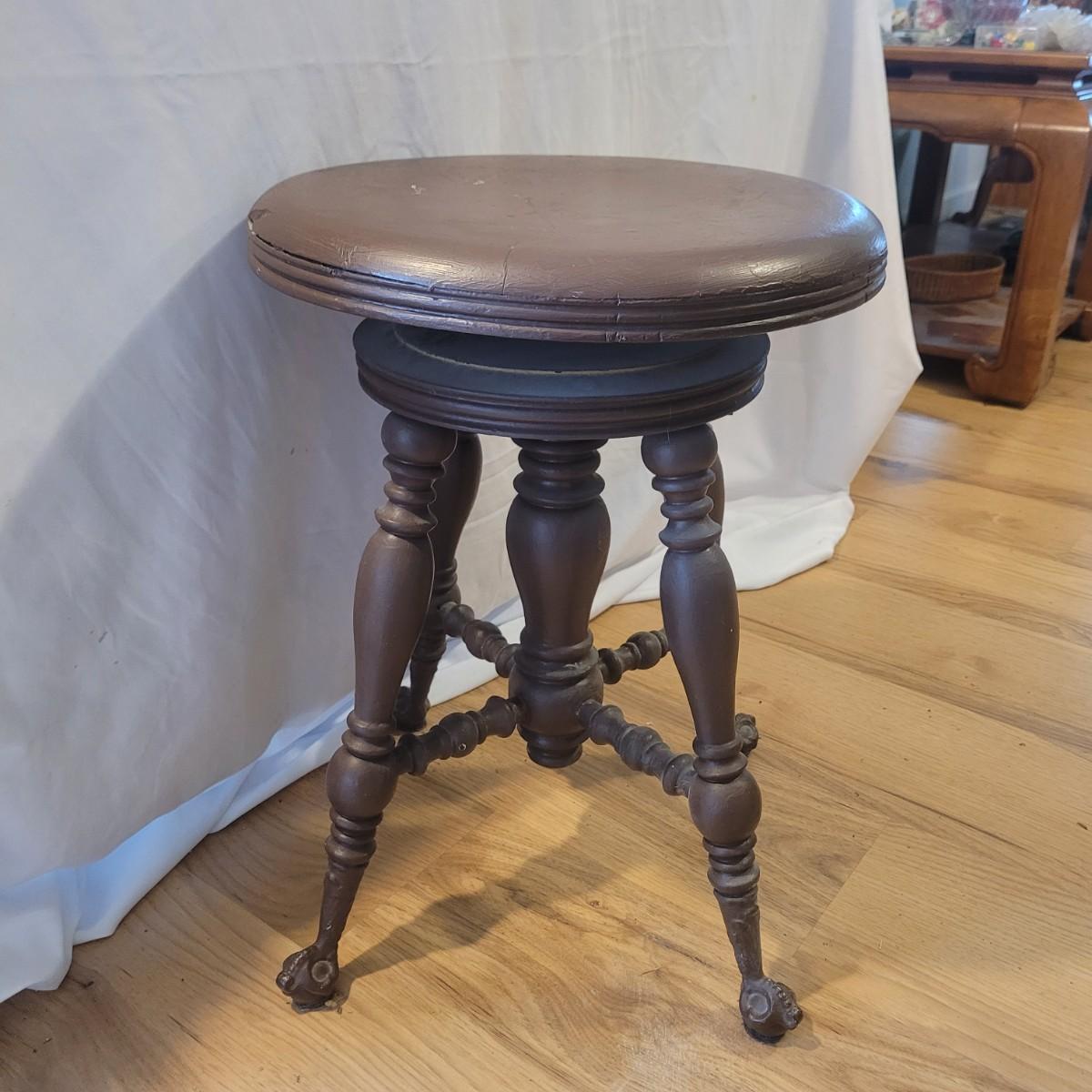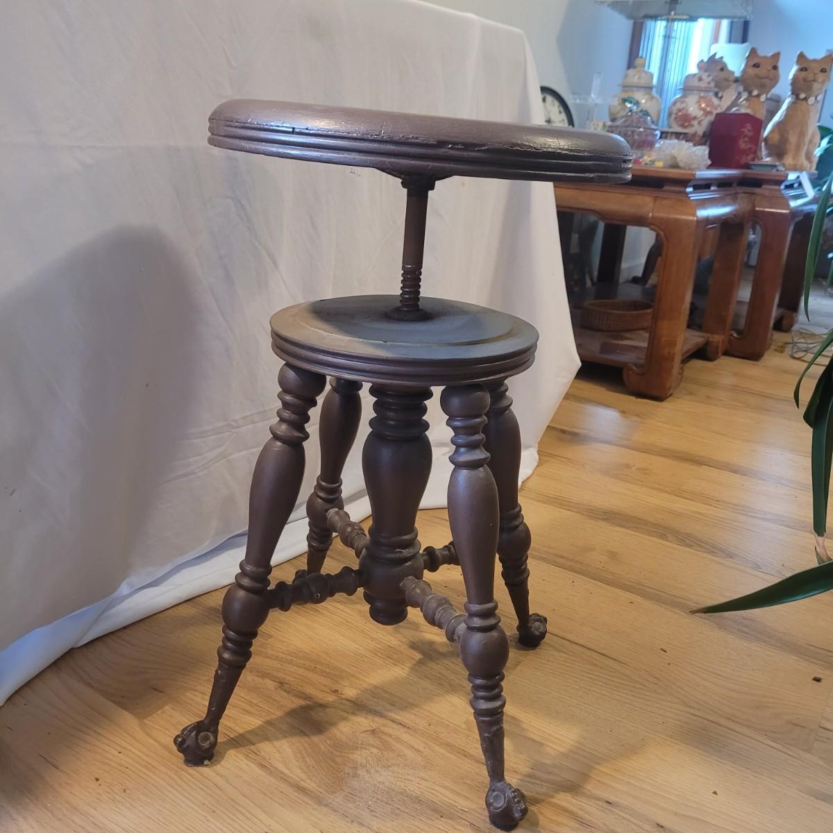 This antique wooden claw foot piano stool has a screw jack adjustable height to approximately 23”H. At lowest height, measures approximately 15” x 20”H. Screw is loud when adjusting, needs some lubricant. Local pick up only.