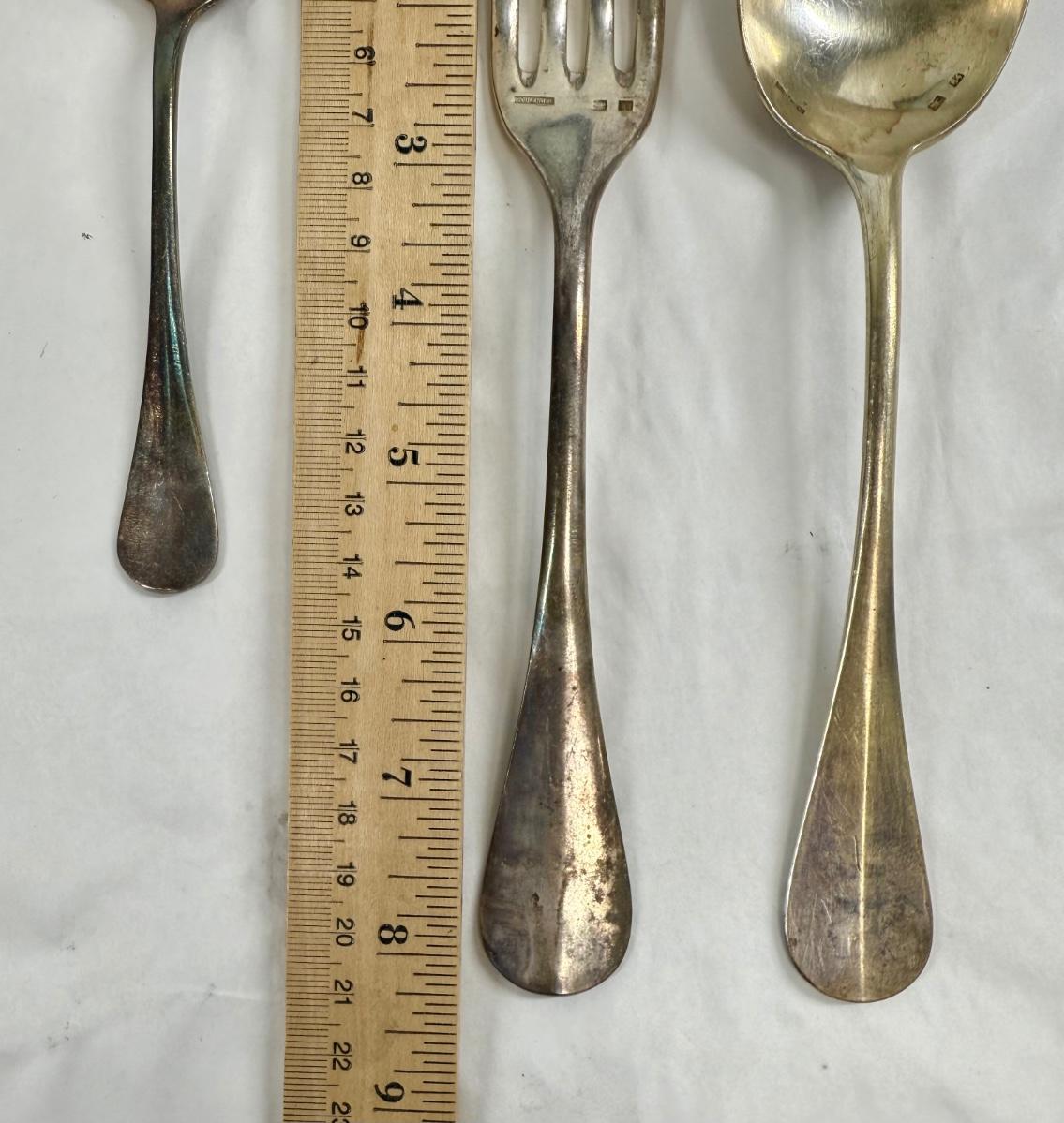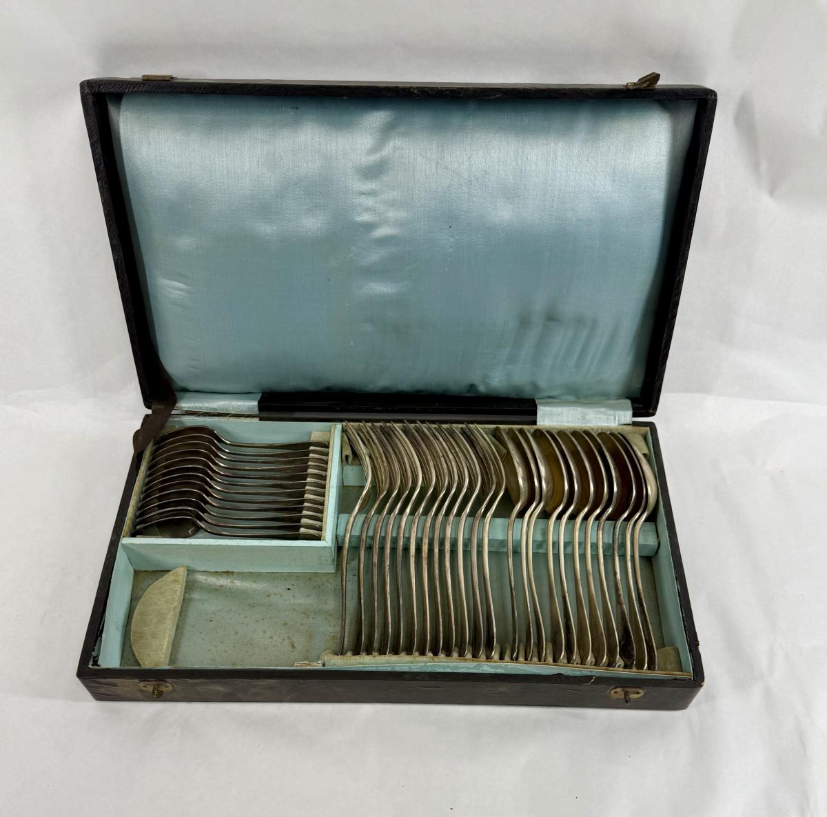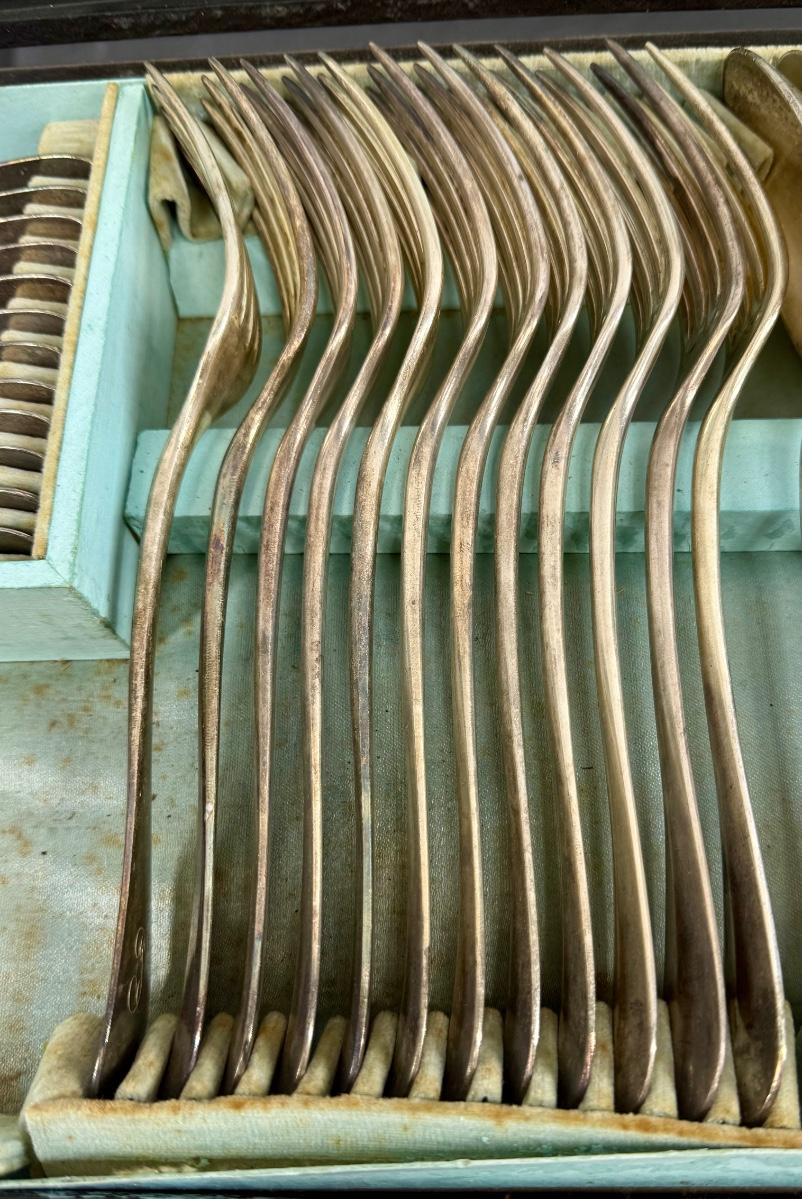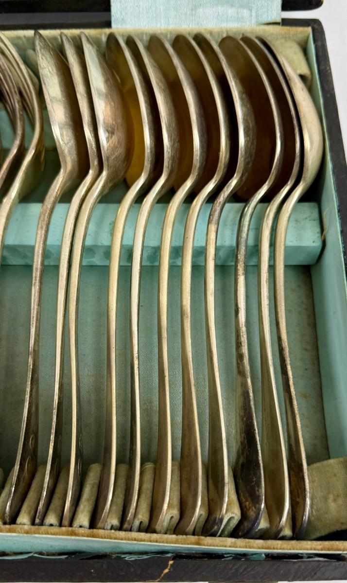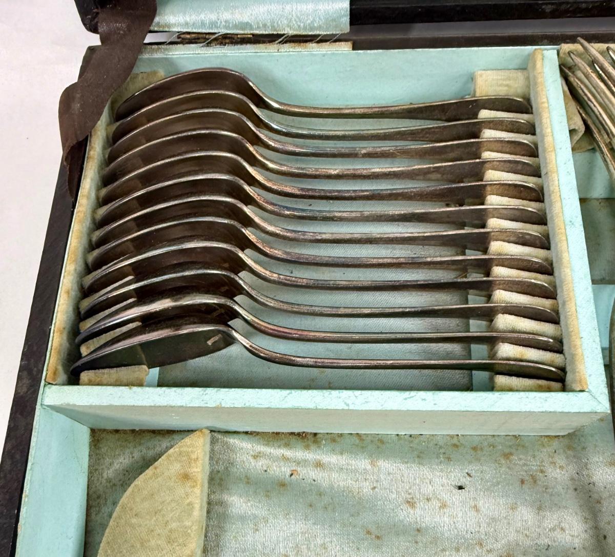 Set includes 12 teaspoons, 12 forks and 11 soup spoons. Teasons have the “18” mark , means that 12 items were plated with 18g of silver. Forks and soup spoons are marked “84”, means 12 items were plated using 84g of silver. In original lidded box, some stains on the pale blue satin liner.