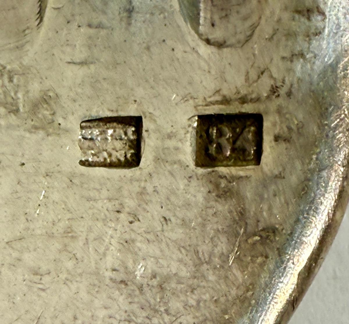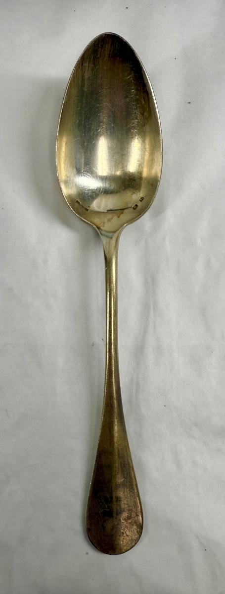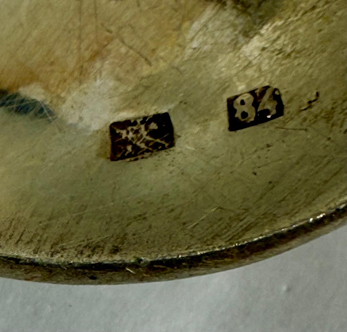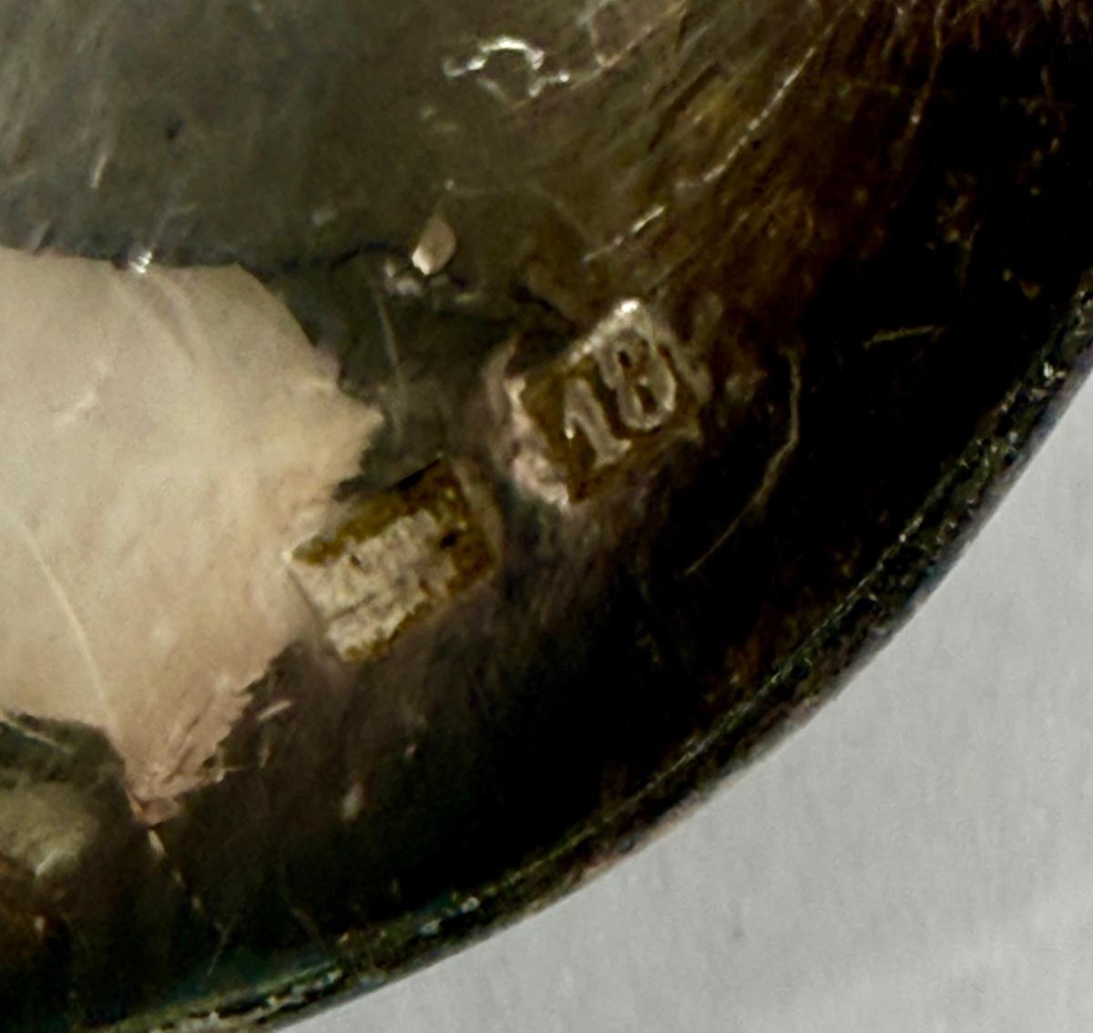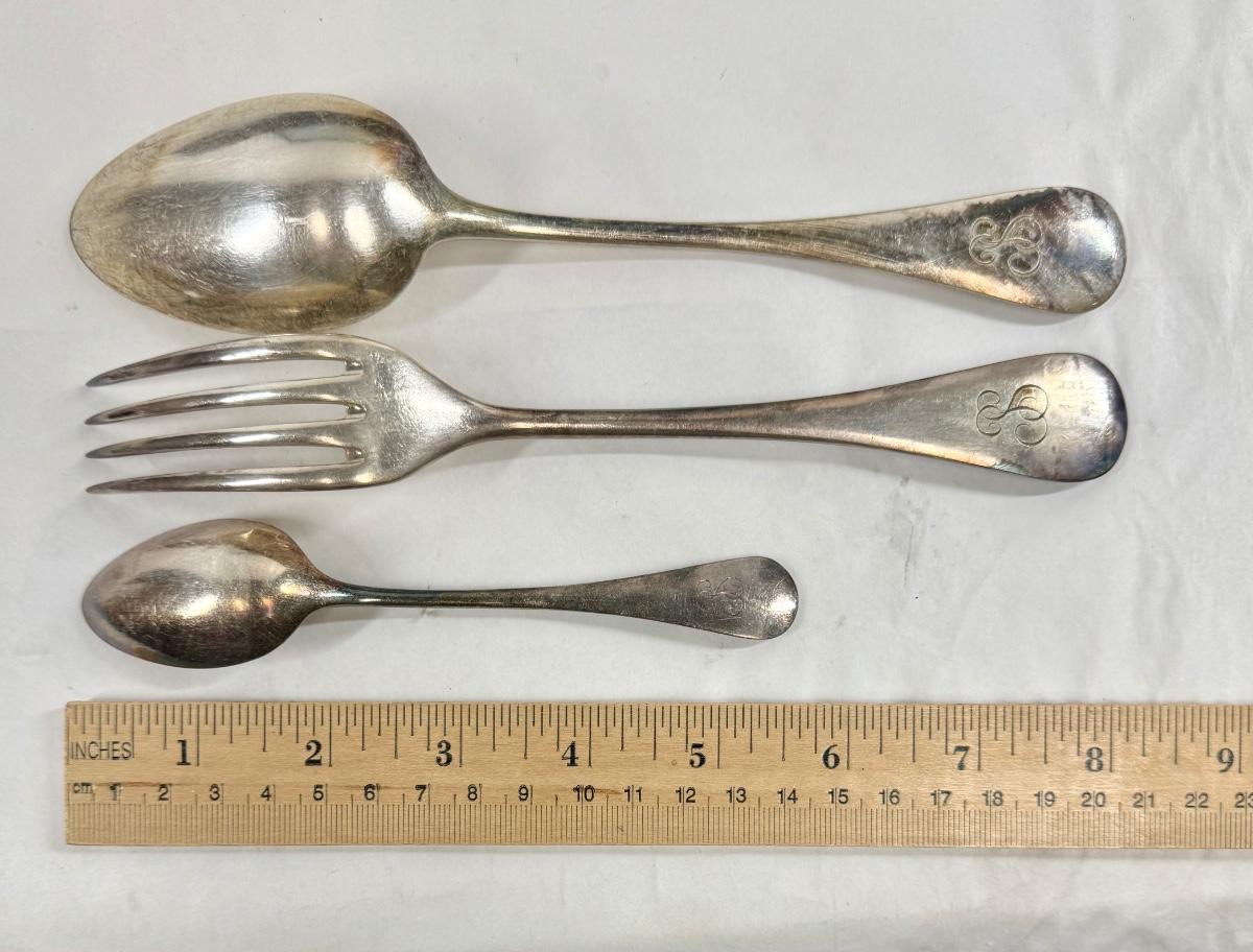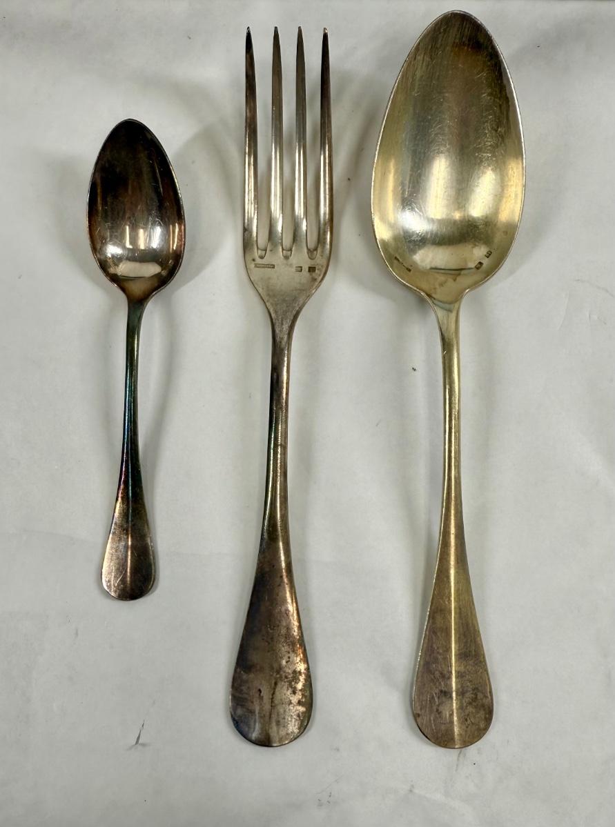 Set includes 12 teaspoons, 12 forks and 11 soup spoons. Teasons have the “18” mark , means that 12 items were plated with 18g of silver. Forks and soup spoons are marked “84”, means 12 items were plated using 84g of silver. In original lidded box, some stains on the pale blue satin liner.