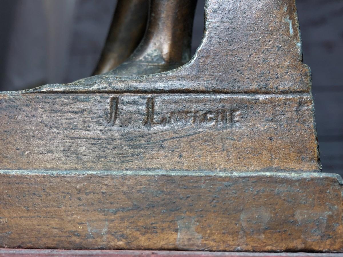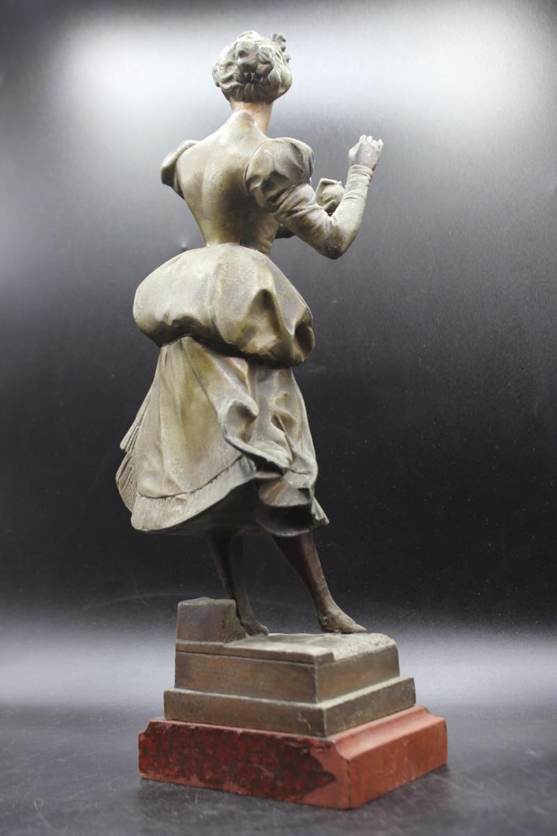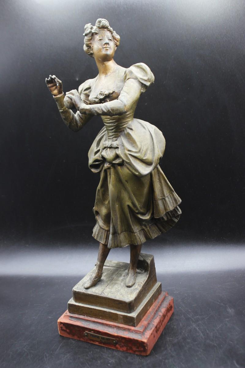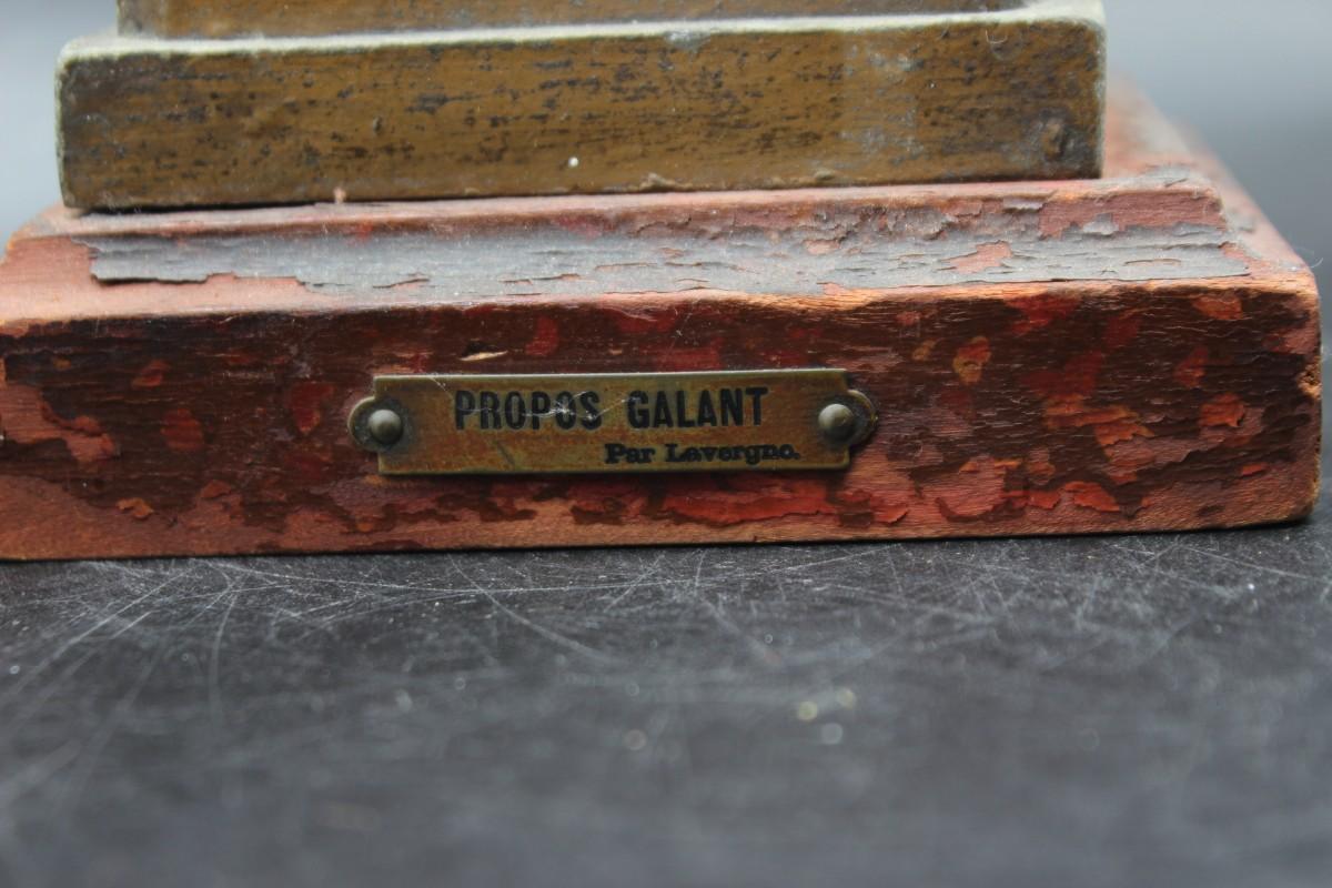Antique Adolphe Jean Lavergne Propos Galant French Art Nouveau Statue in Calamine with Bronze Patina, there is no significant chips or cracks to the statue and is in good displayable condition. The paint on the wooden base is chipping off, check pictures for more details and for sizing.