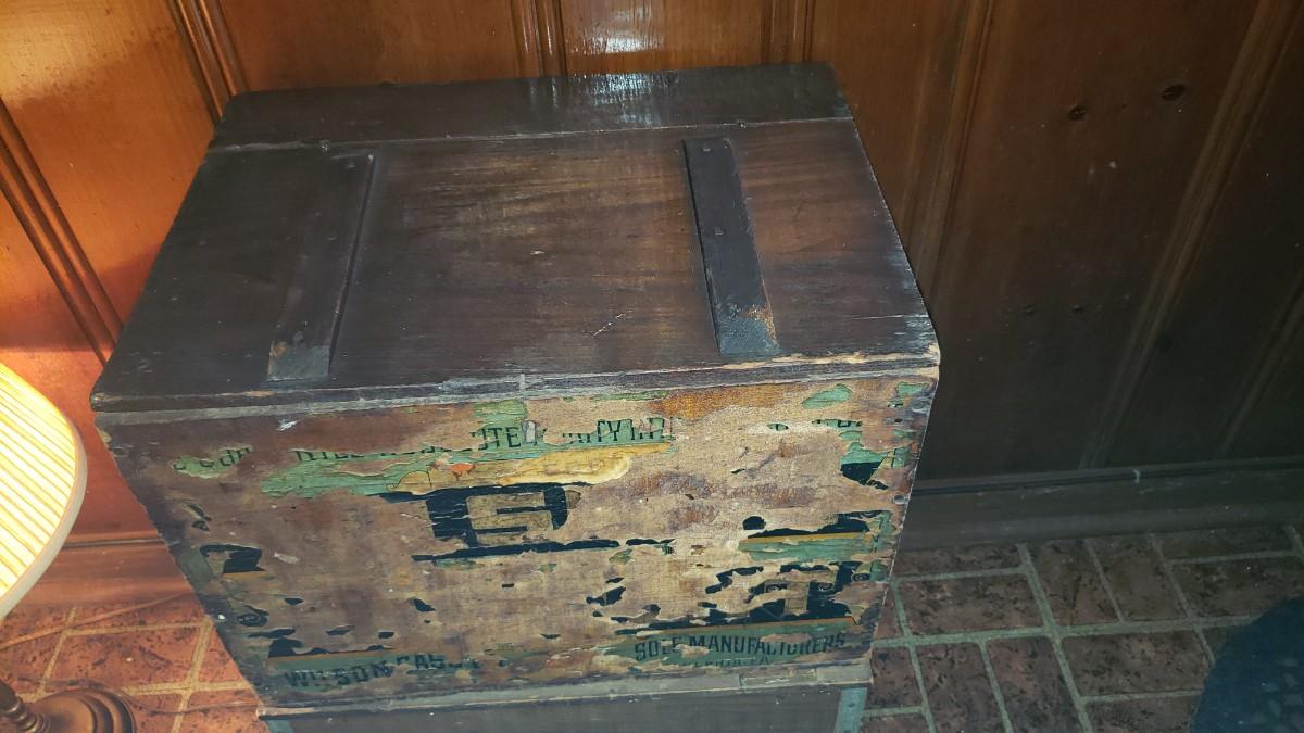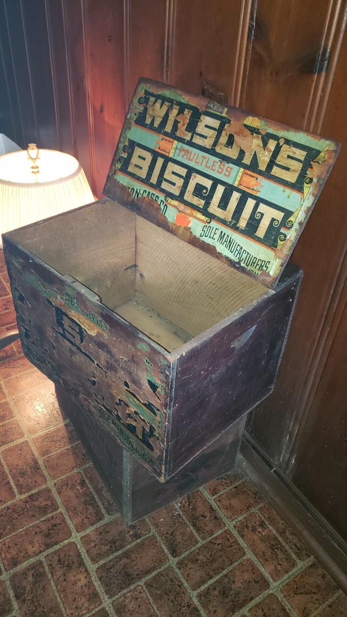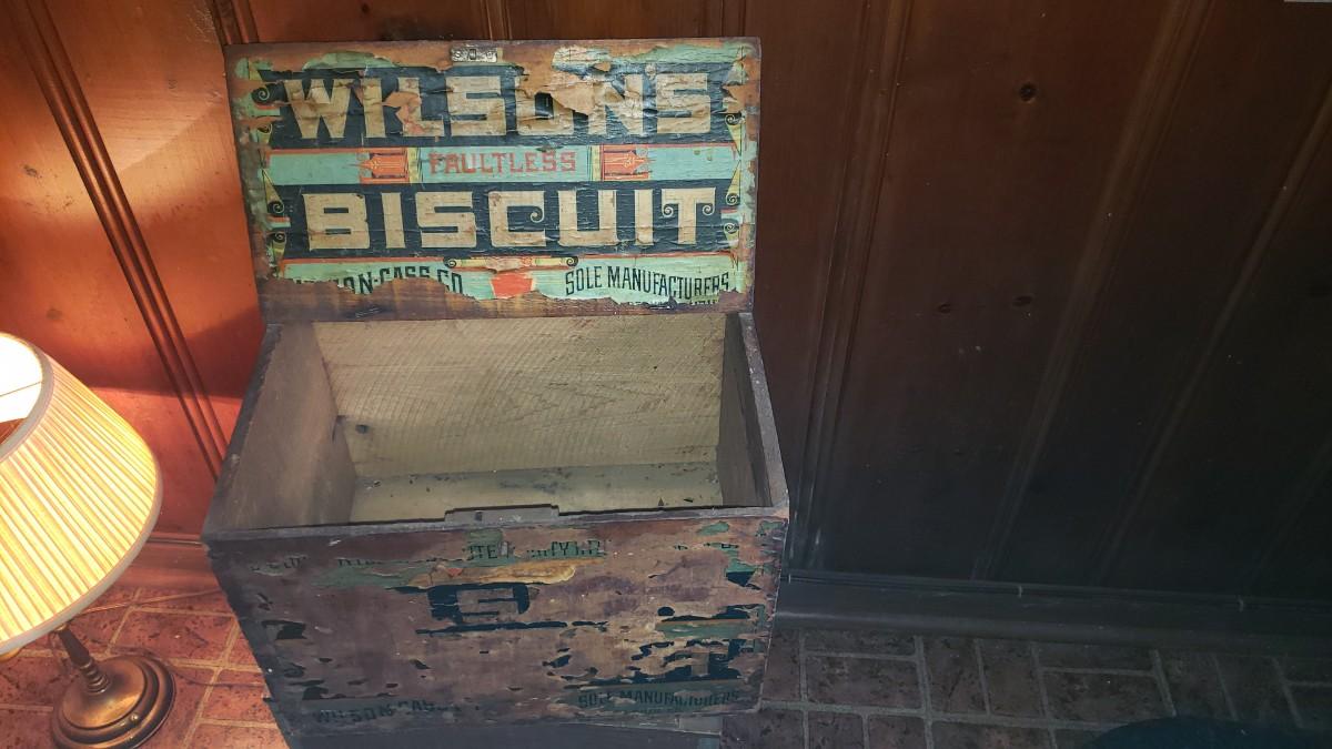 Antique advertising biscuit crate with hinged top