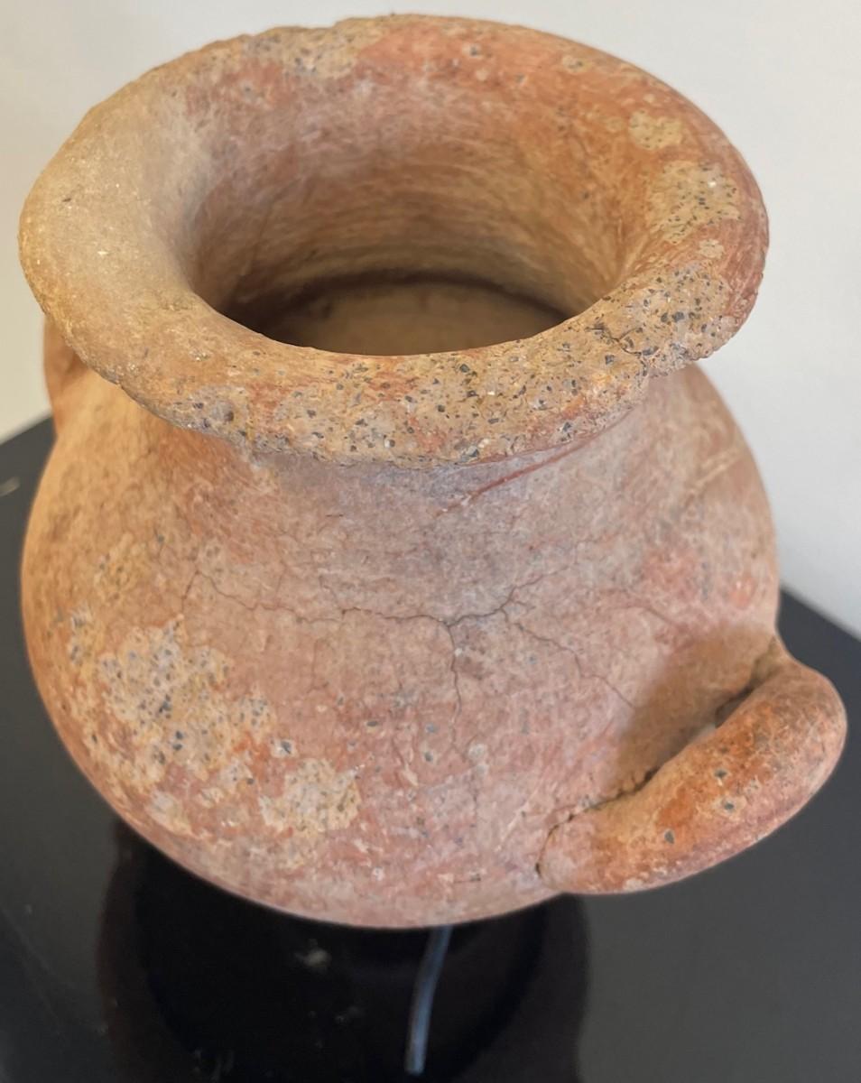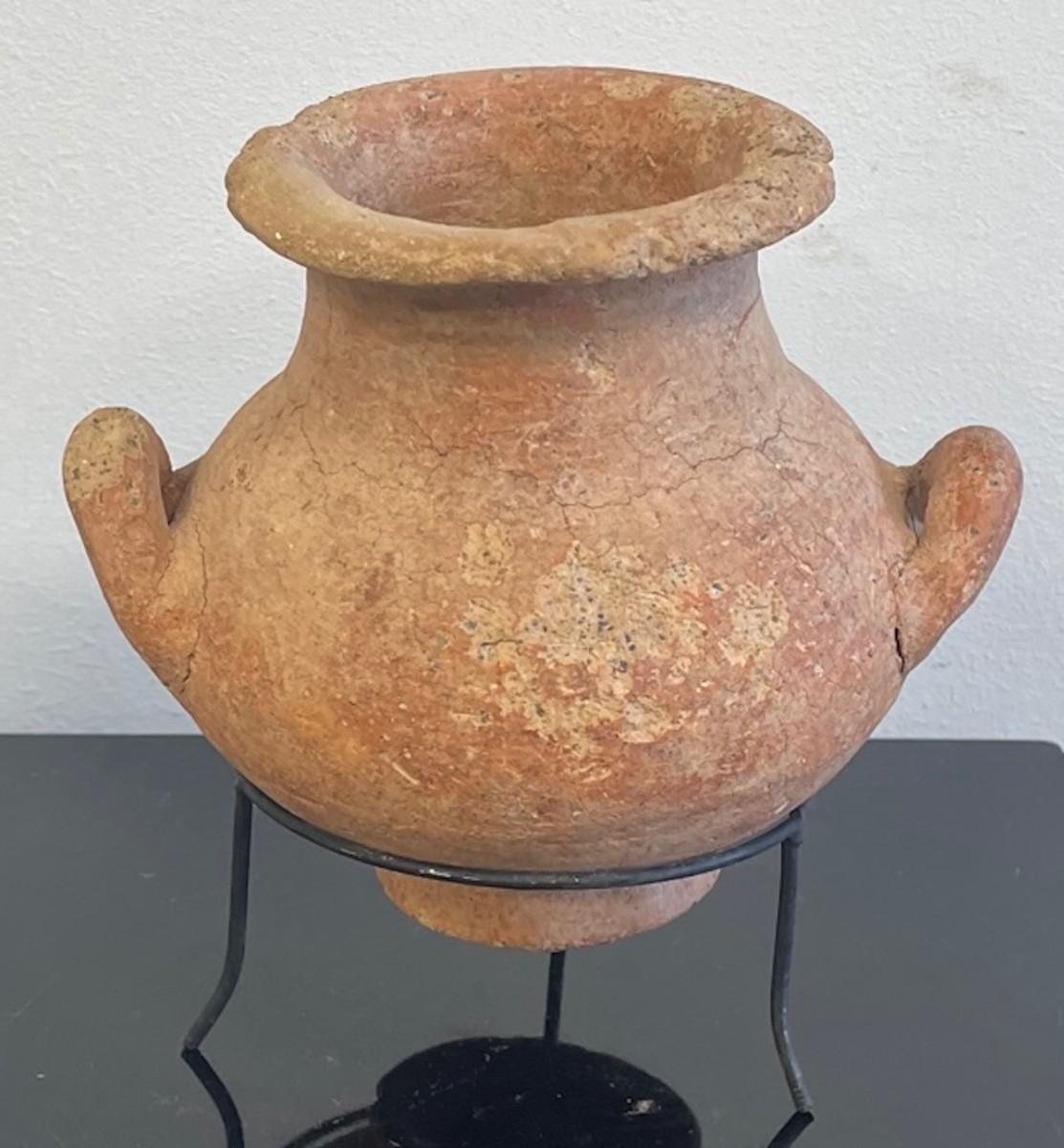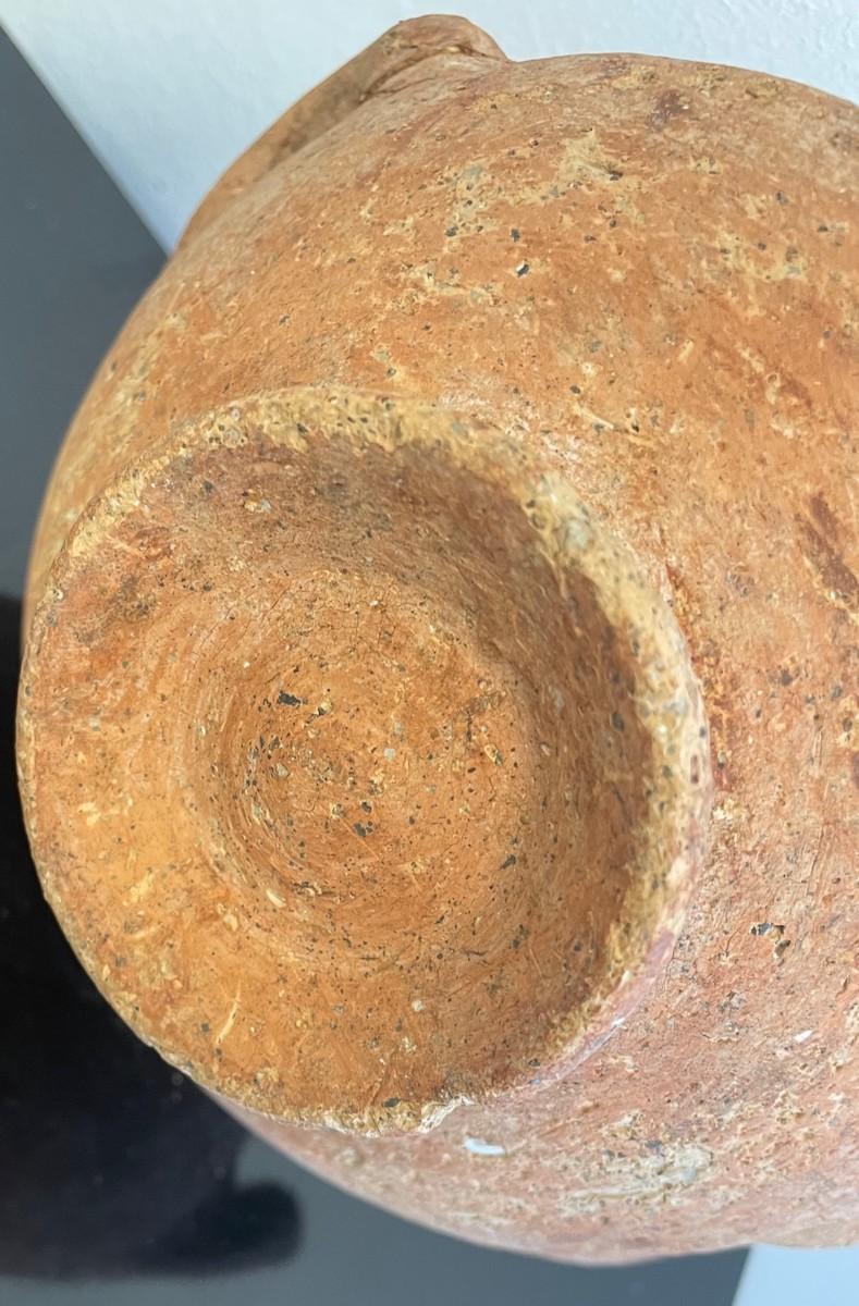 Description: Antique after Biblical handmade red ware amphora shaped jar pottery. Measurement approximate: 6"w x 5"h; Material: Red Clay