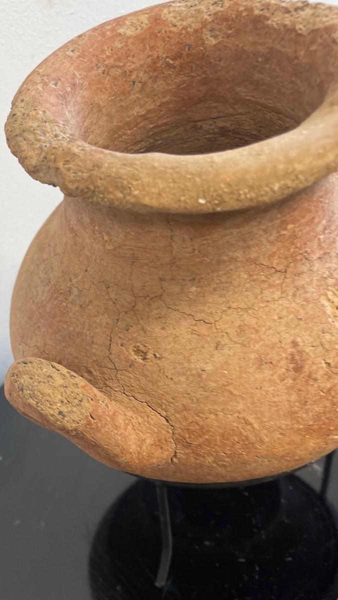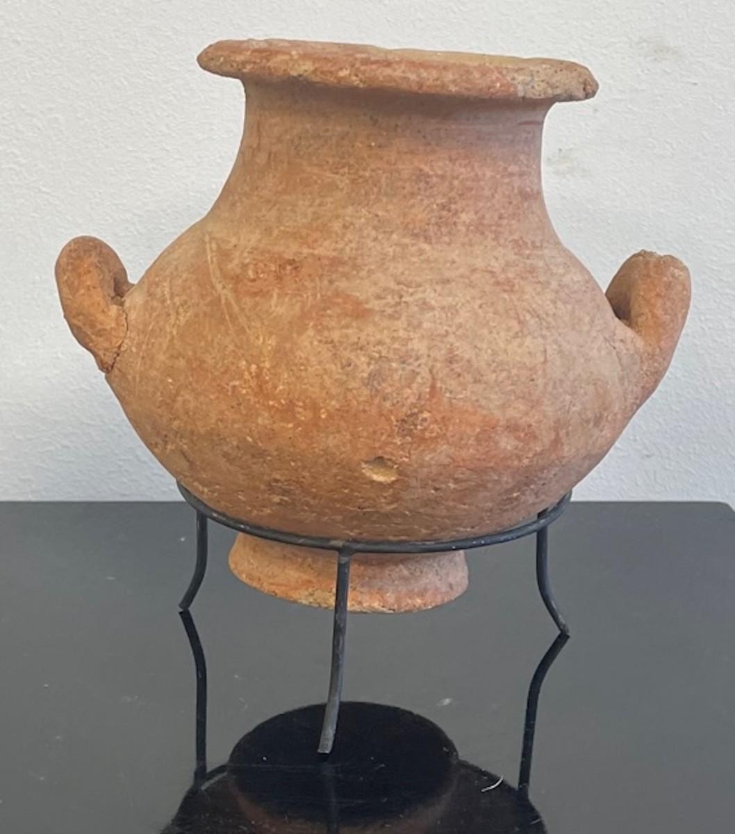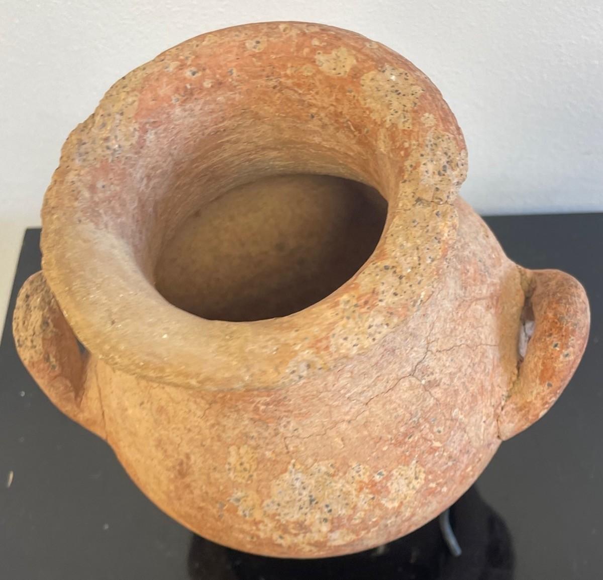 Description: Antique after Biblical handmade red ware amphora shaped jar pottery. Measurement approximate: 6"w x 5"h; Material: Red Clay