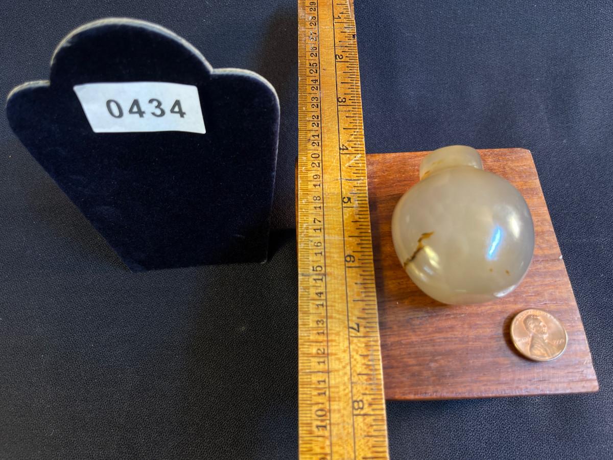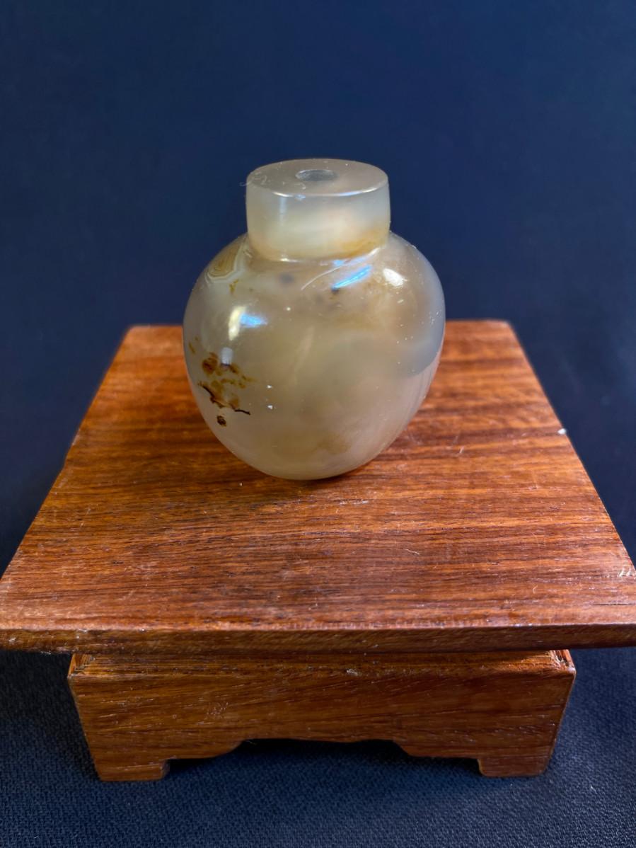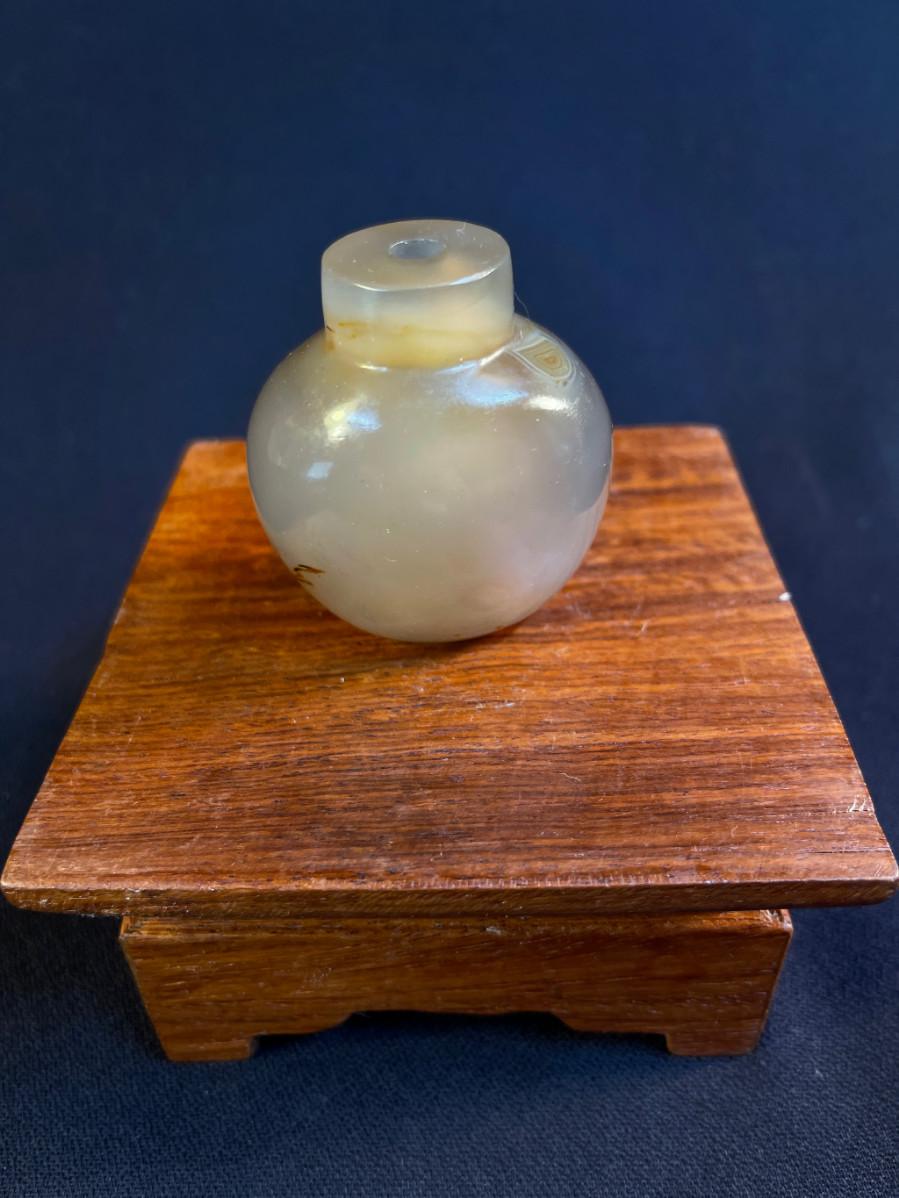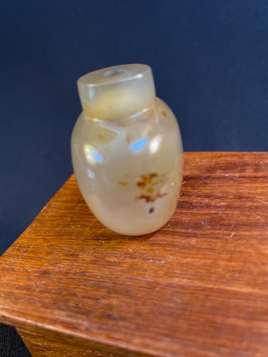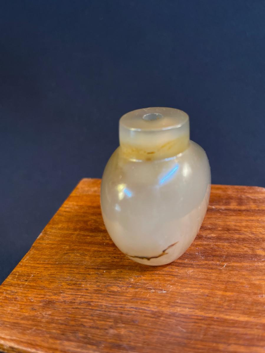 DESCRIPTION: This is an agate “pebble” snuff bottle carved from a single piece and hollowed out. The translucent creamy nature of the host stone makes the bottle glow! The few natural fissures in the stone add character and do not compromise the structural integrity of the bottle. There is no lid for the bottle.