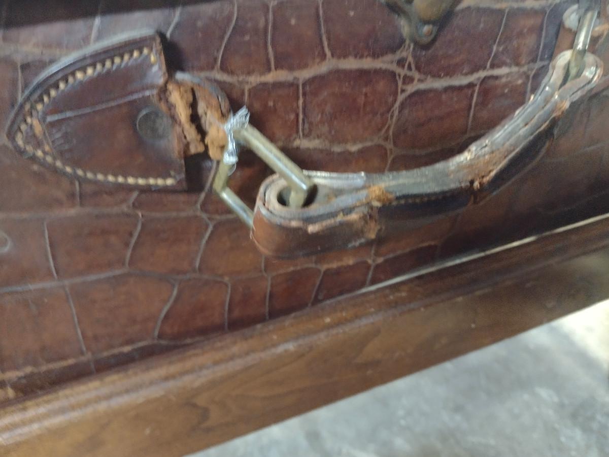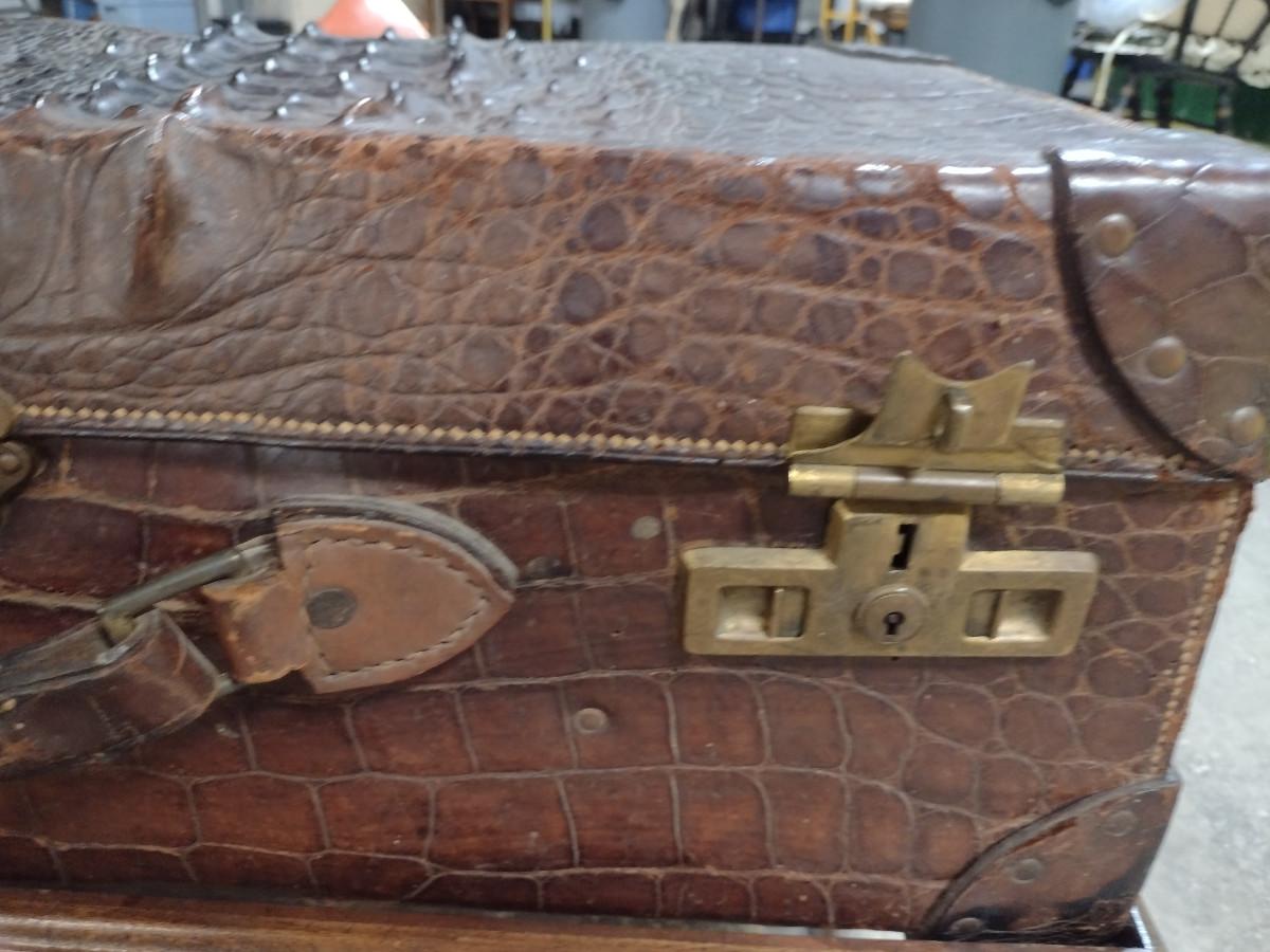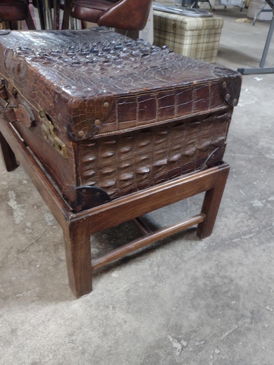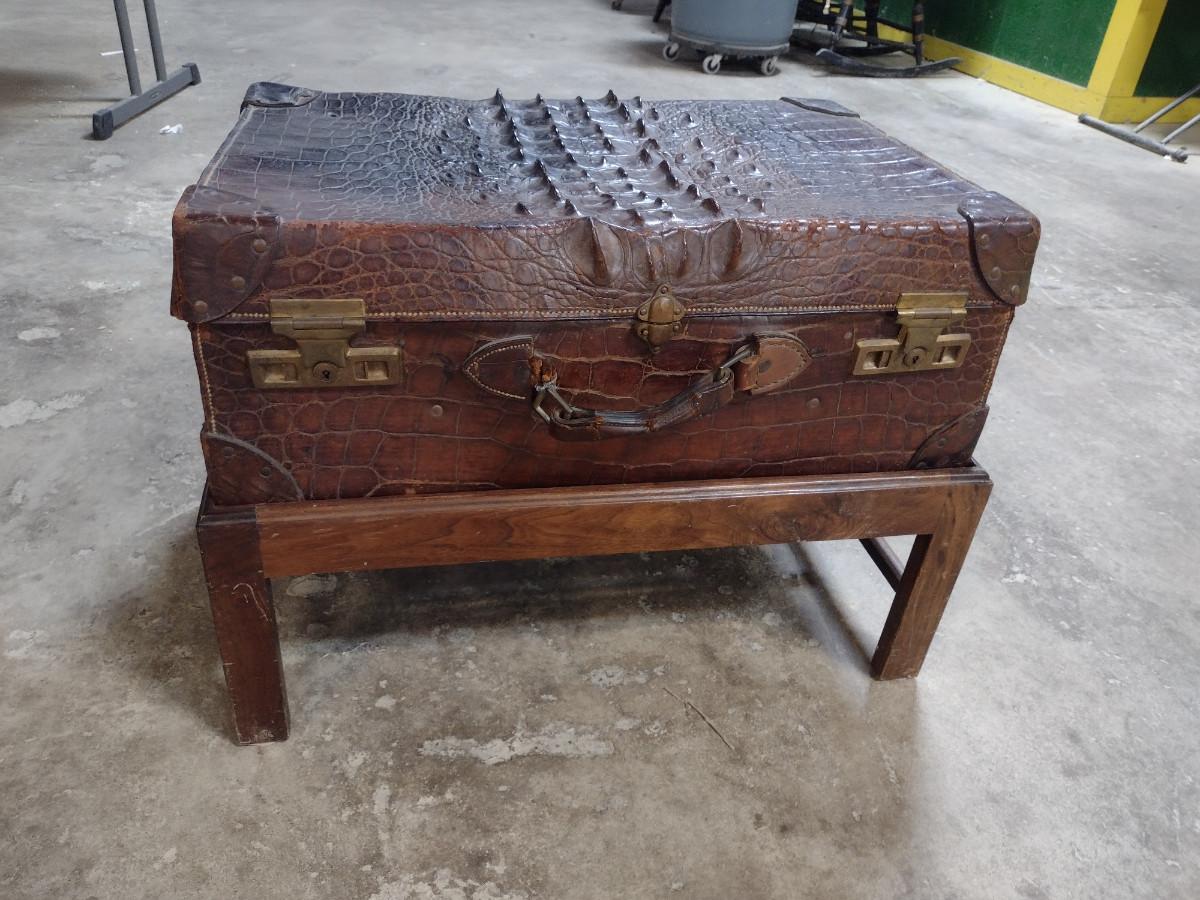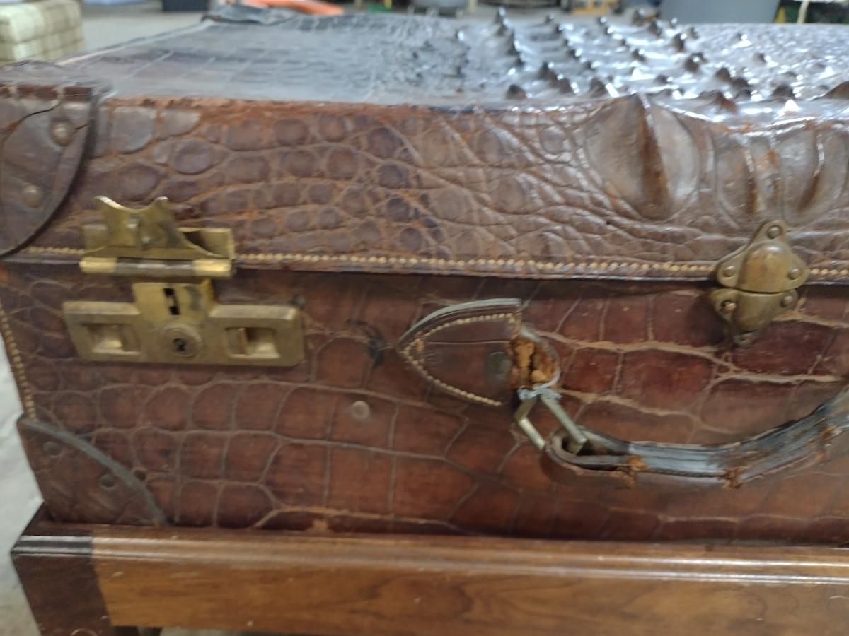 Antique Alligator Steamer Trunk with Wooden Base. Measures approx. Please see all pictures- handle will need to be repaired, some wear to finish, small hole in top.