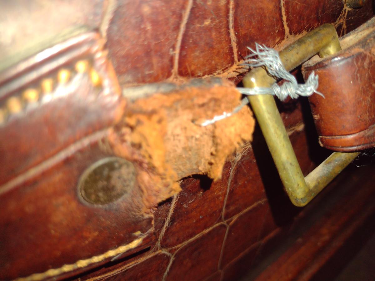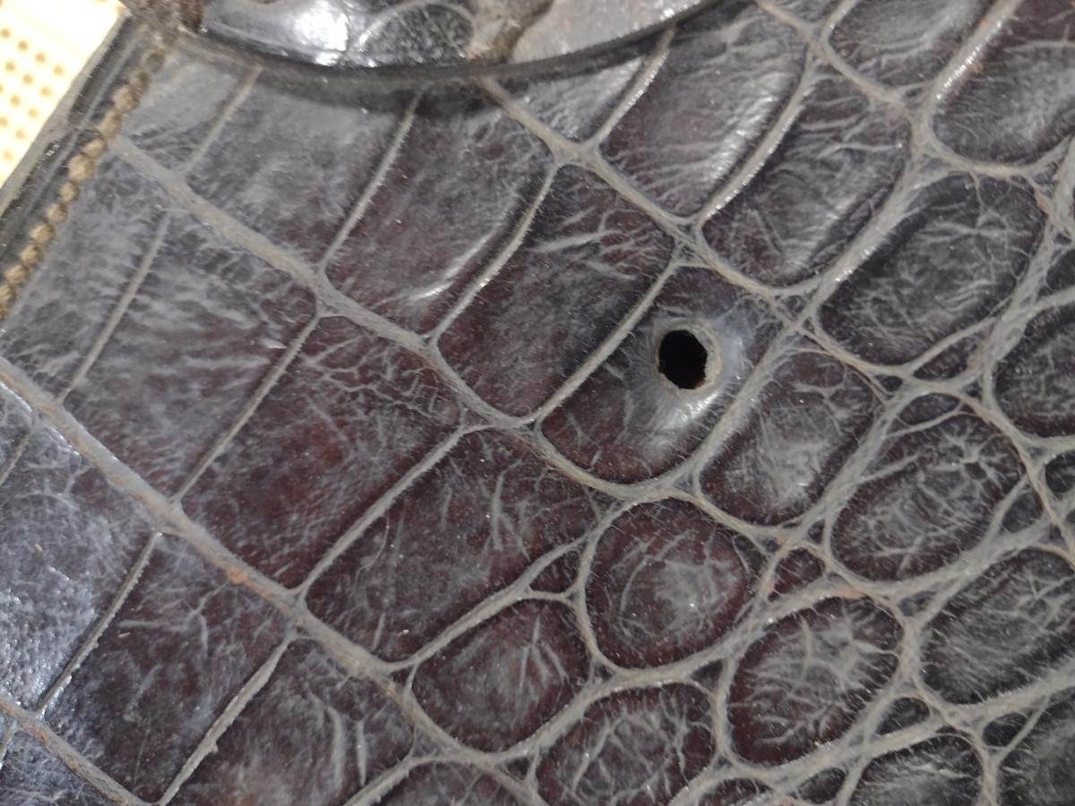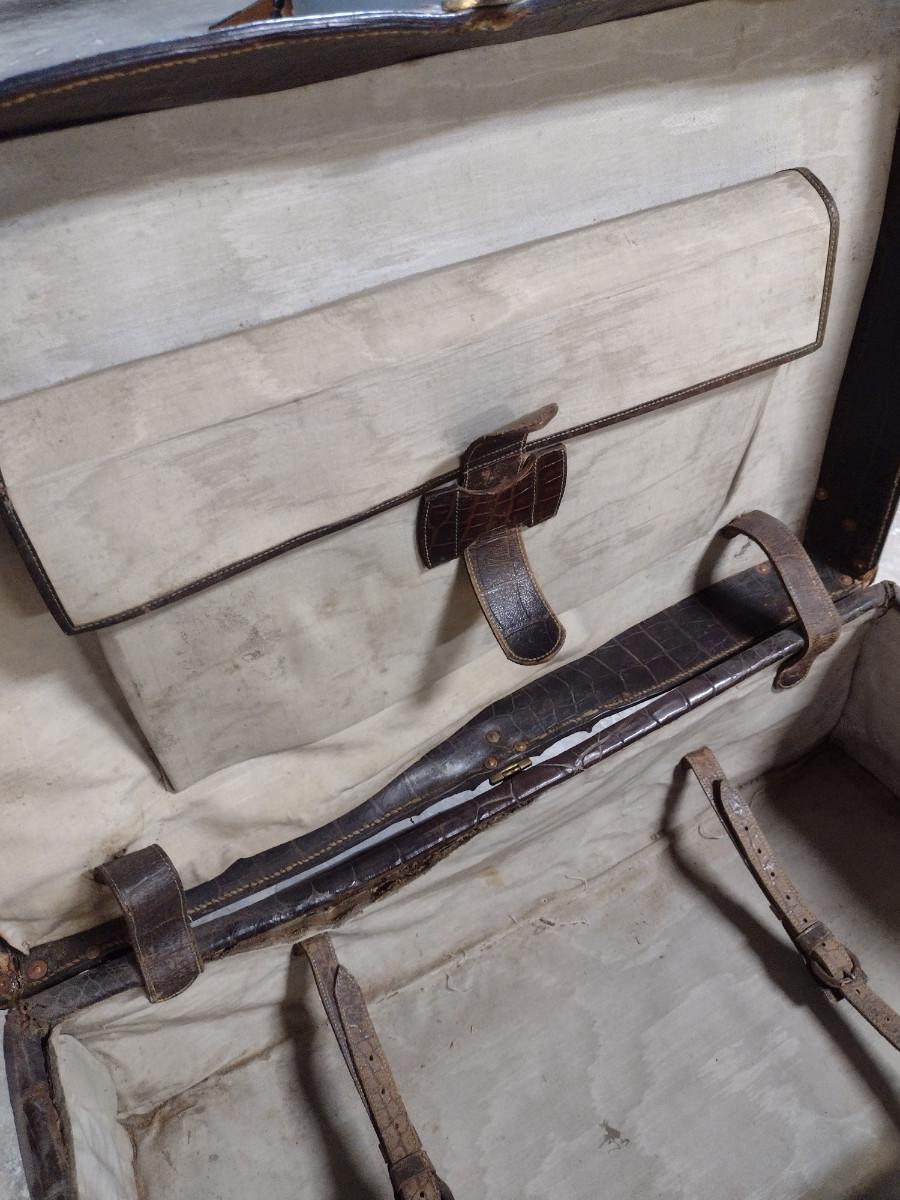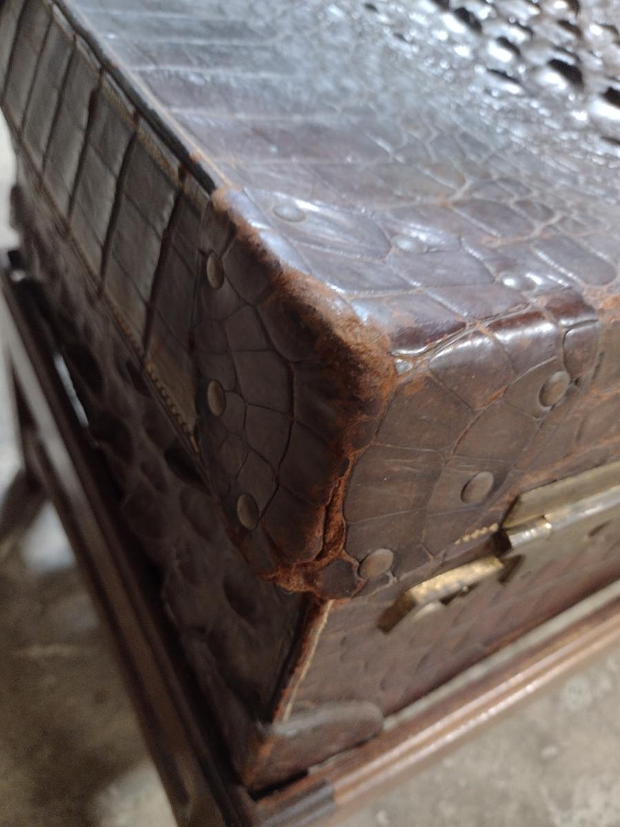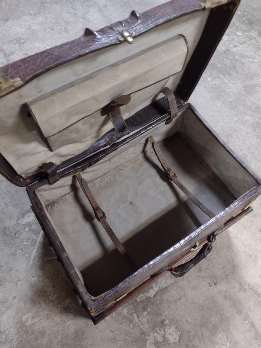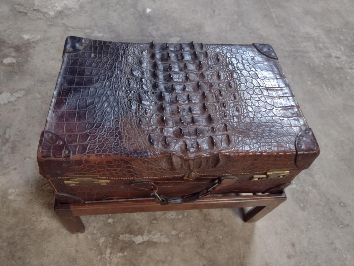 Antique Alligator Steamer Trunk with Wooden Base. Measures approx. Please see all pictures- handle will need to be repaired, some wear to finish, small hole in top.
