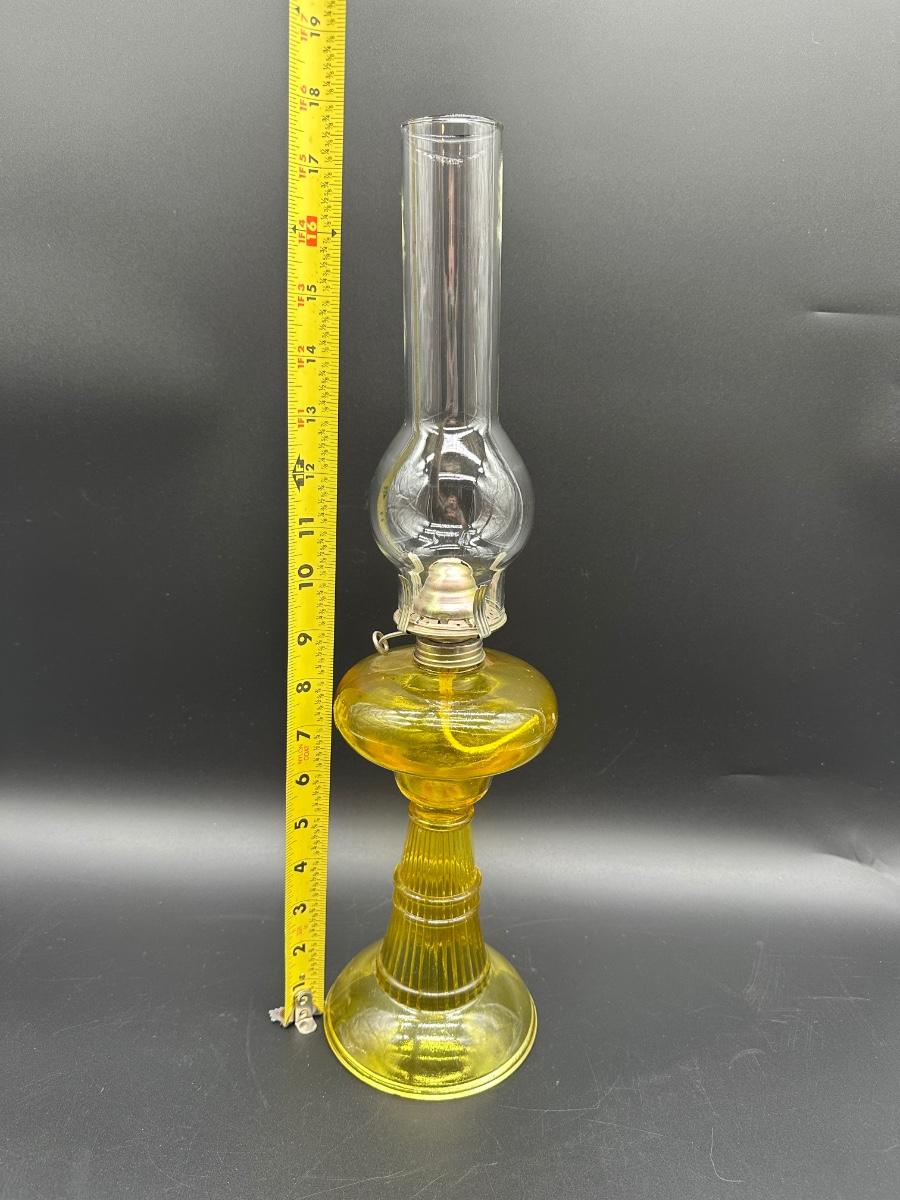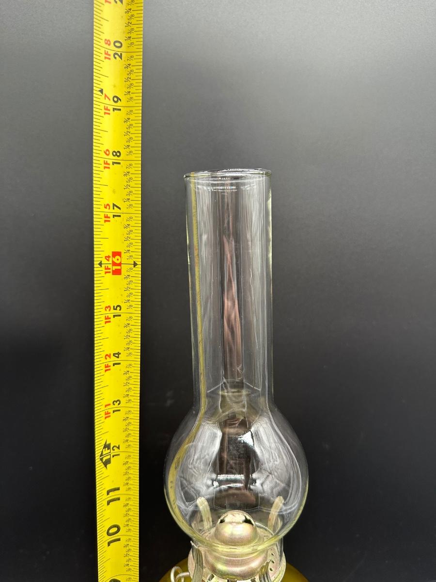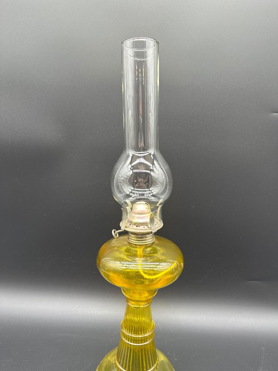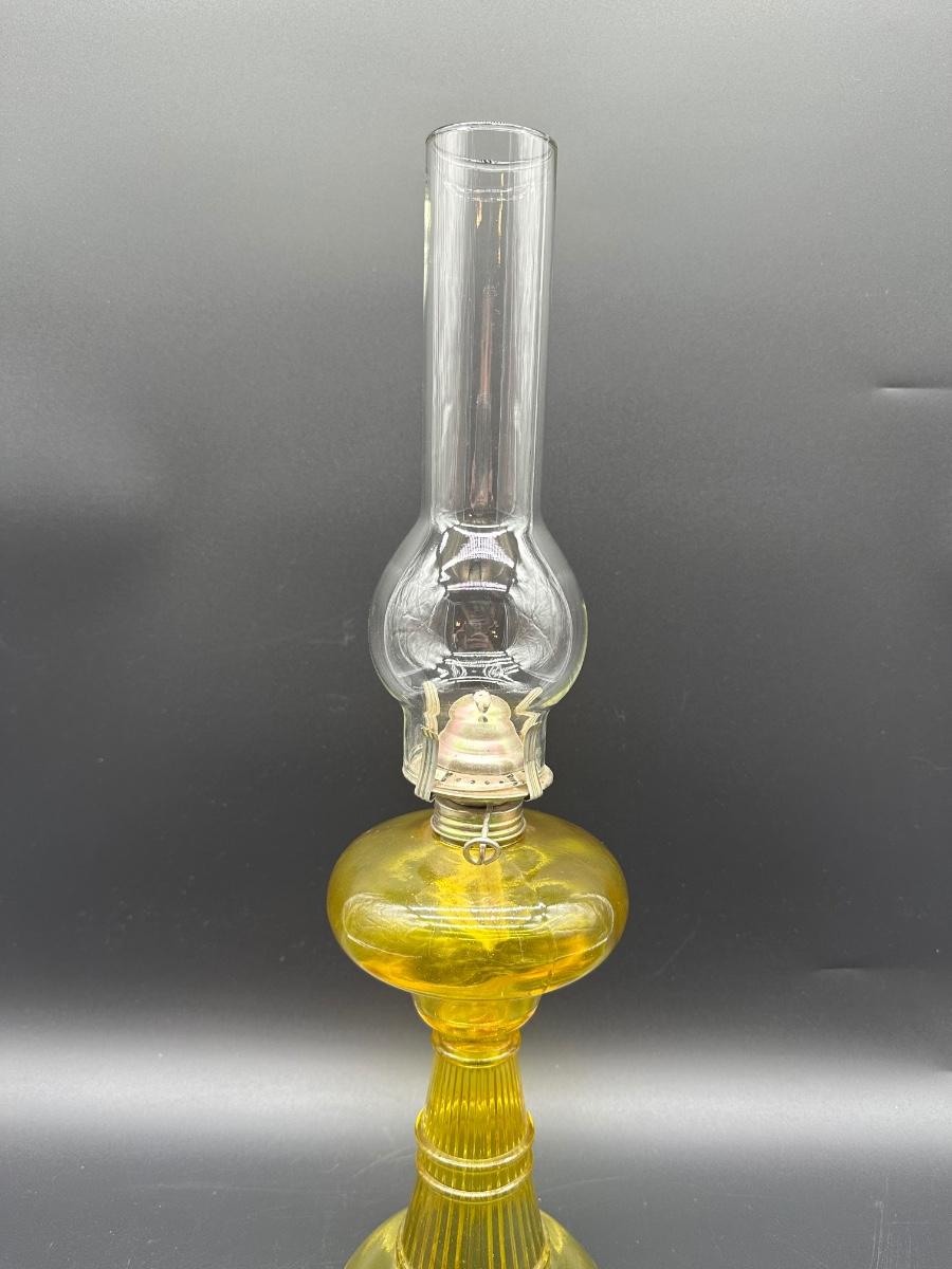 Amber Glass Kerosene Oil Lamp – Ribbed Stem Base w/ Clear Hurricane Chimney