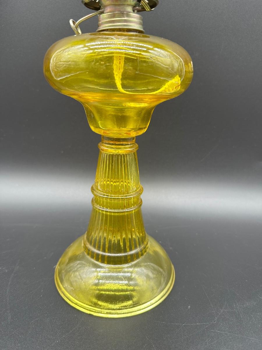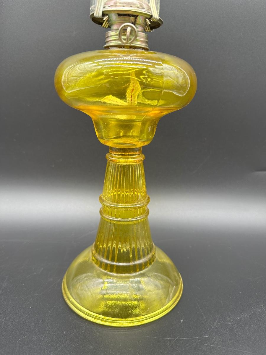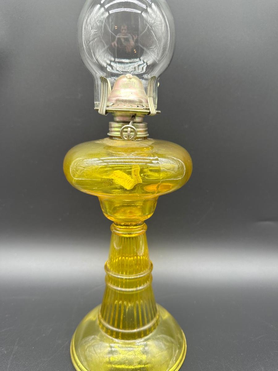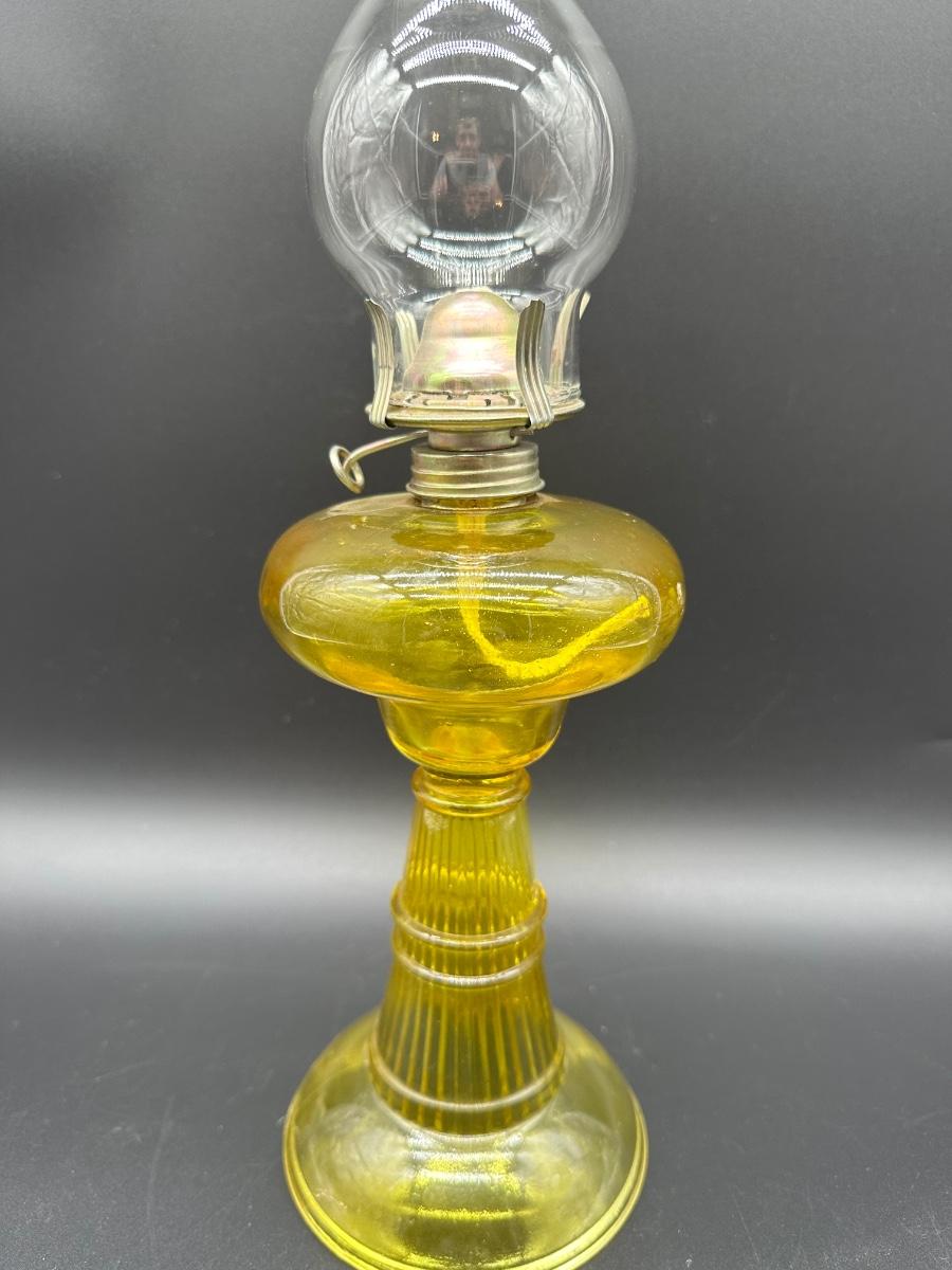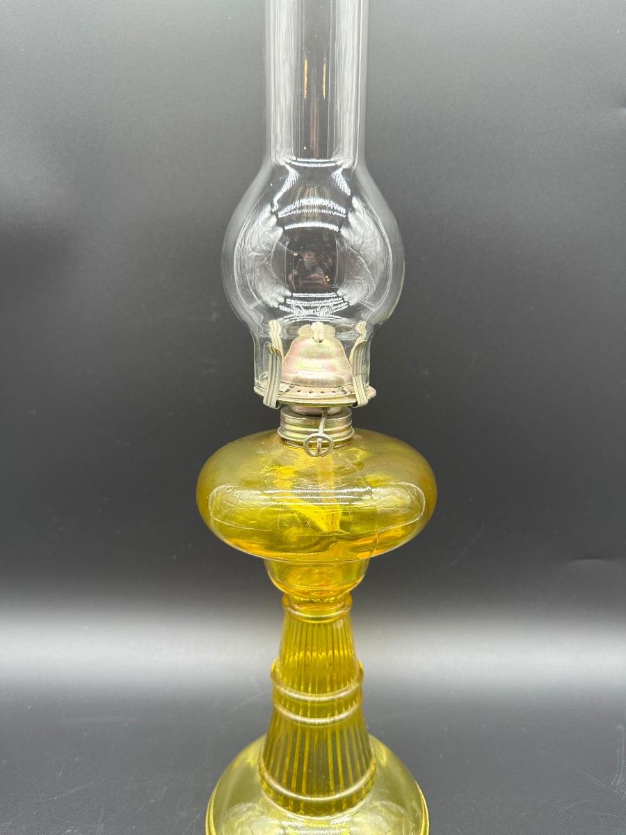 Amber Glass Kerosene Oil Lamp – Ribbed Stem Base w/ Clear Hurricane Chimney