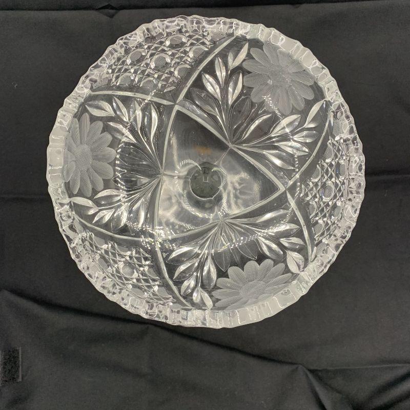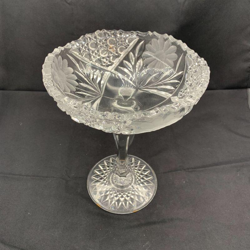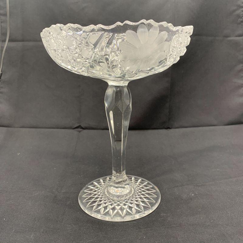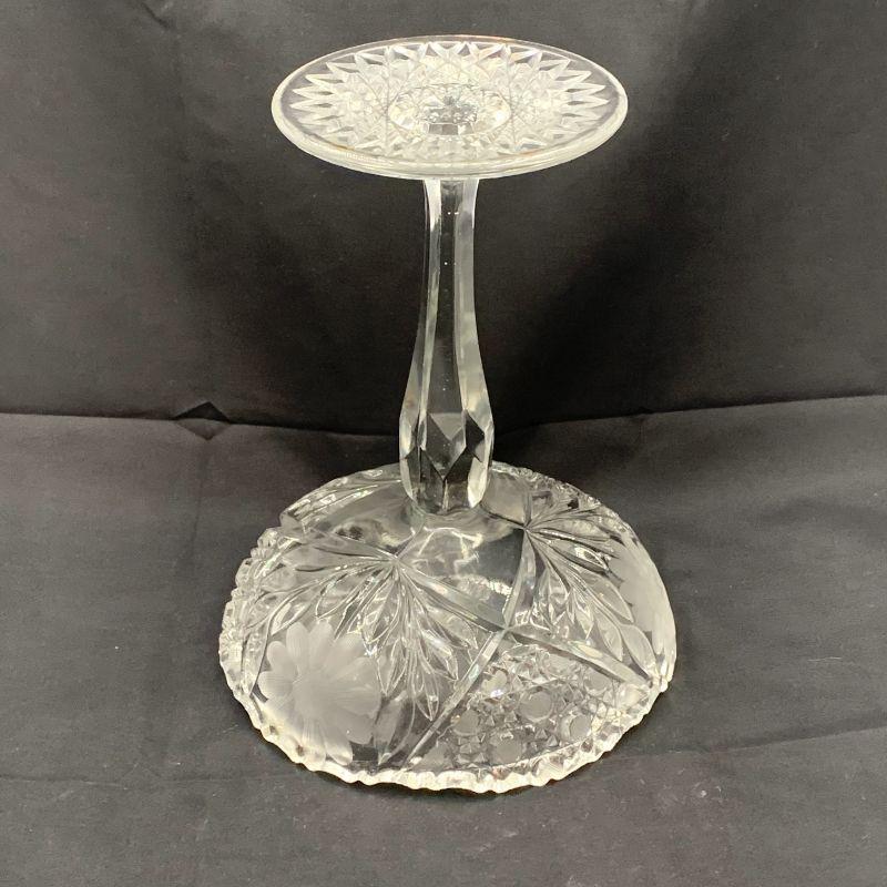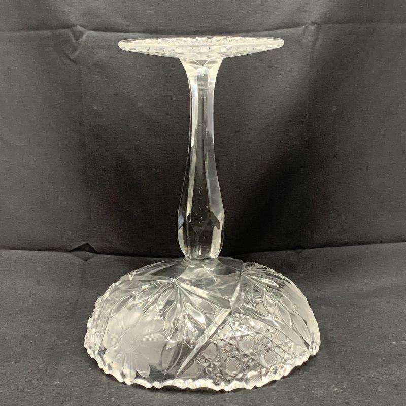Features a daisy motif on the bottom of bowl. There is a hobstar pattern on the bottom of the base. The stem has notched flutes and the base has an excellent deep cut 24-point star. This gleams in the light and rings nicely when tapped. We were unable to determine the make of this fine piece but would place it no later than the first decade of the 20th Century for a time frame. Excellent condition!