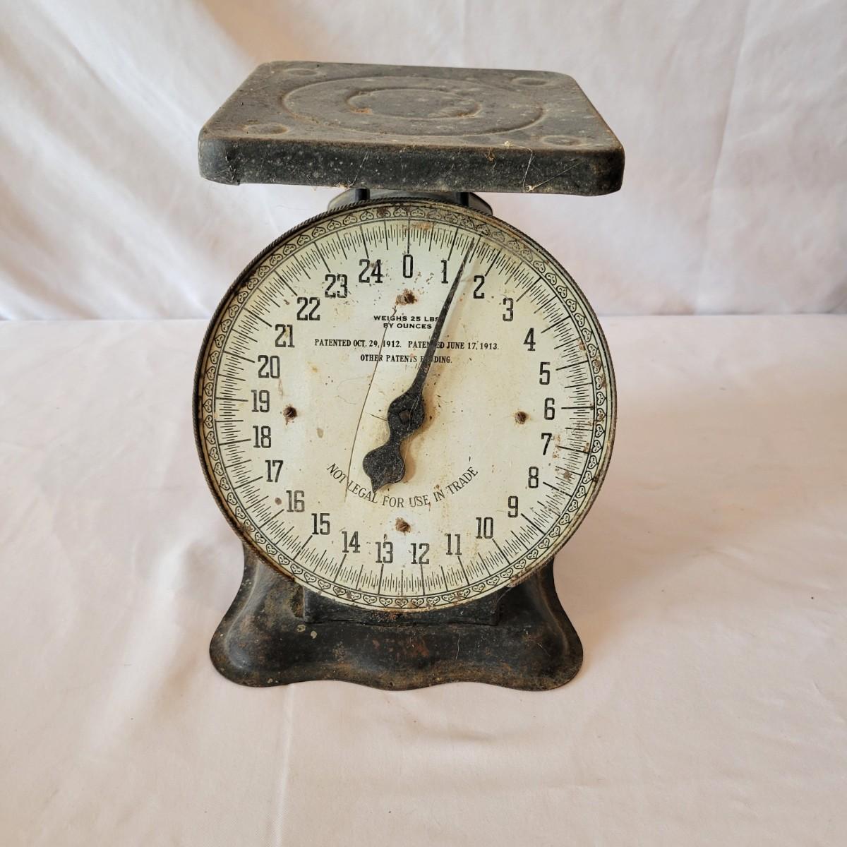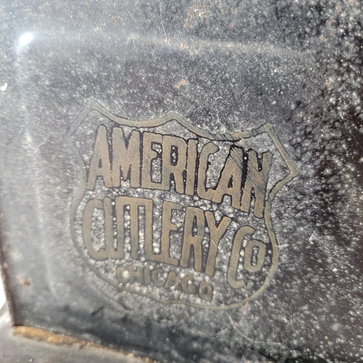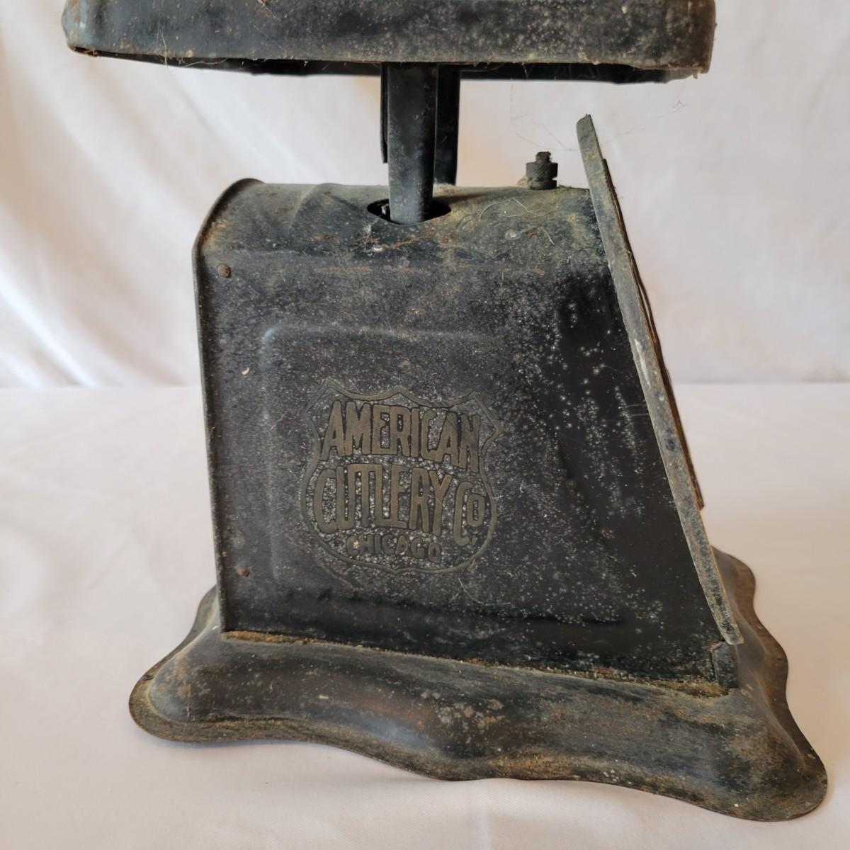 An antique scale stamped with American Cutlery Co. from Chicago. It can weigh up to 25lbs in ounces, but appears to be 1.5lbs out of balance. It measures approximately 7" x 8.5" x 8"H. Shipping available