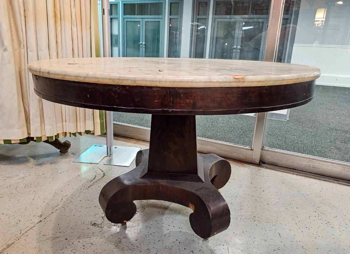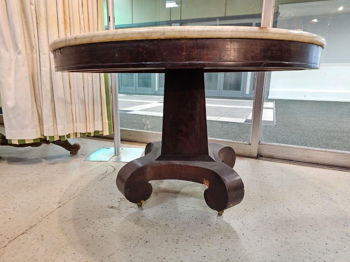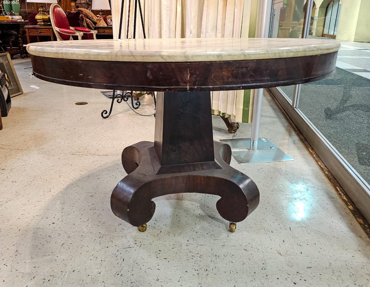 Antique Empire style marble top, round center table. American, circa 1850, 45"W x 29"