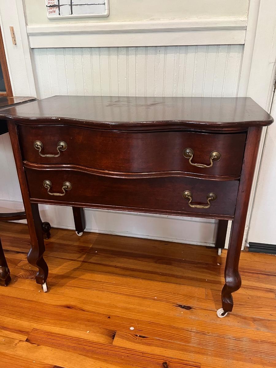 Early 20th c. two-drawer server; approx. 30.5” x 34” x 20”. Surface wear from age and use