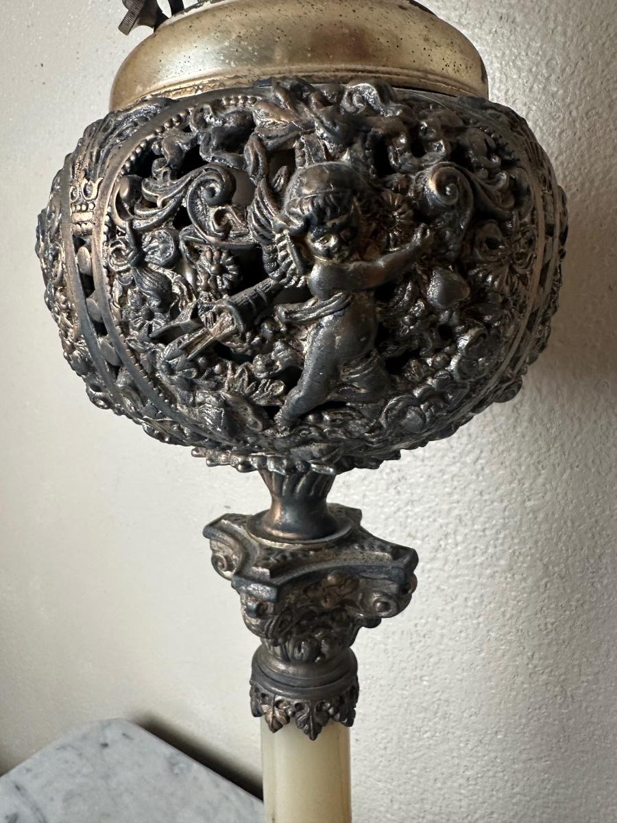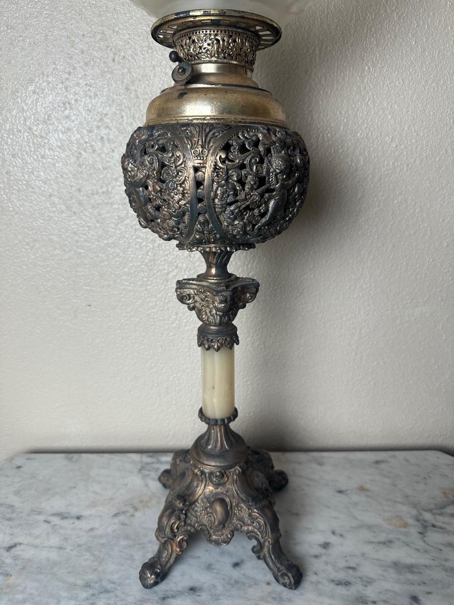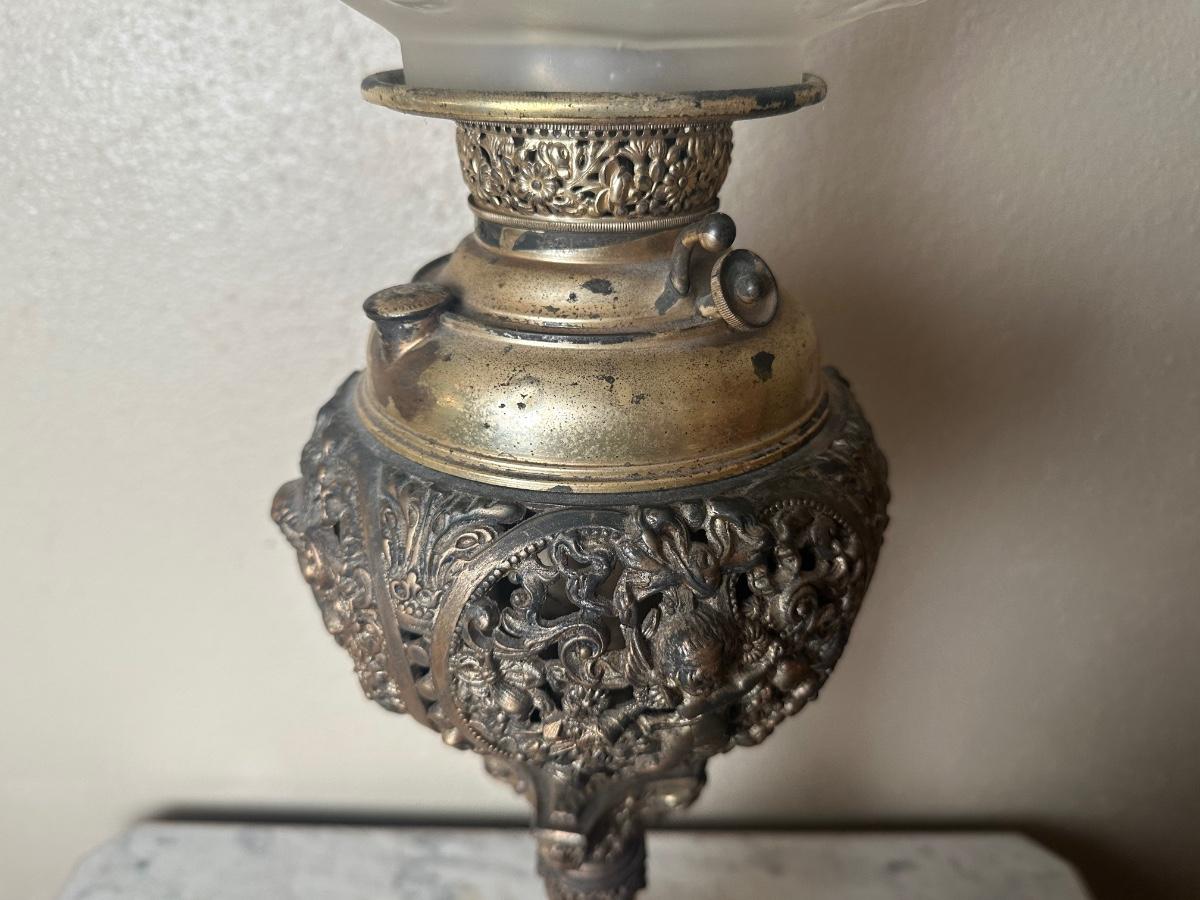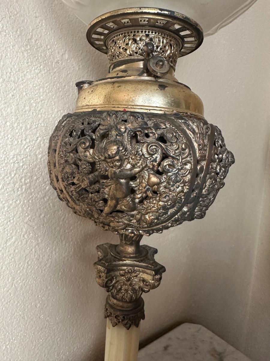 Antique American-made oil lamp converted to electric, featuring an ornate body with cherub and floral relief, brass oil font marked “Made in USA,” and molded glass globe. Original burner hardware remains. Converted wiring present. Displays well with age-appropriate patina and surface wear consistent with antique use.
