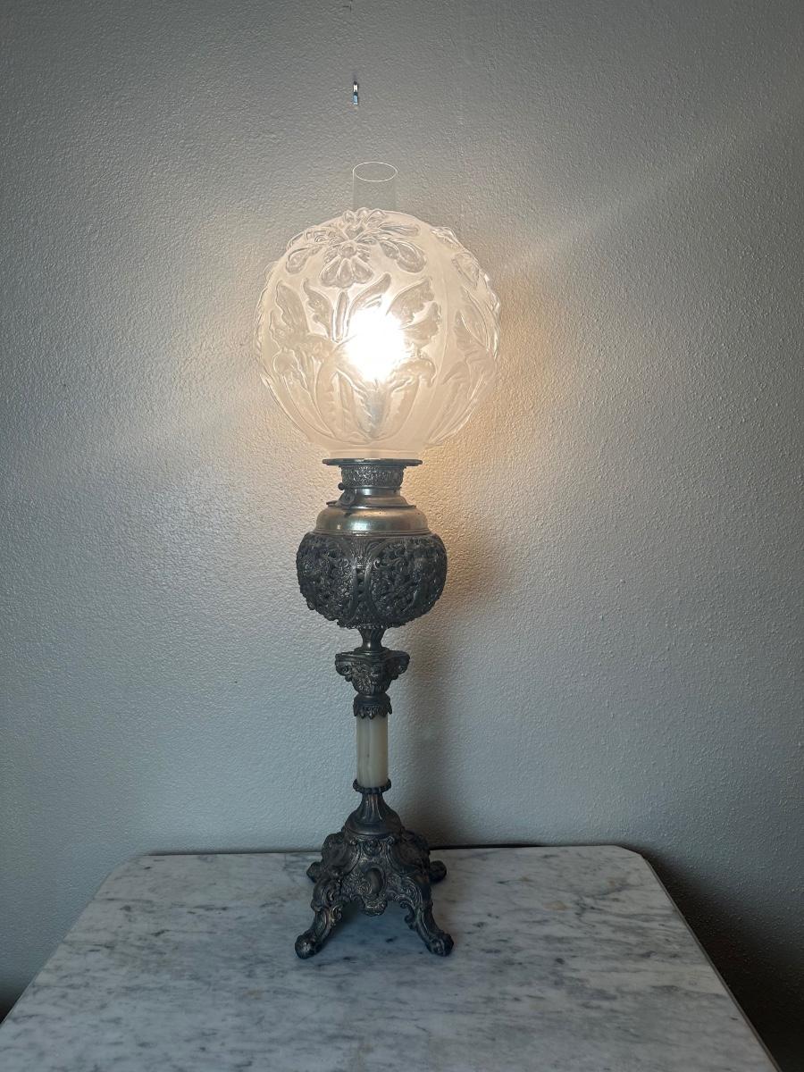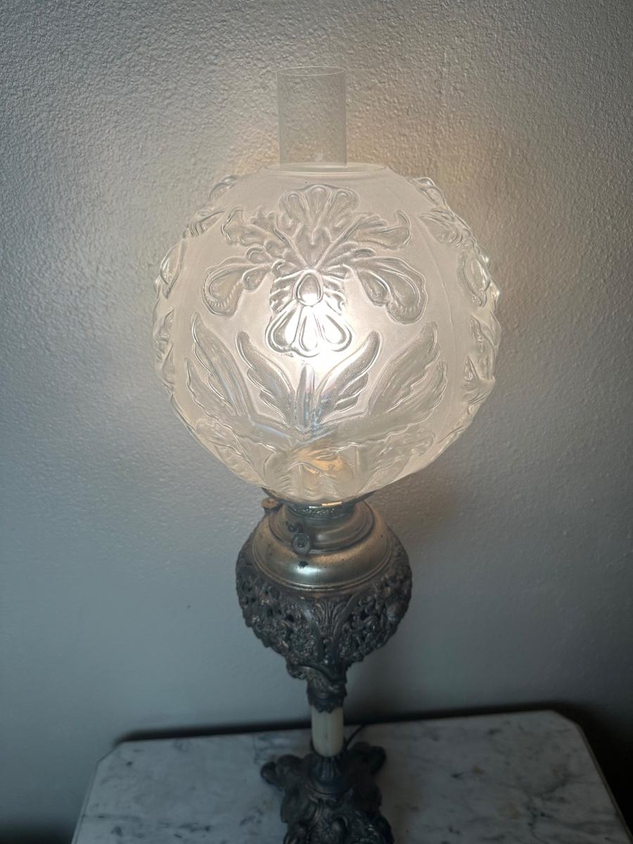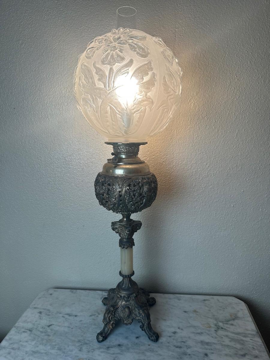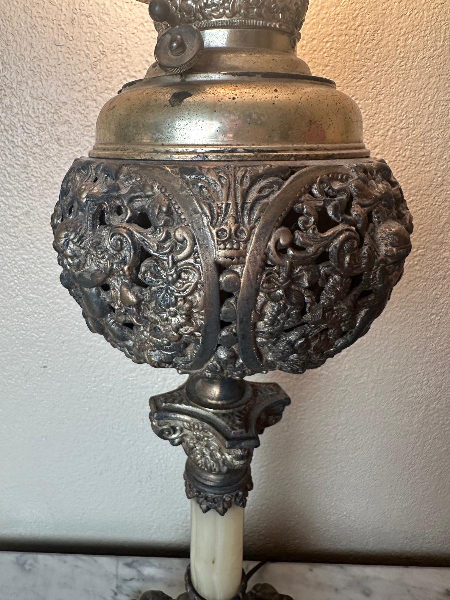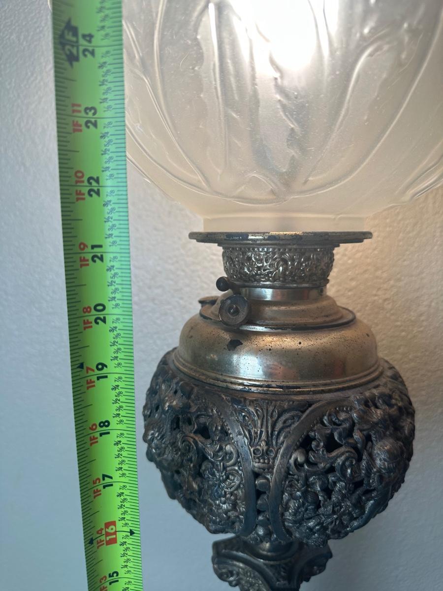 Antique American-made oil lamp converted to electric, featuring an ornate body with cherub and floral relief, brass oil font marked “Made in USA,” and molded glass globe. Original burner hardware remains. Converted wiring present. Displays well with age-appropriate patina and surface wear consistent with antique use.