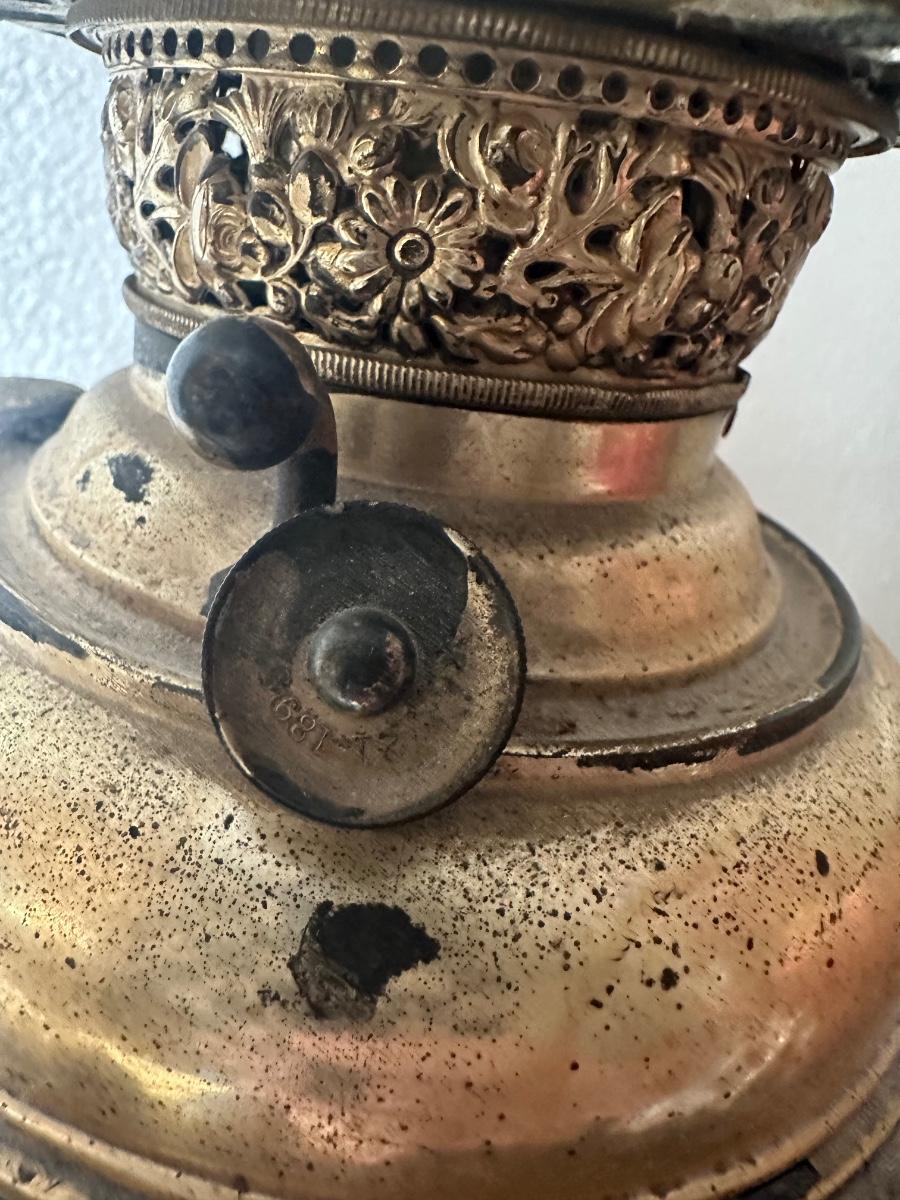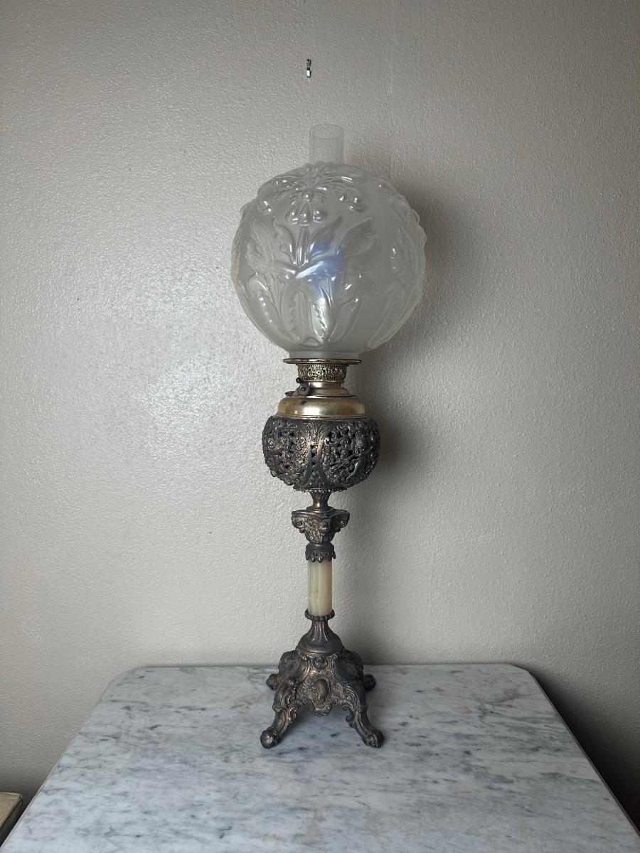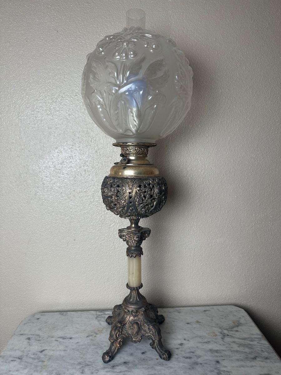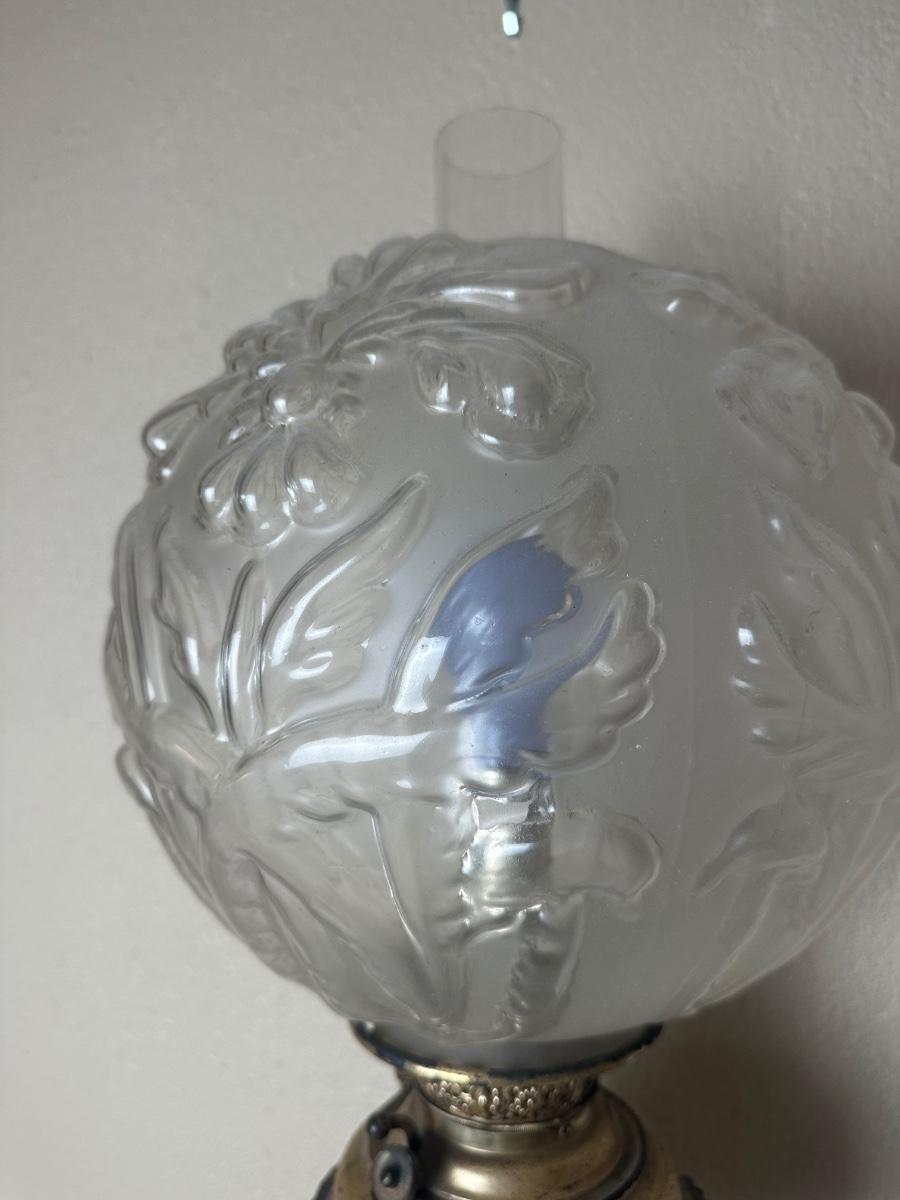 Antique American-made oil lamp converted to electric, featuring an ornate body with cherub and floral relief, brass oil font marked “Made in USA,” and molded glass globe. Original burner hardware remains. Converted wiring present. Displays well with age-appropriate patina and surface wear consistent with antique use.