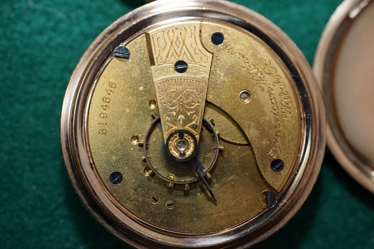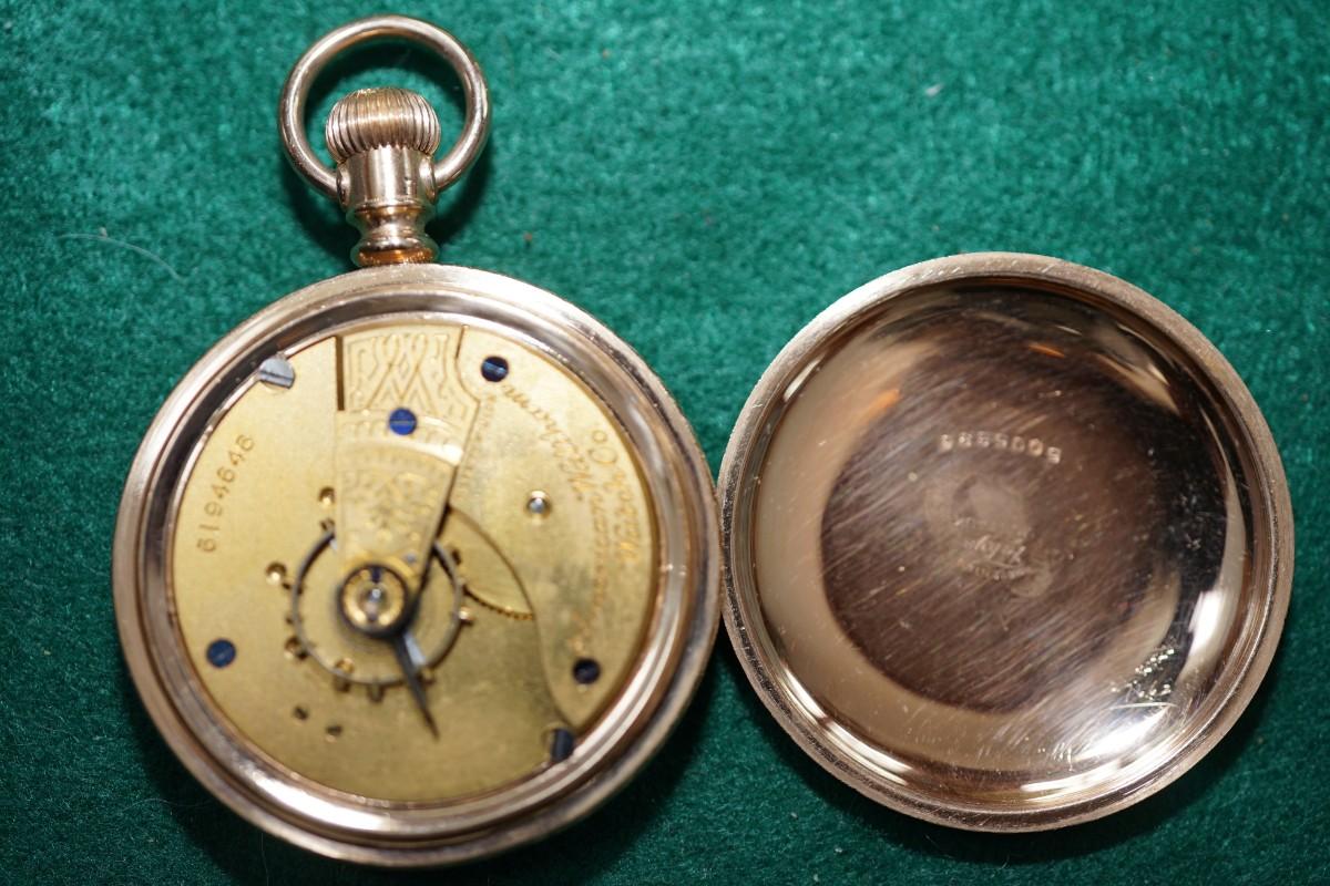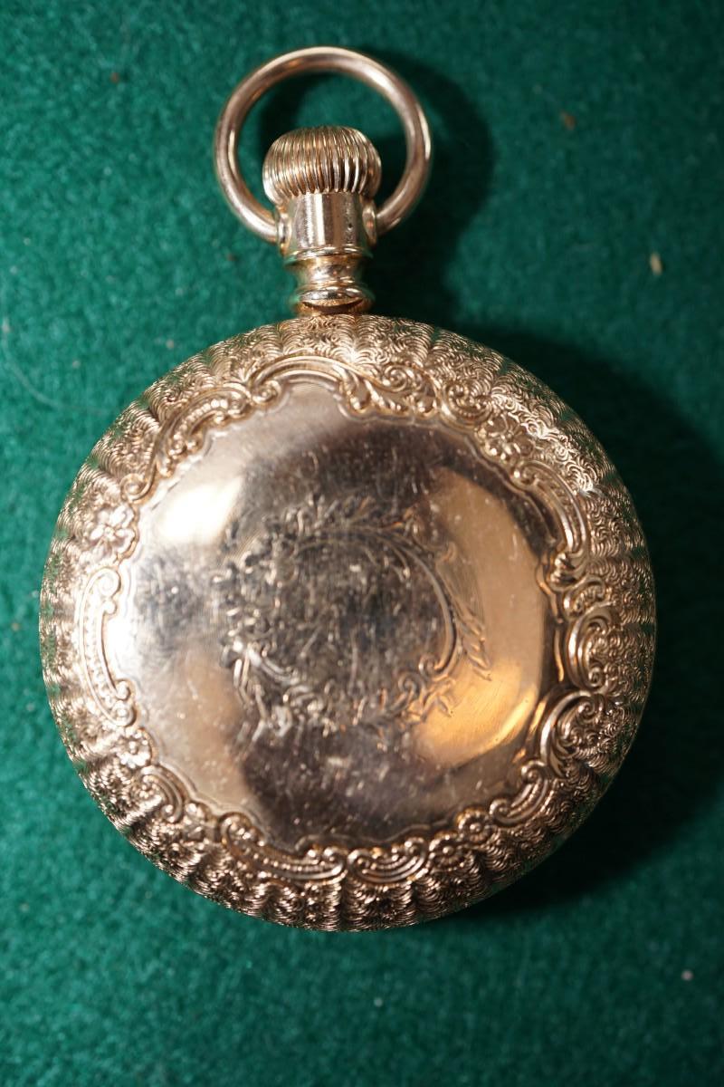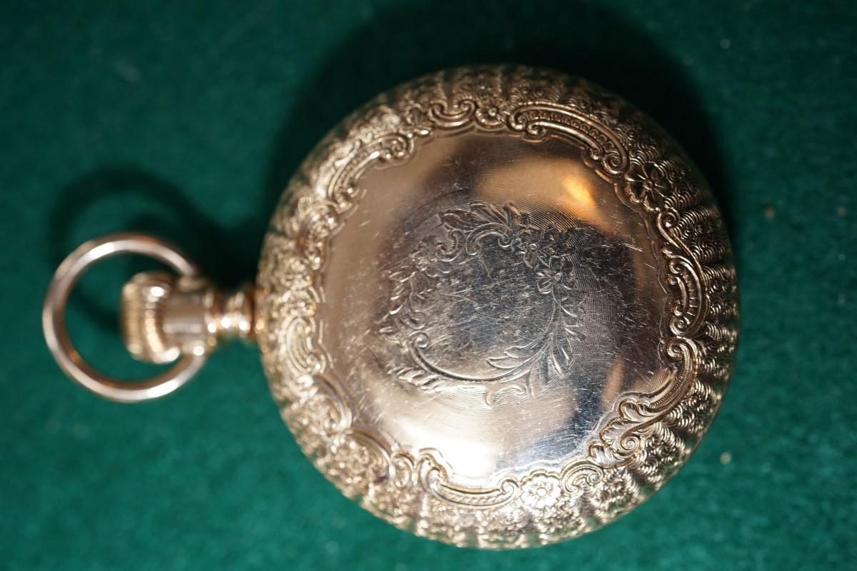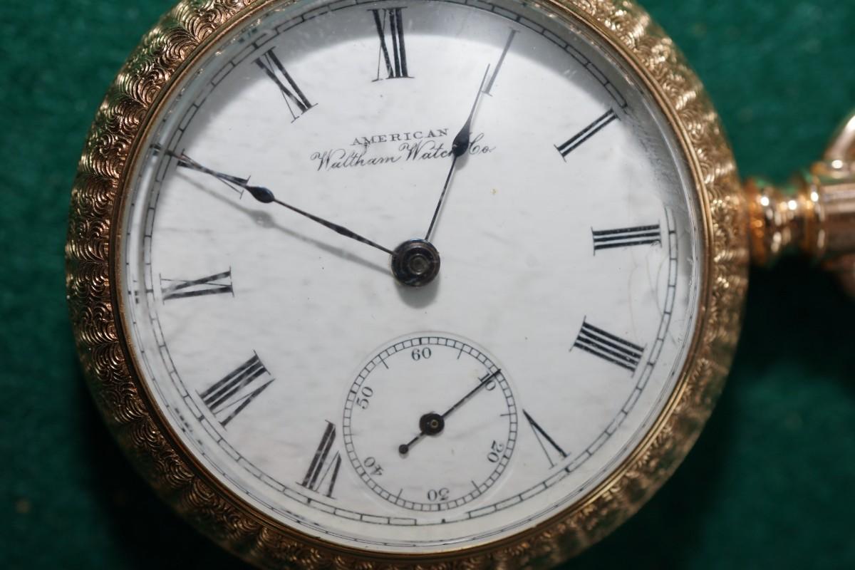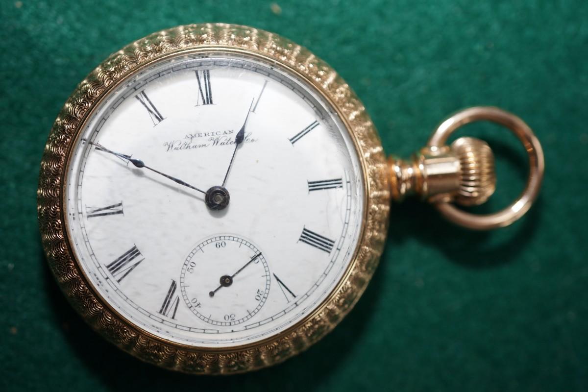 American Waltham half hunter case pocket watch. ornate nicely engraved half case 1883