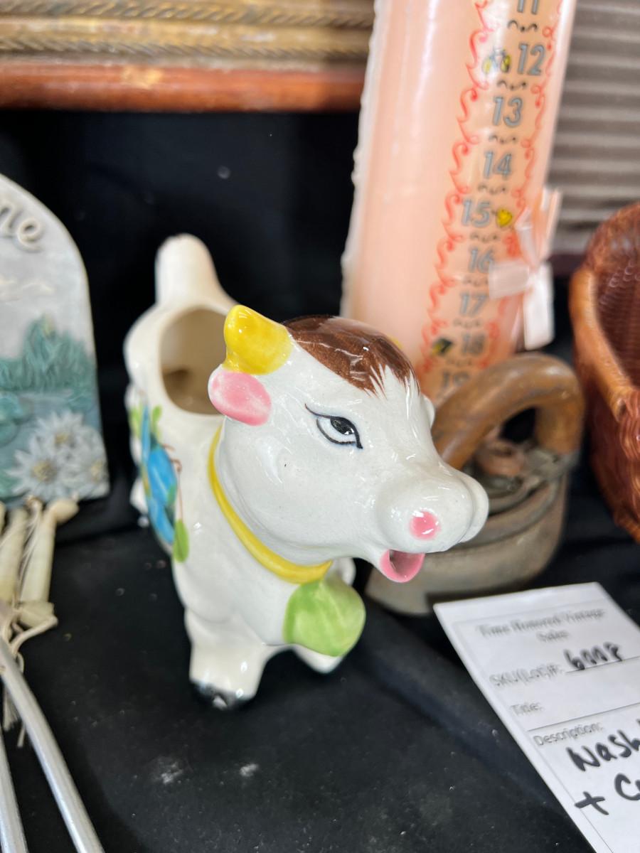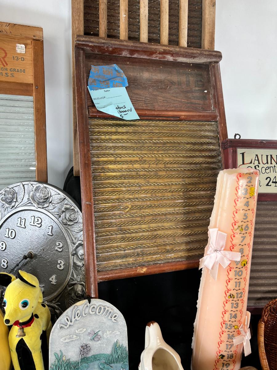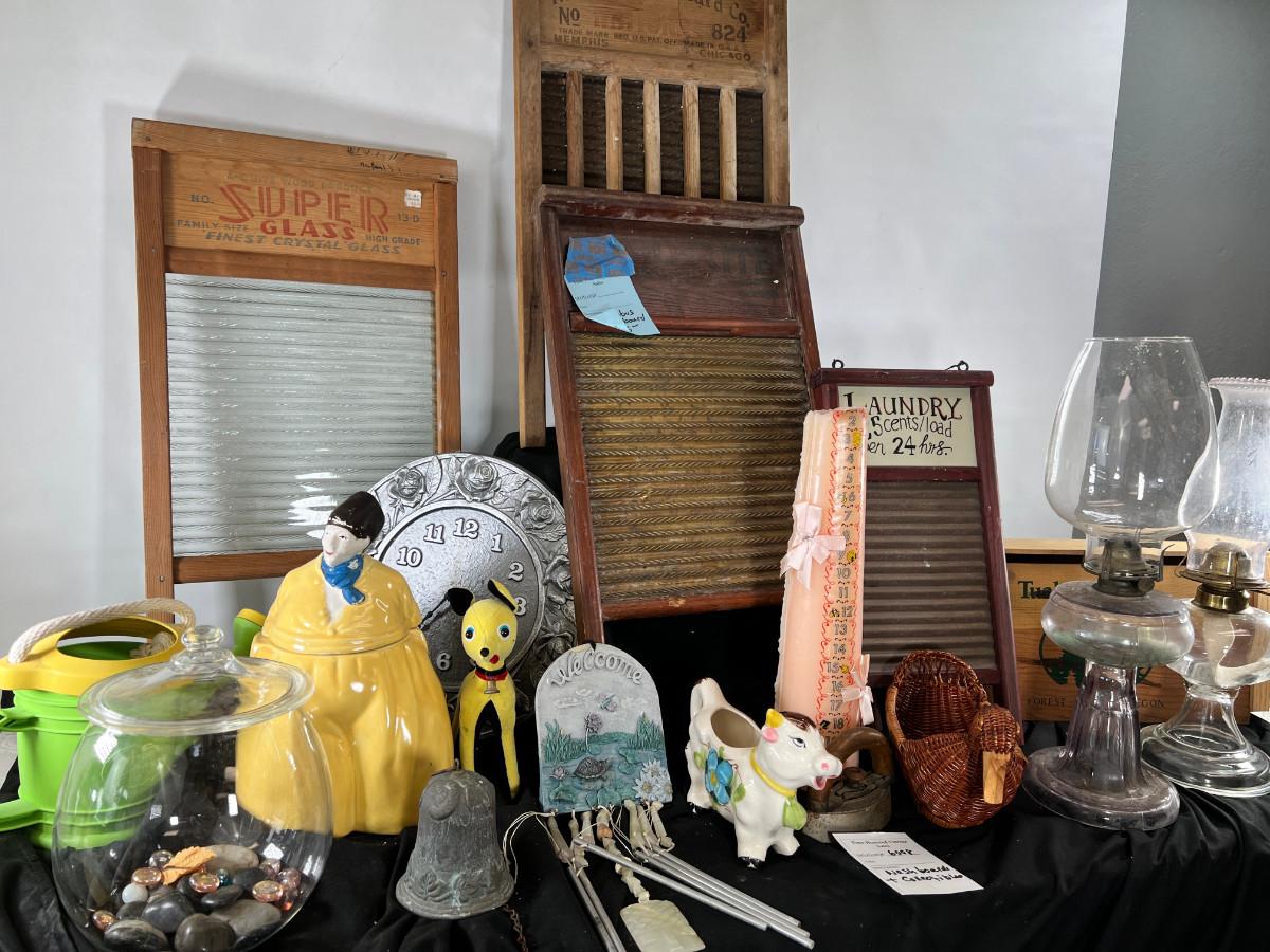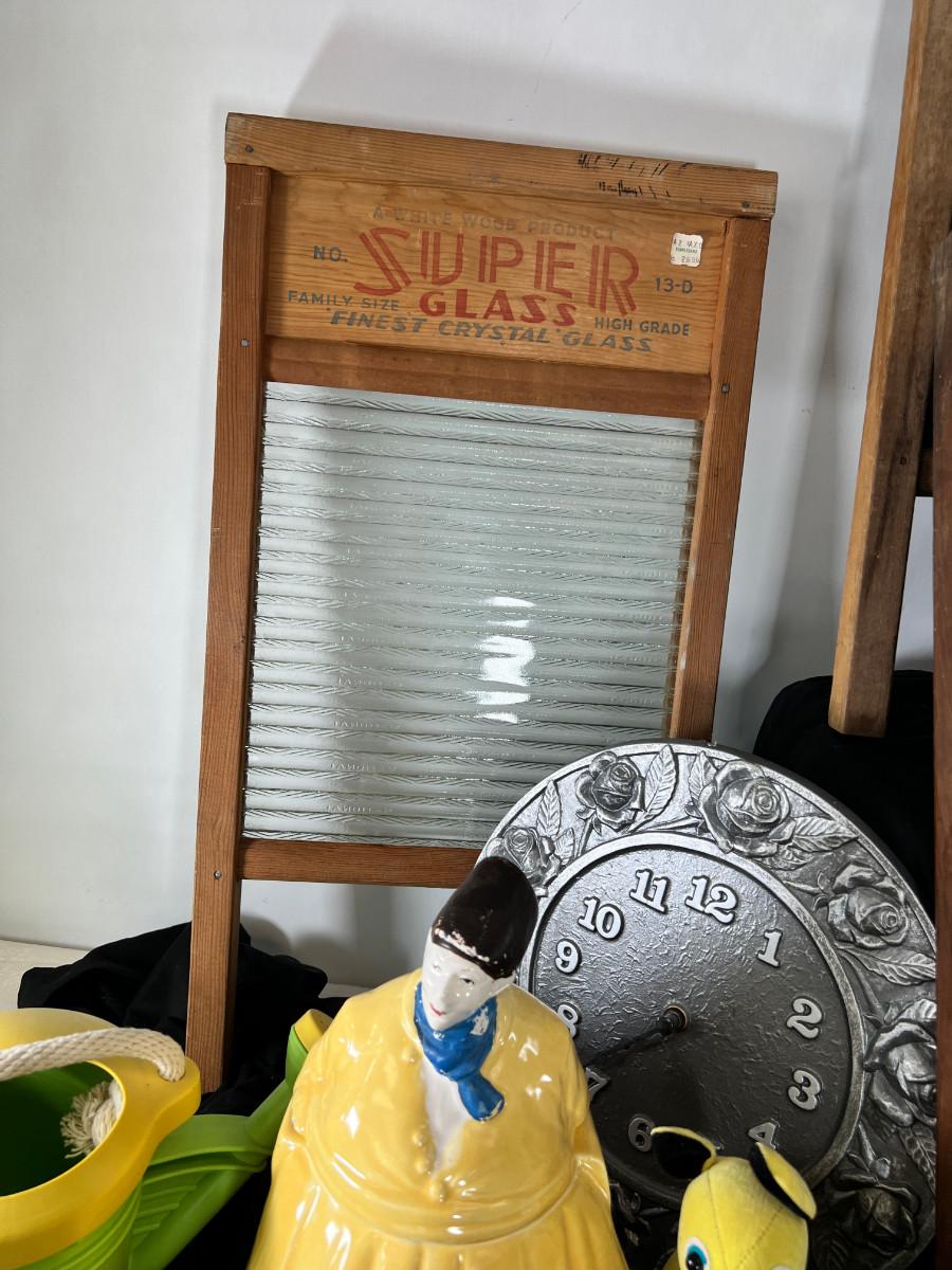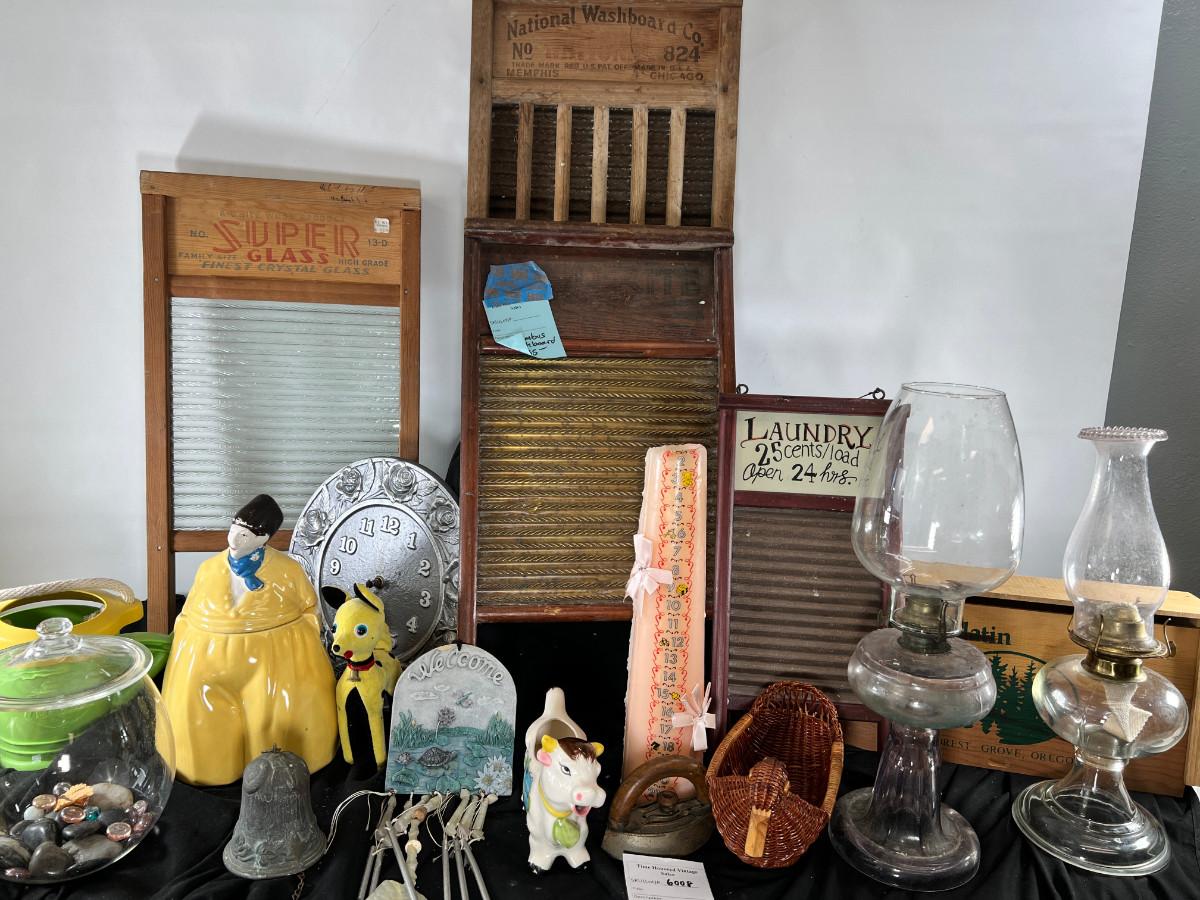 Rare Glass washboard and other full size antique washboards. Ceramic cookie jar with some wear unmarked MCM, Pink year candle ( started) Bell and wind chime, working glass oil lamps, Mini Sad iron, wall clock (needs work) early Danskin "Dream Pet" Cow creamer