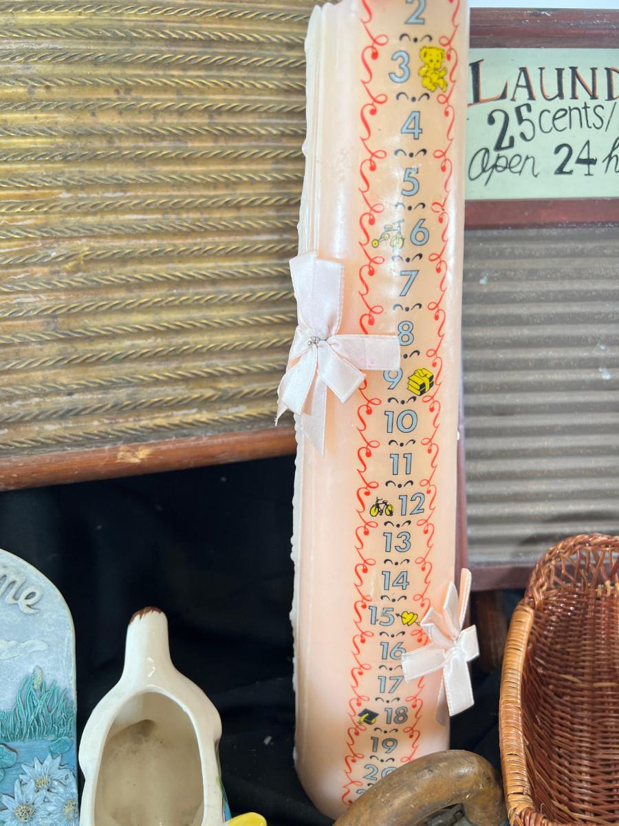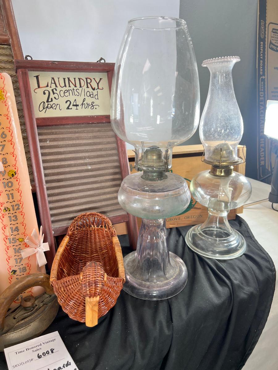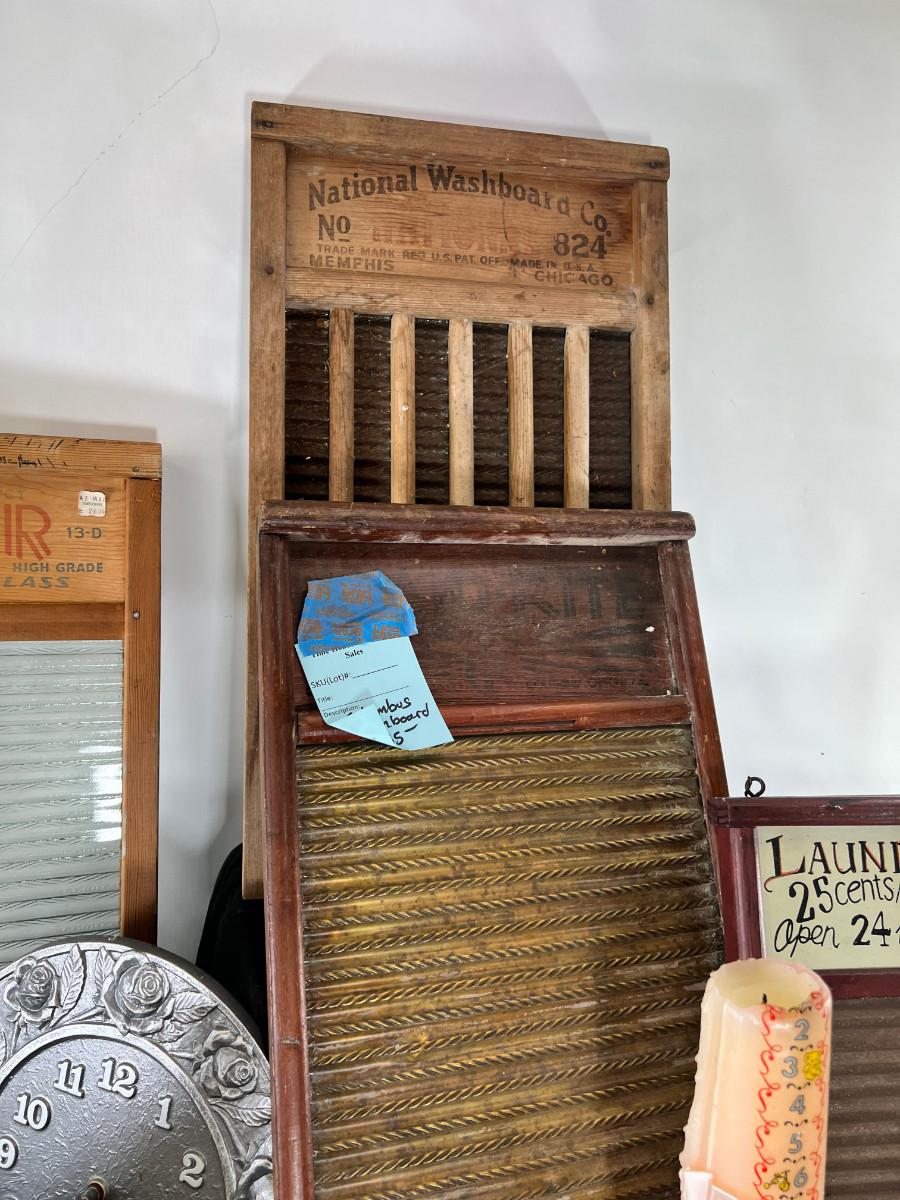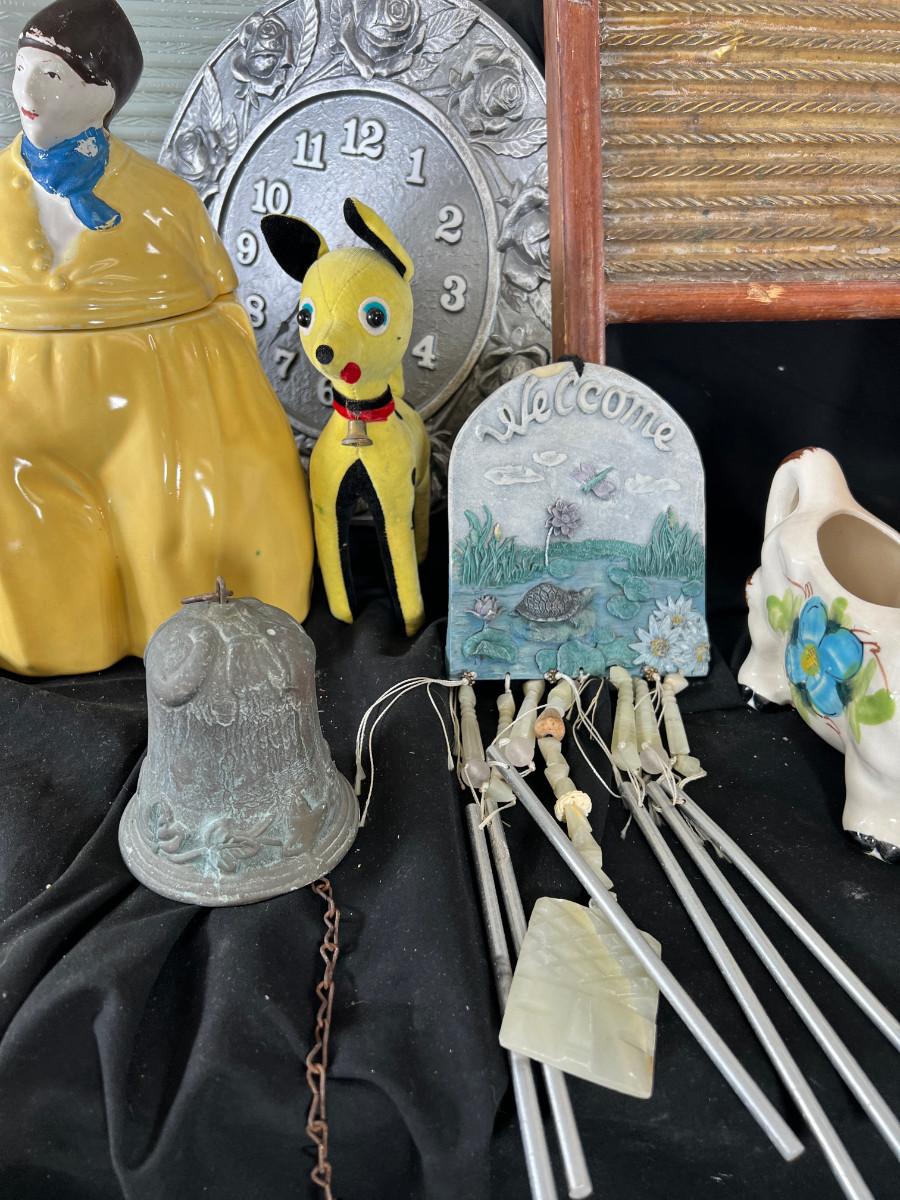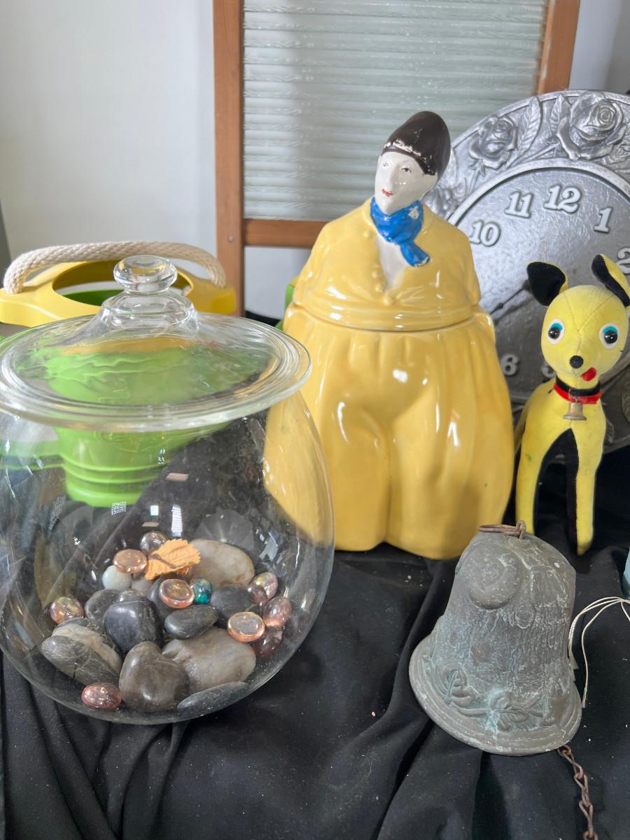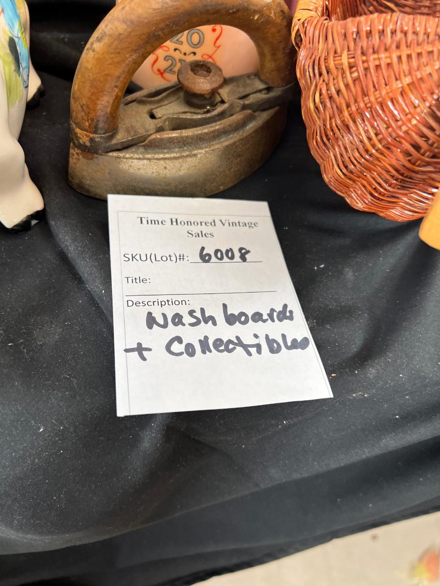 Rare Glass washboard and other full size antique washboards. Ceramic cookie jar with some wear unmarked MCM, Pink year candle ( started) Bell and wind chime, working glass oil lamps, Mini Sad iron, wall clock (needs work) early Danskin "Dream Pet" Cow creamer