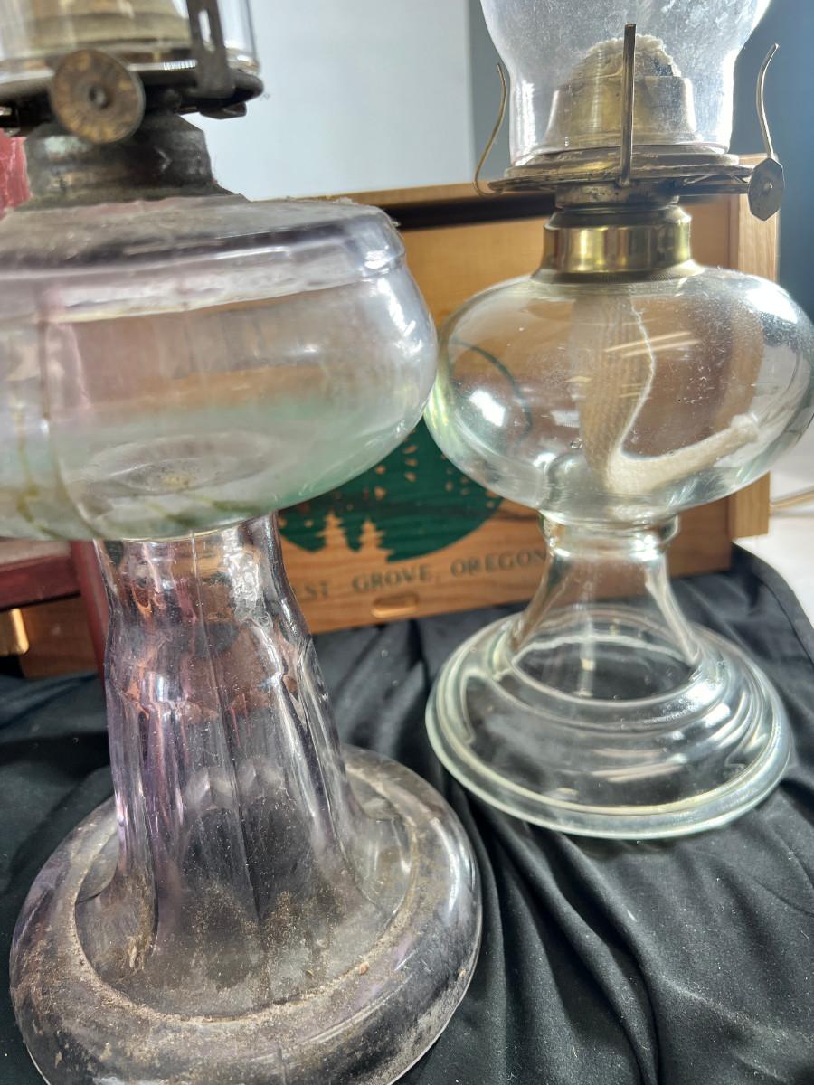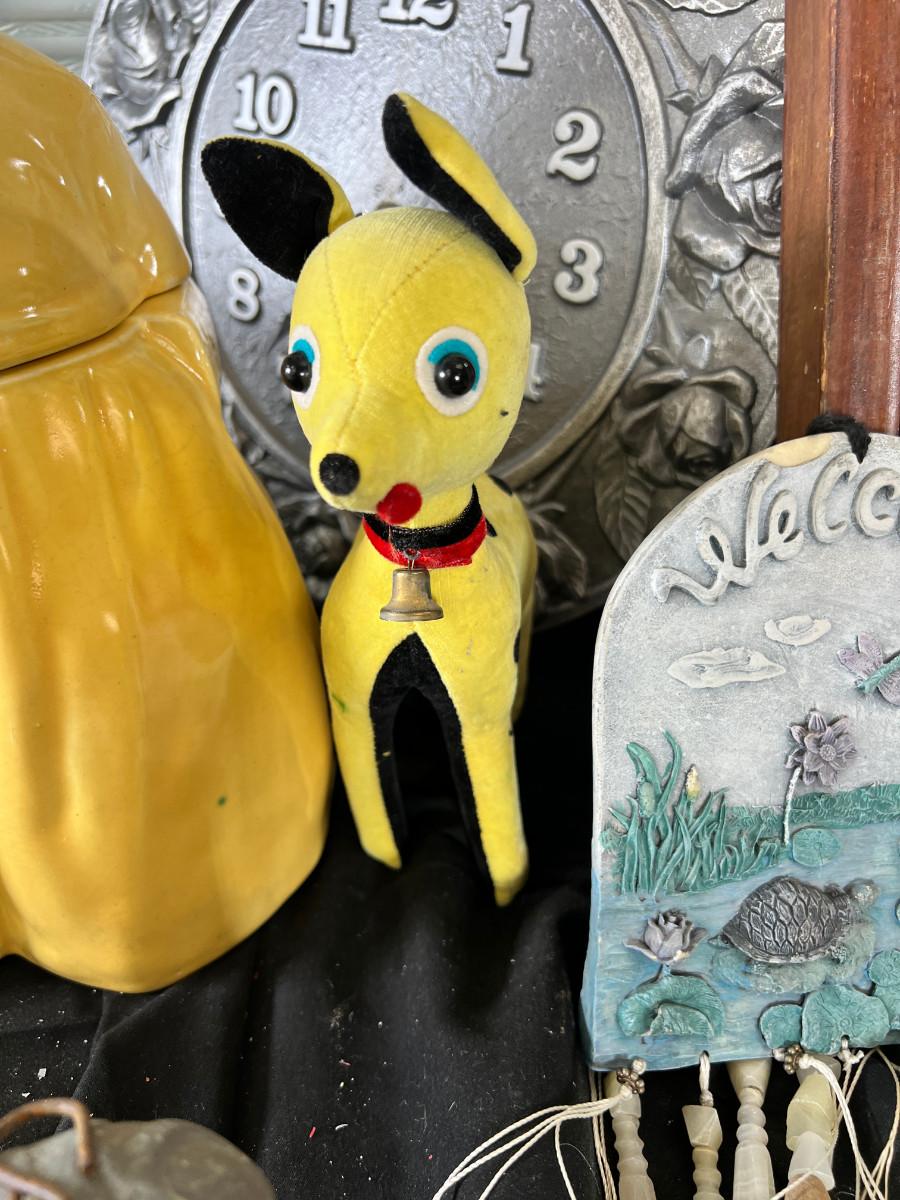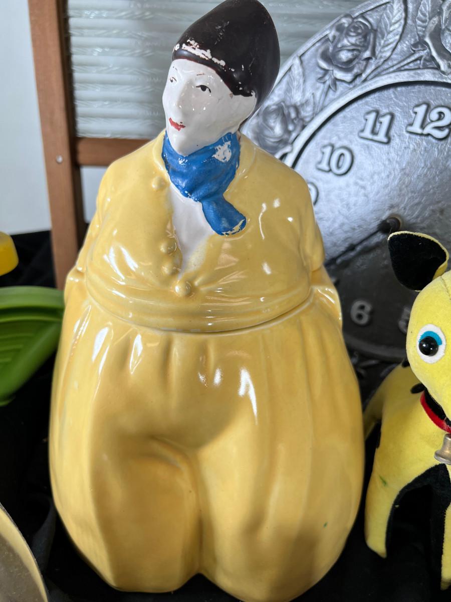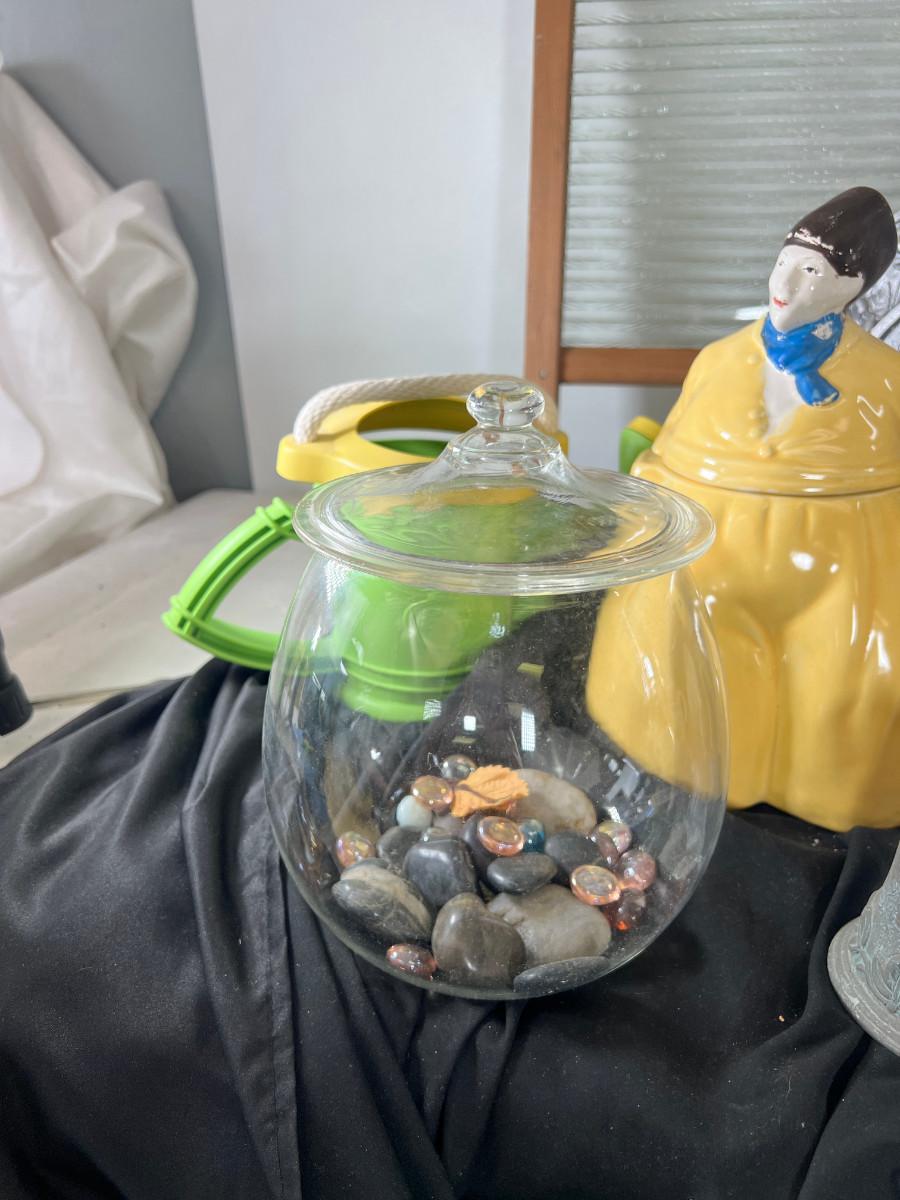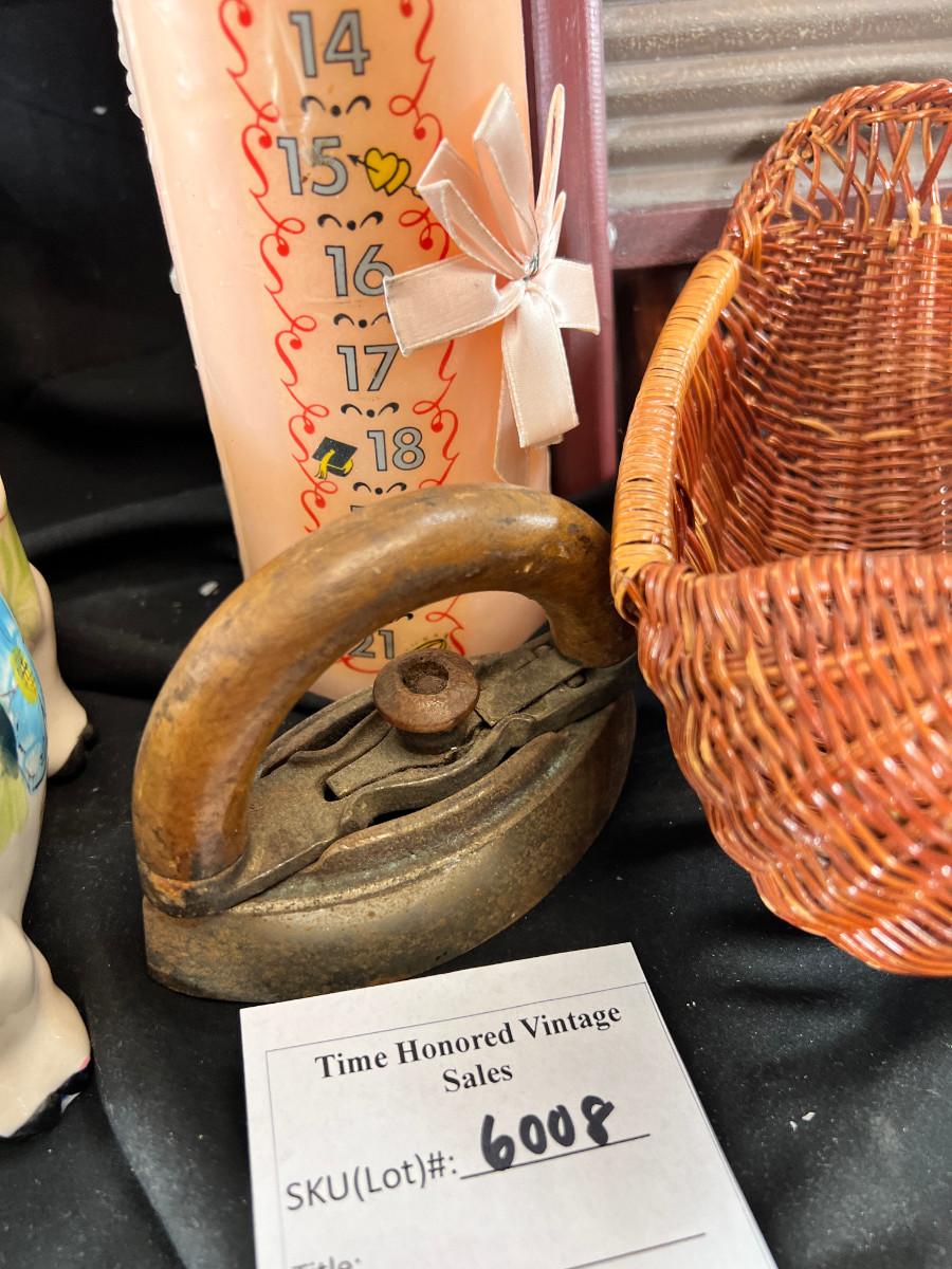 Rare Glass washboard and other full size antique washboards. Ceramic cookie jar with some wear unmarked MCM, Pink year candle ( started) Bell and wind chime, working glass oil lamps, Mini Sad iron, wall clock (needs work) early Danskin "Dream Pet" Cow creamer