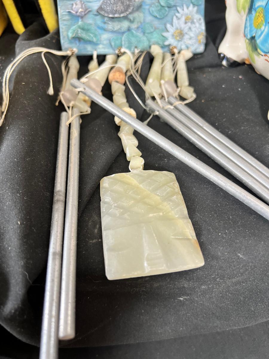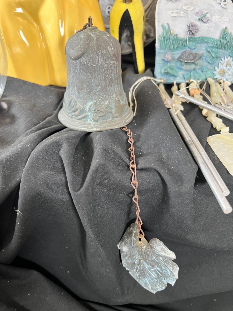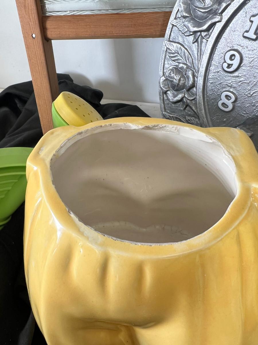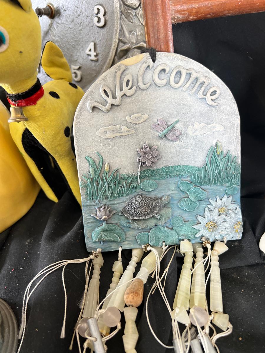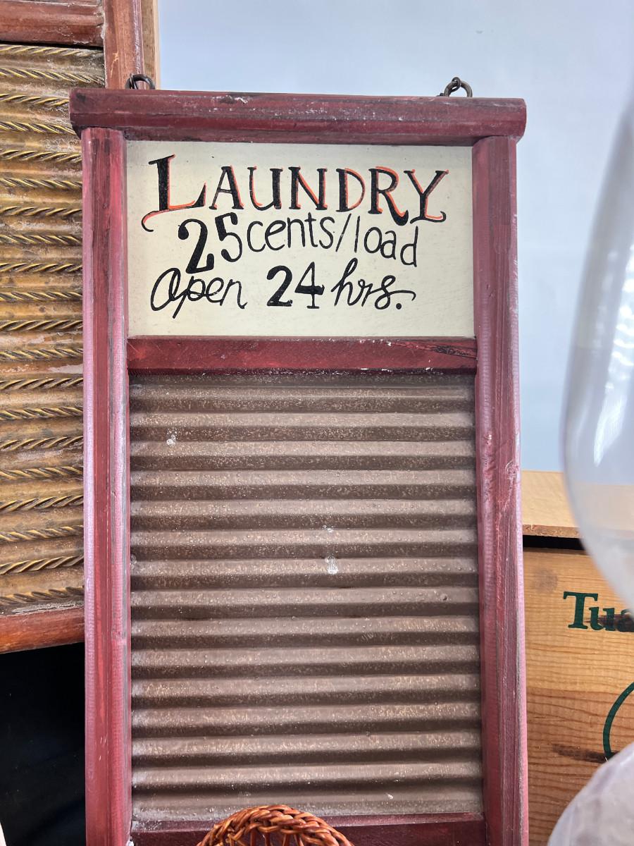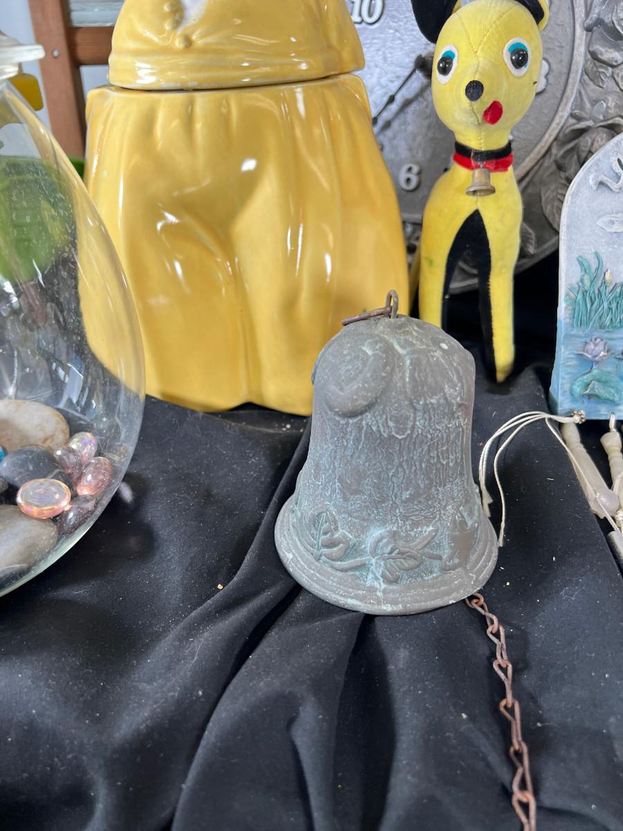 Rare Glass washboard and other full size antique washboards. Ceramic cookie jar with some wear unmarked MCM, Pink year candle ( started) Bell and wind chime, working glass oil lamps, Mini Sad iron, wall clock (needs work) early Danskin "Dream Pet" Cow creamer