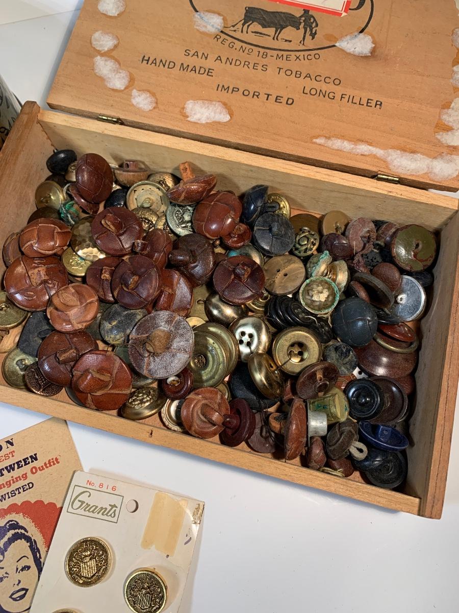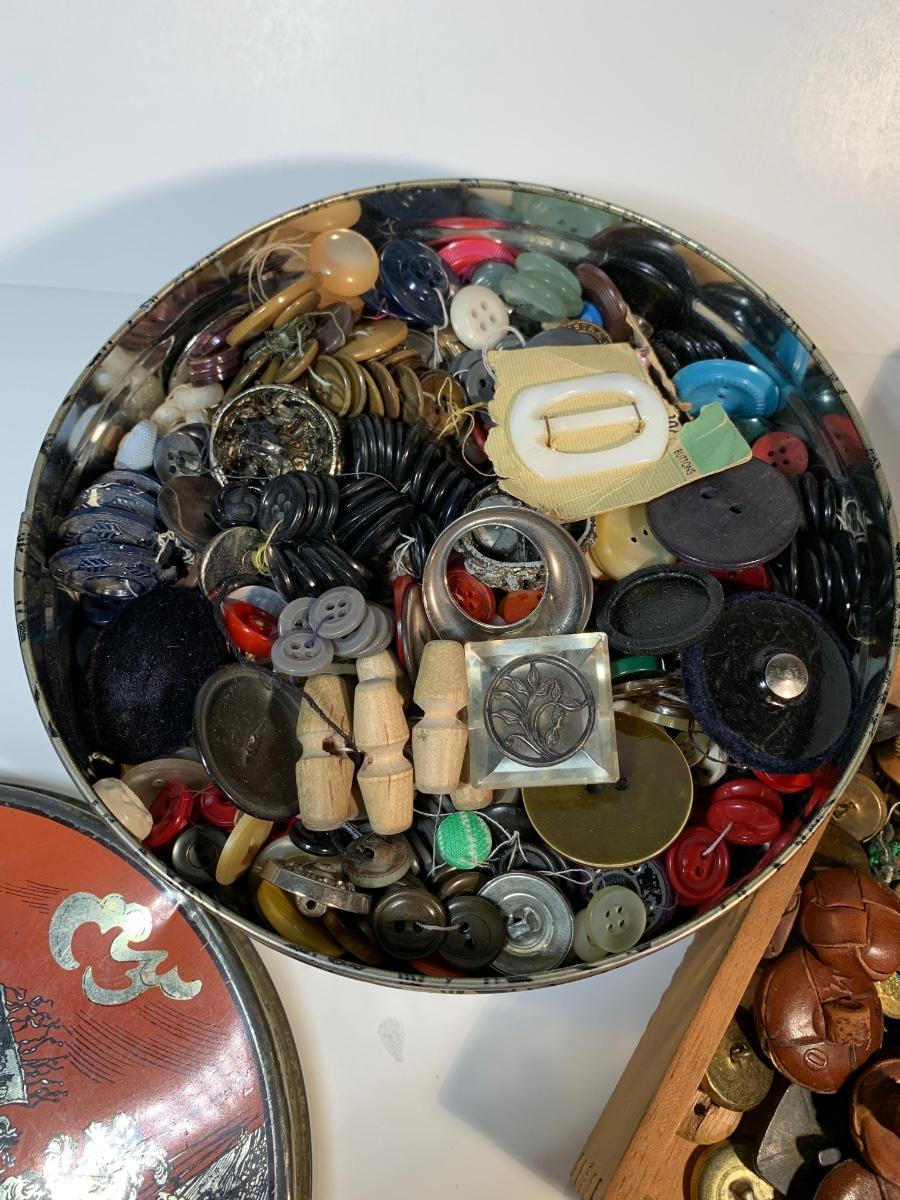 Large collection of antique and vintage buttons all together in a vintage tin and cigar box