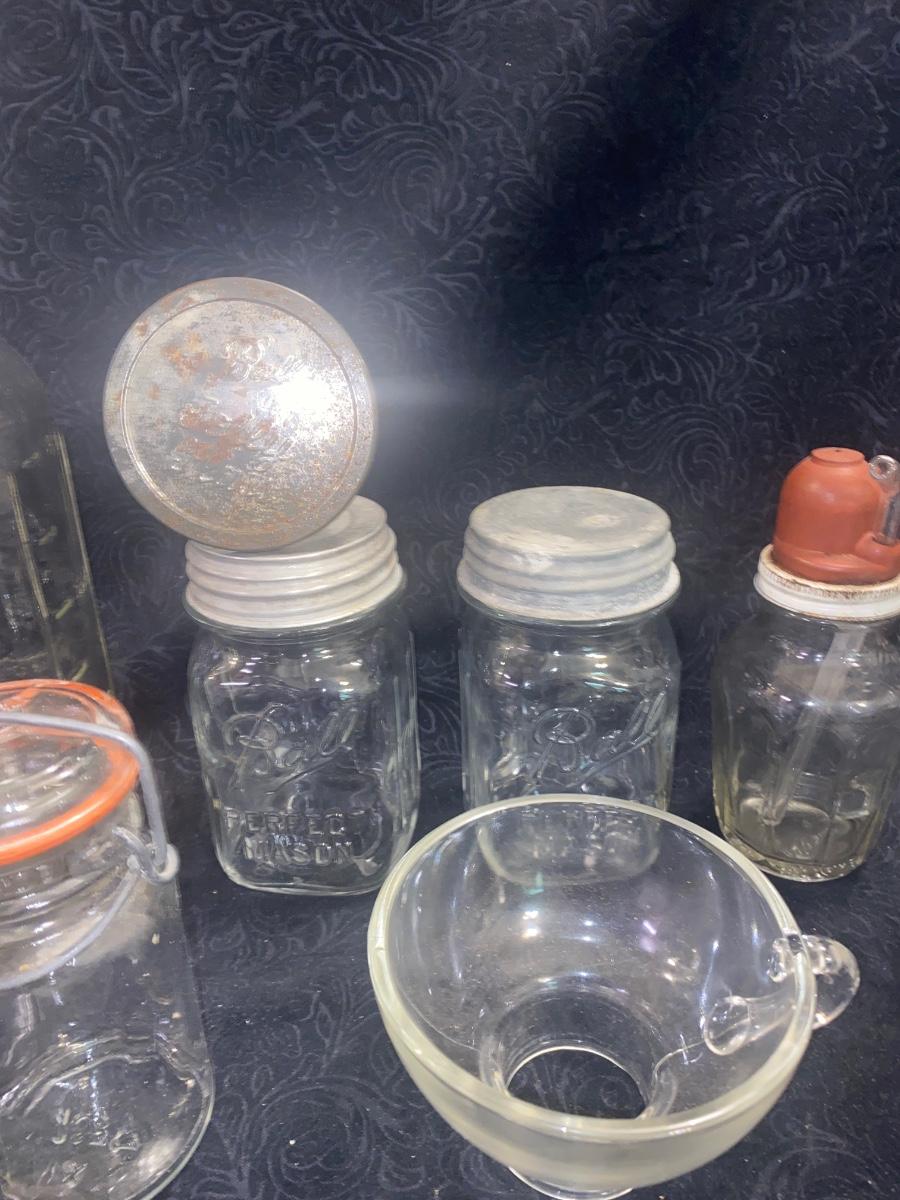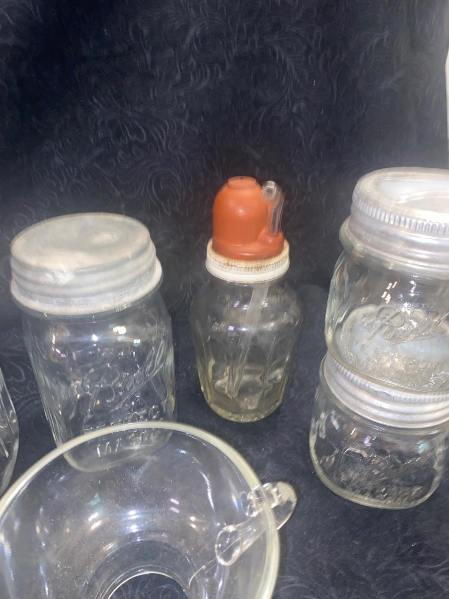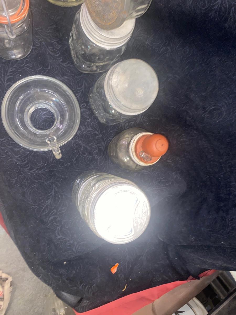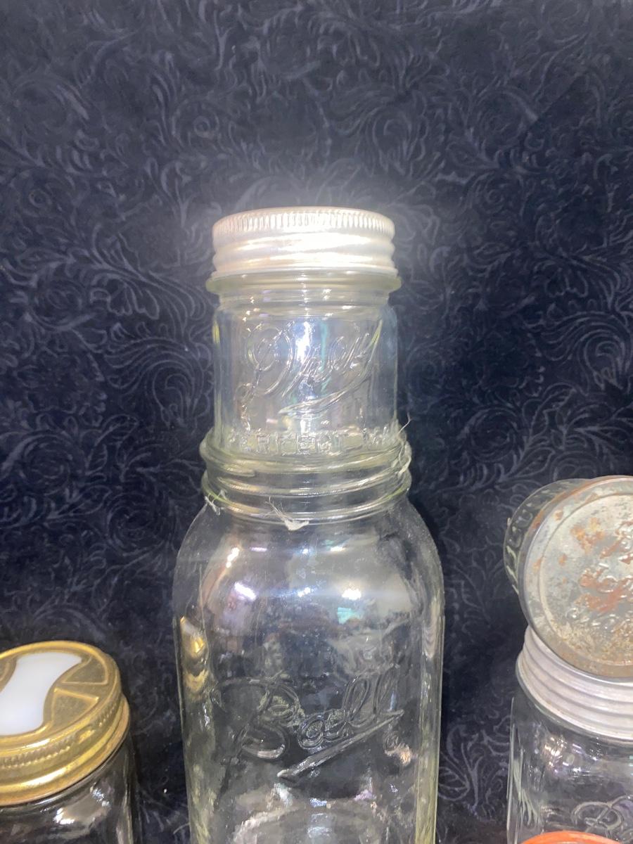 ANTIQUE AND VINTAGE CANNING JARS WITH LIDS & A CHEMICAL BOTTLE