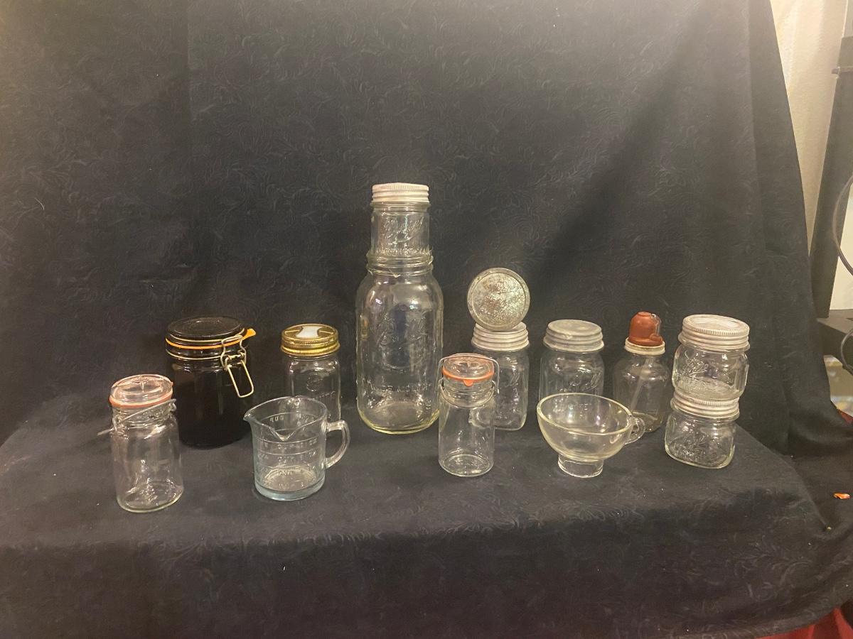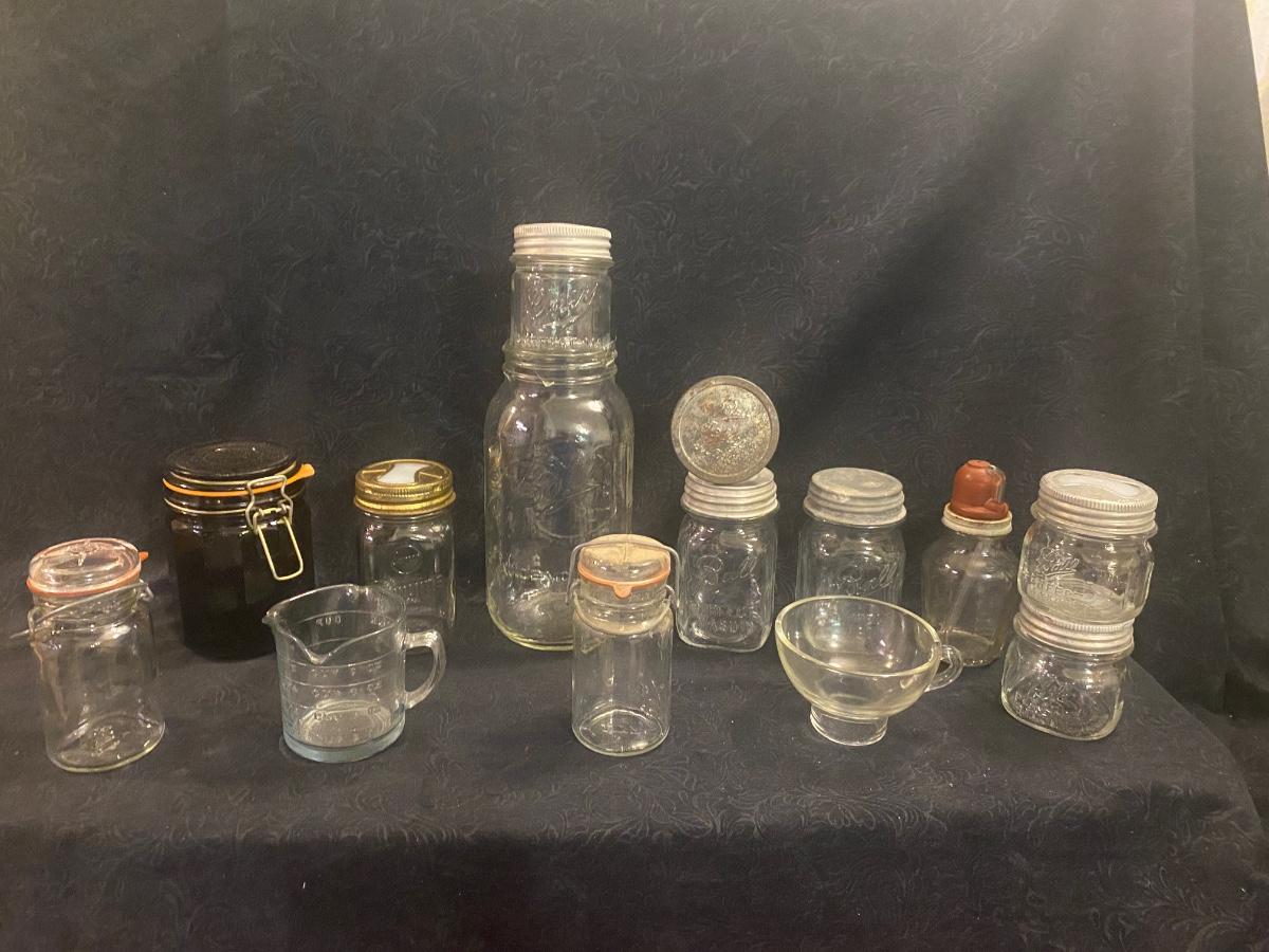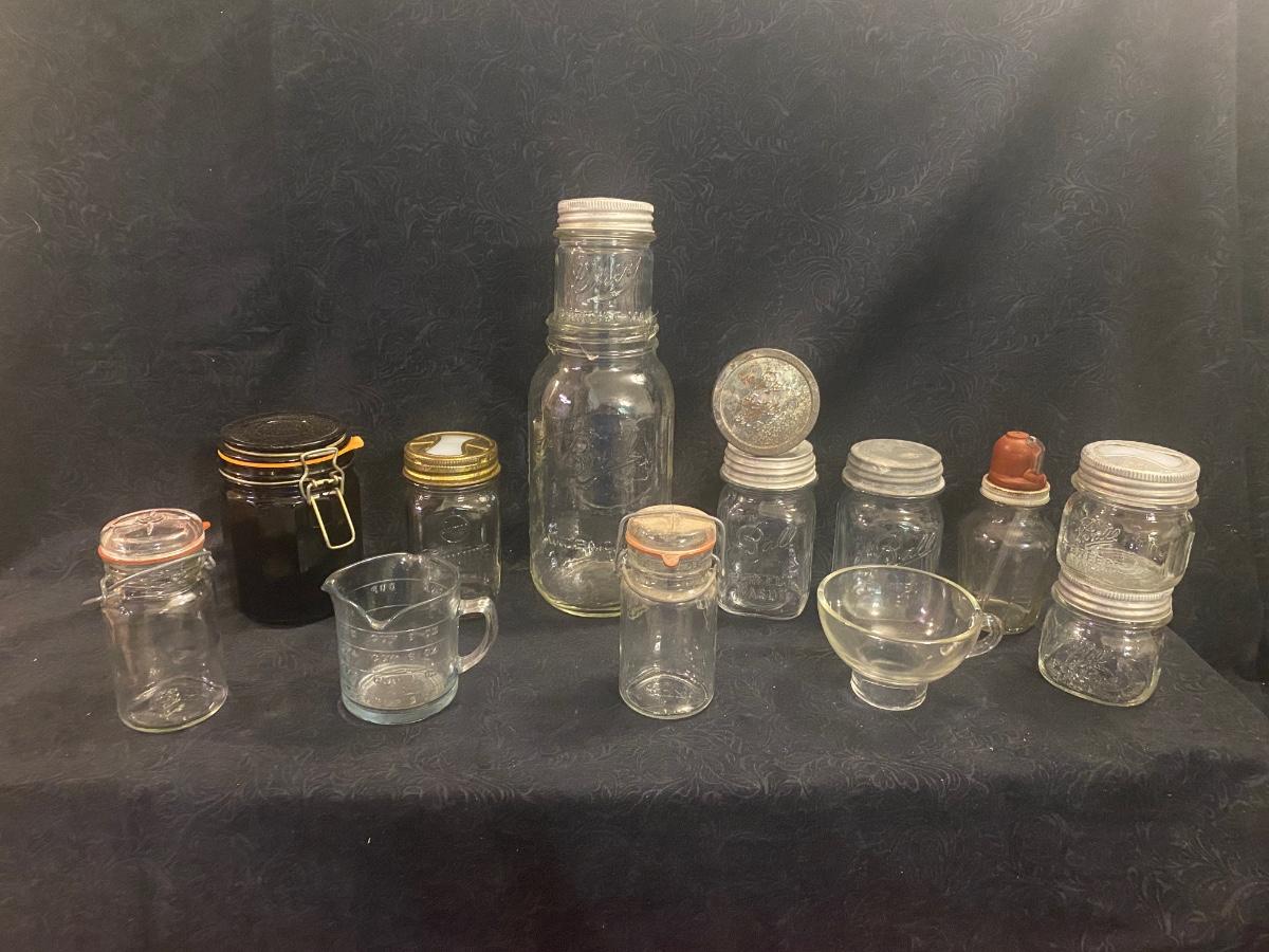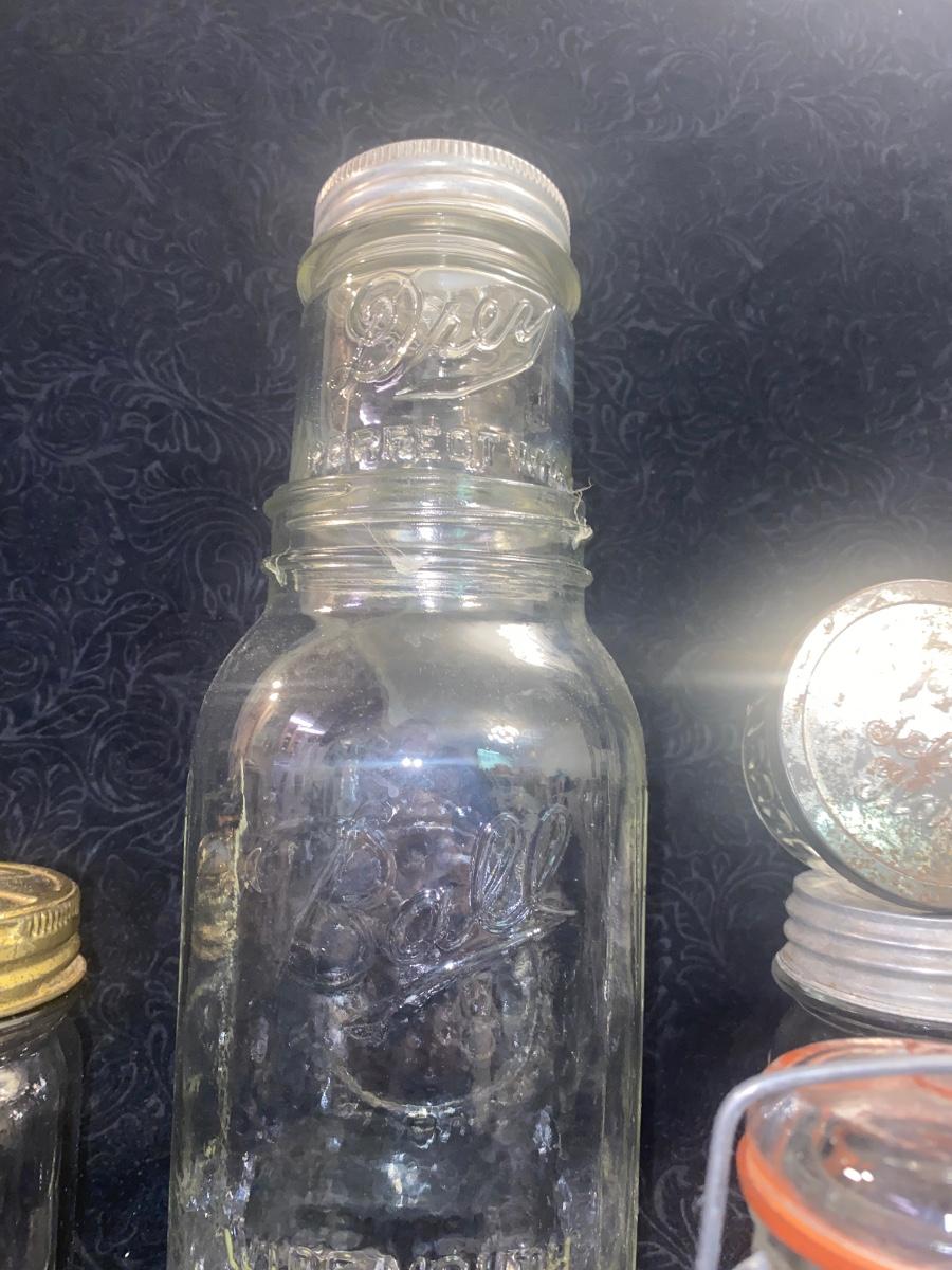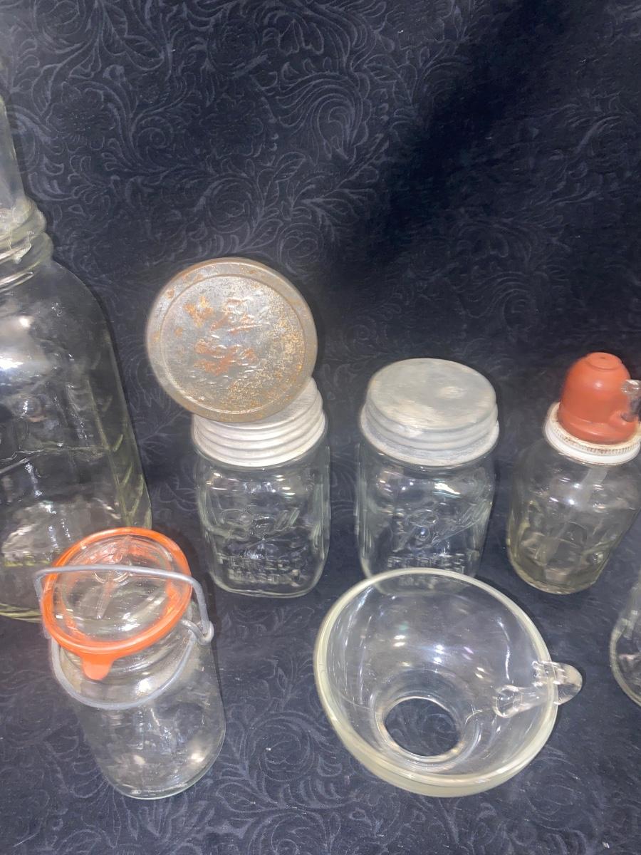 ANTIQUE AND VINTAGE CANNING JARS WITH LIDS & A CHEMICAL BOTTLE