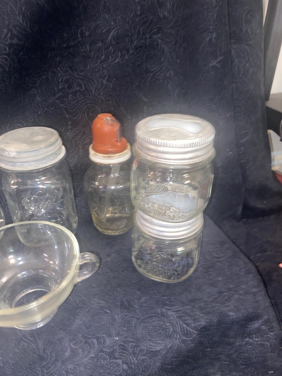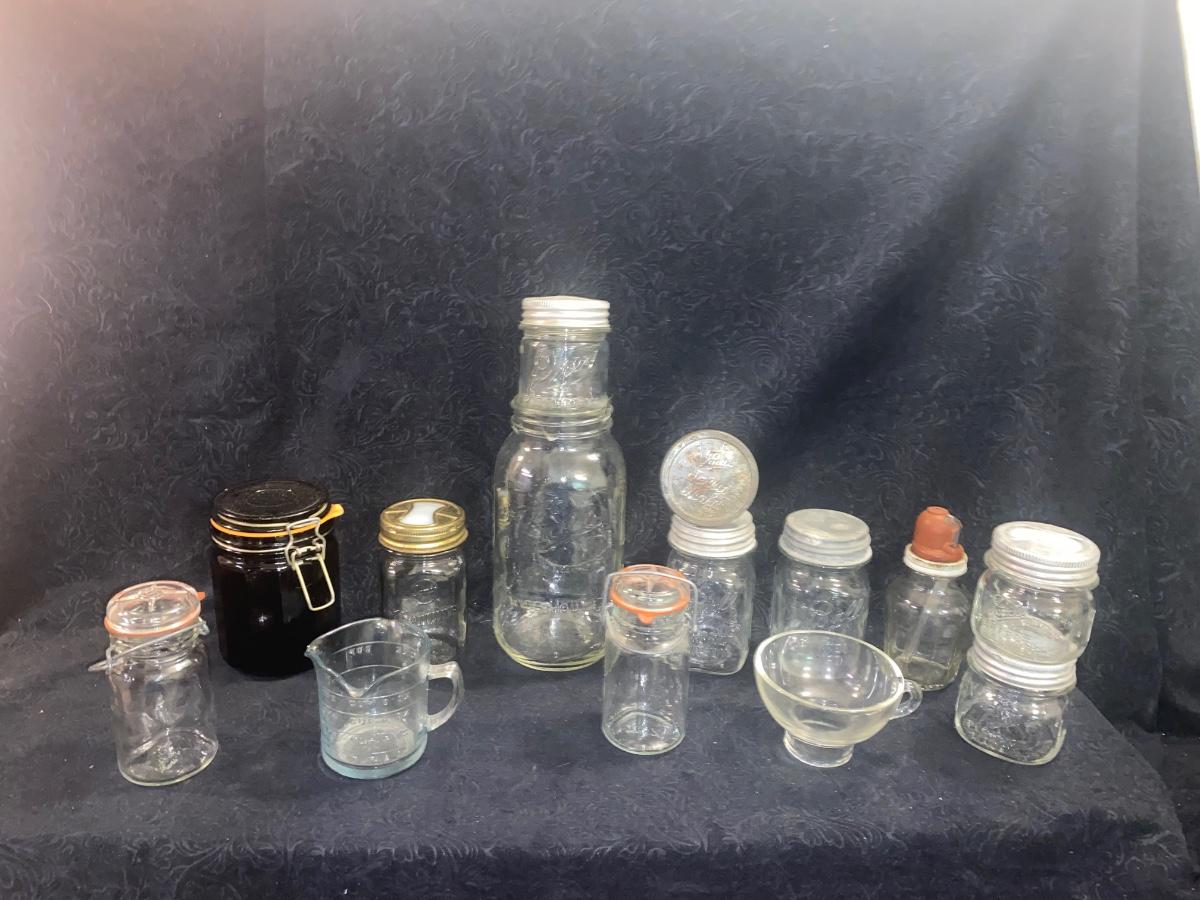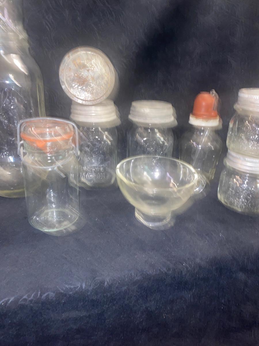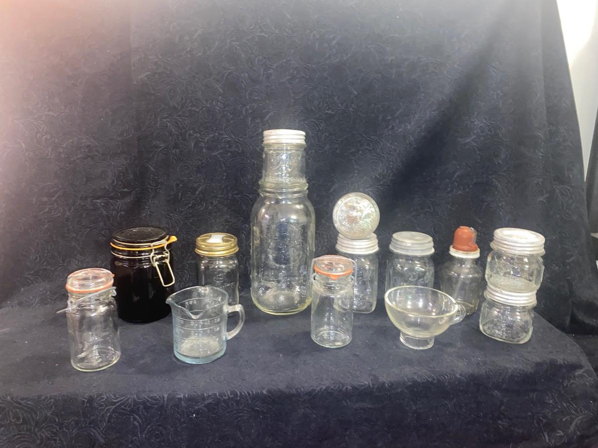 ANTIQUE AND VINTAGE CANNING JARS WITH LIDS & A CHEMICAL BOTTLE
