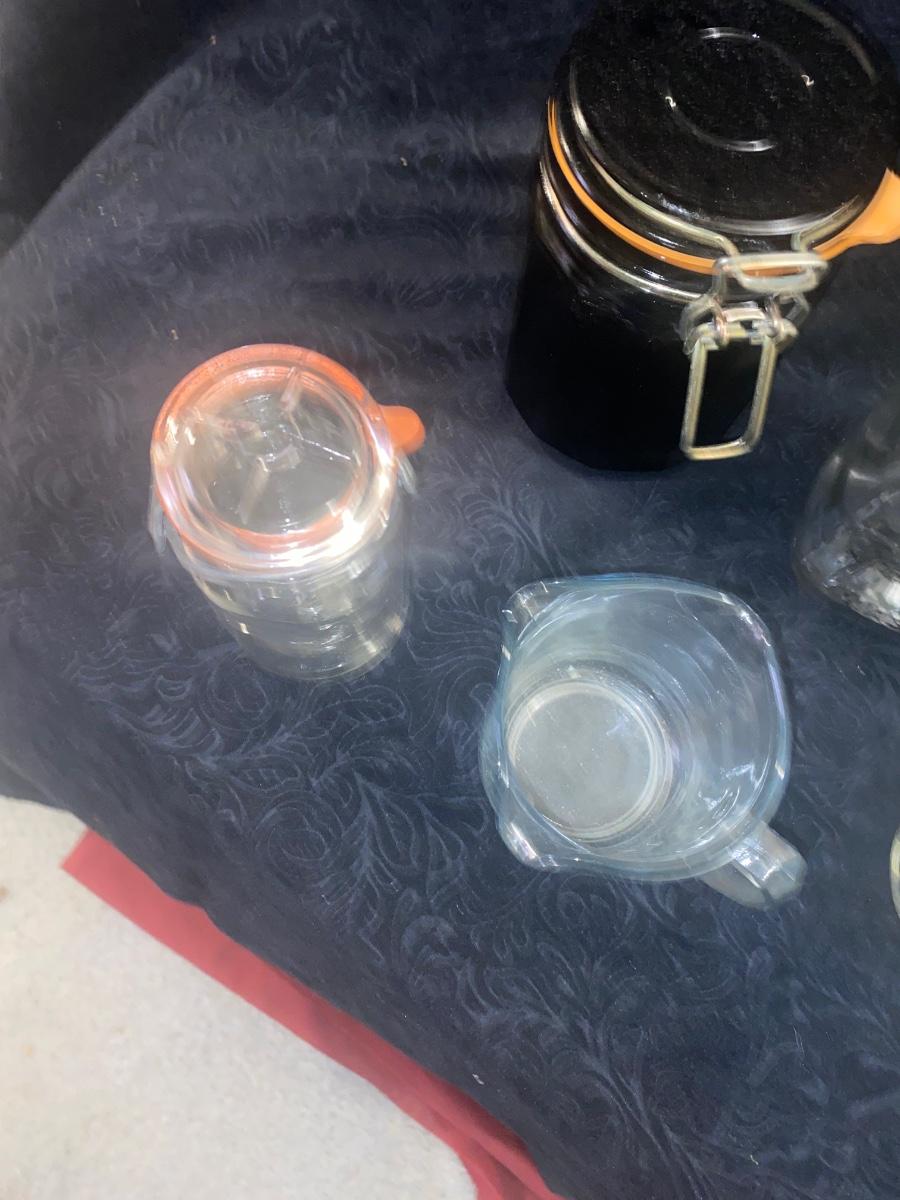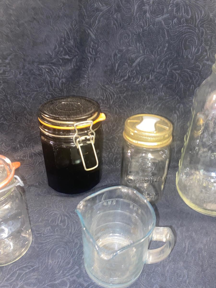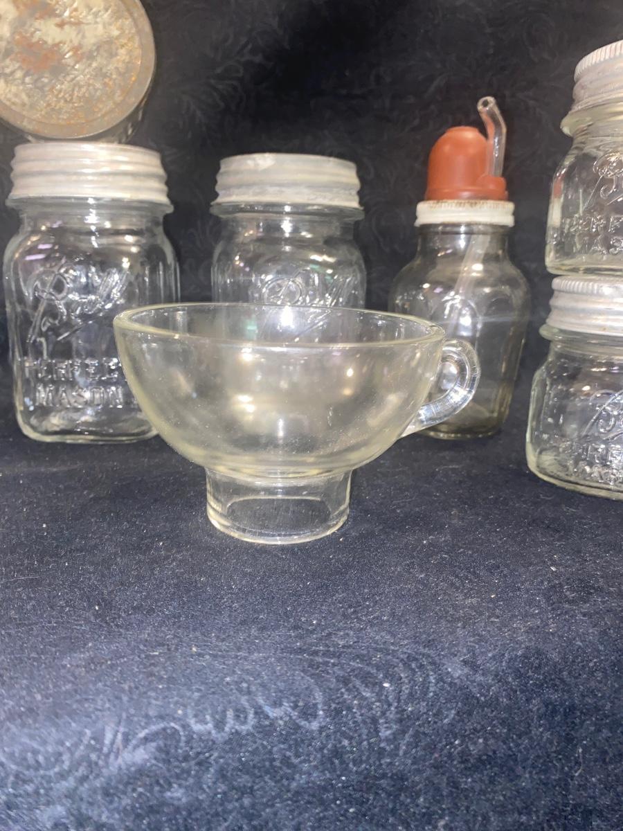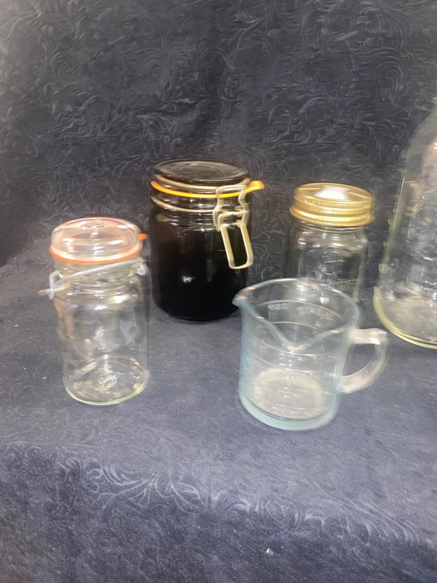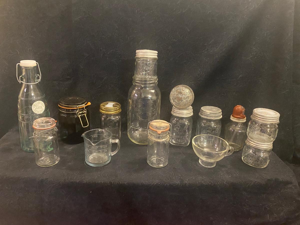 ANTIQUE AND VINTAGE CANNING JARS WITH LIDS & A CHEMICAL BOTTLE