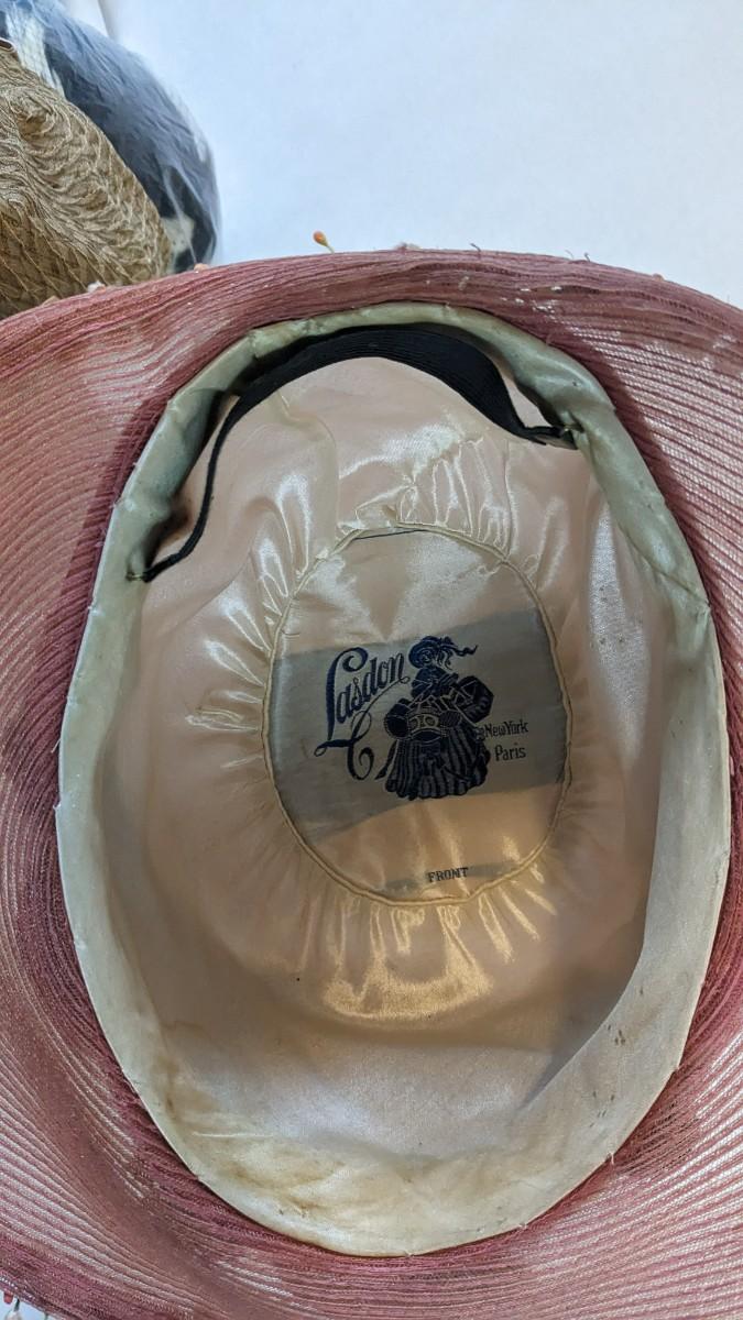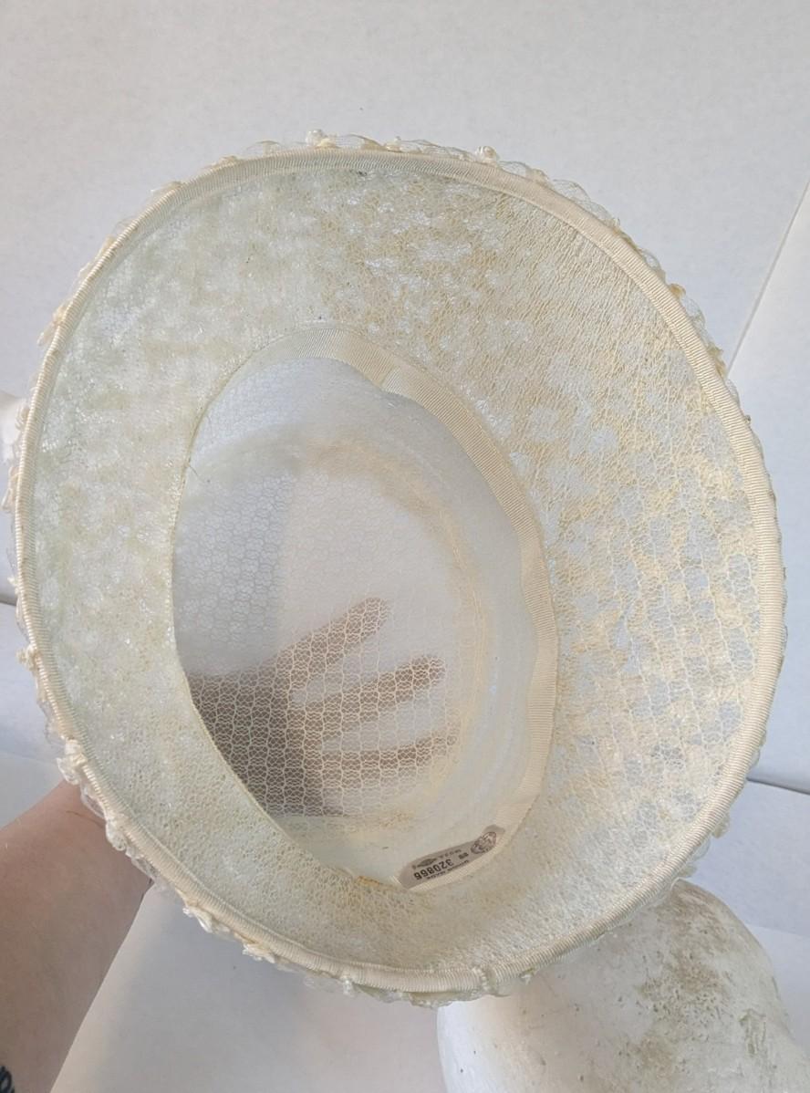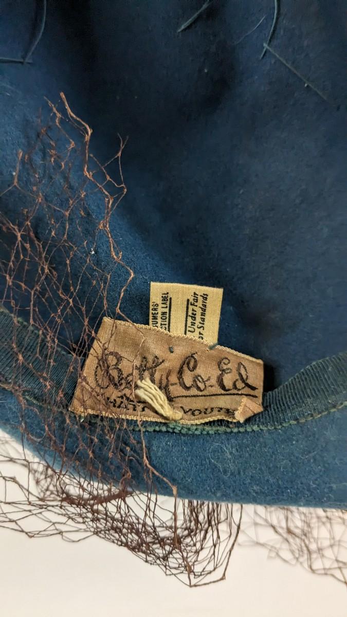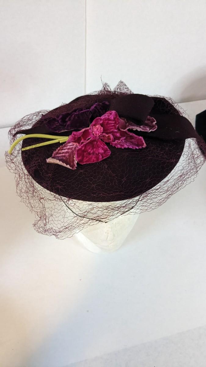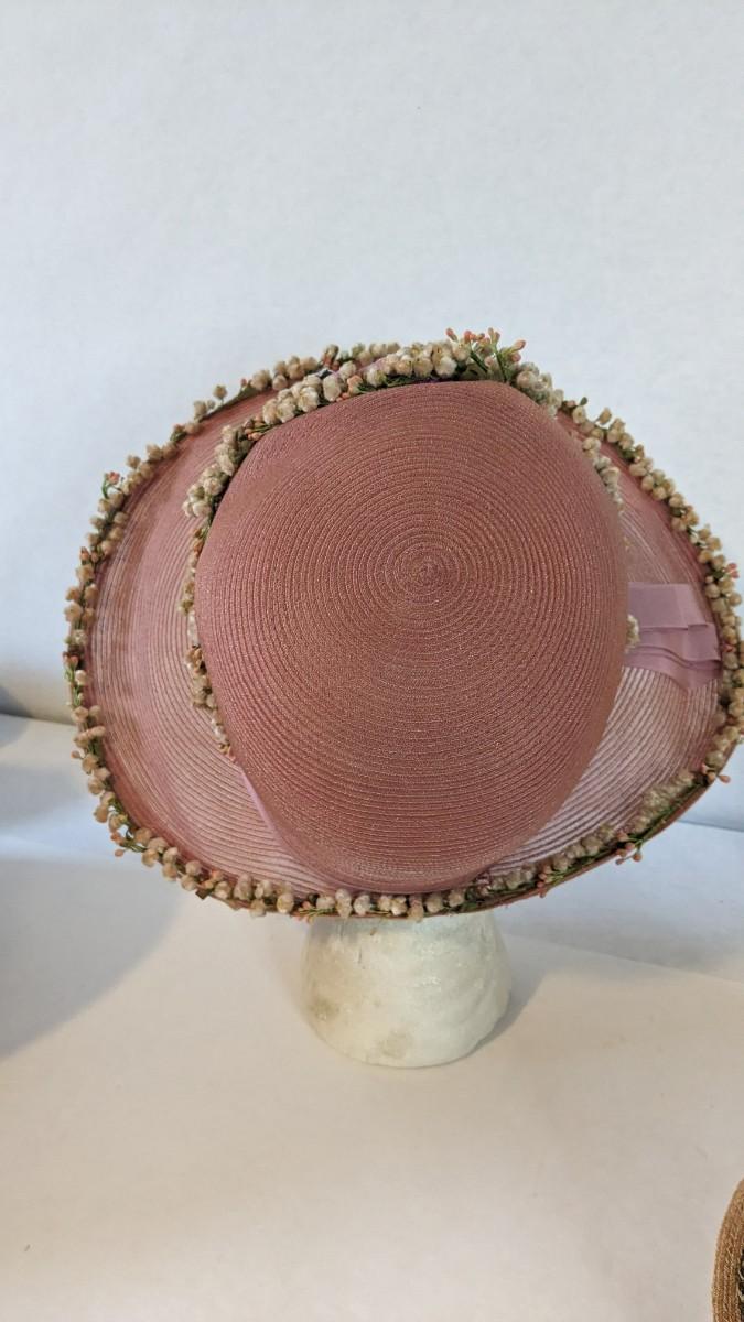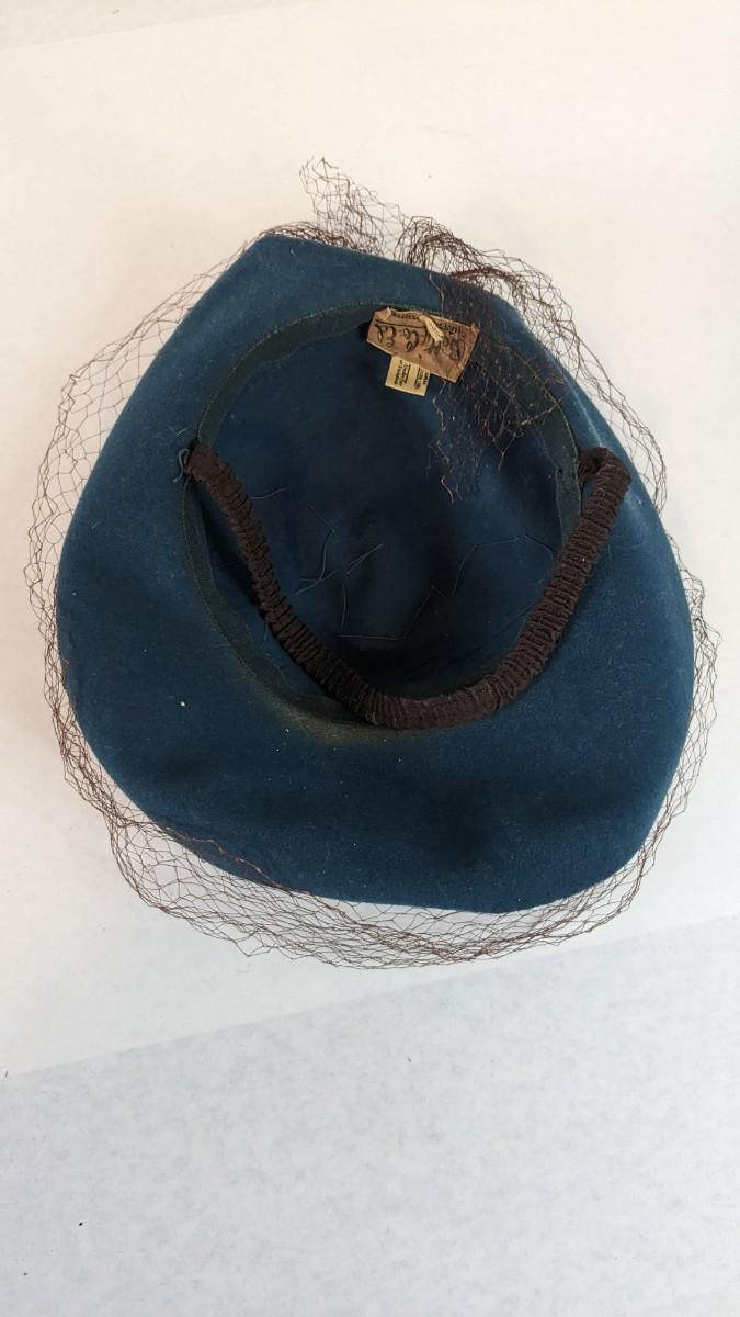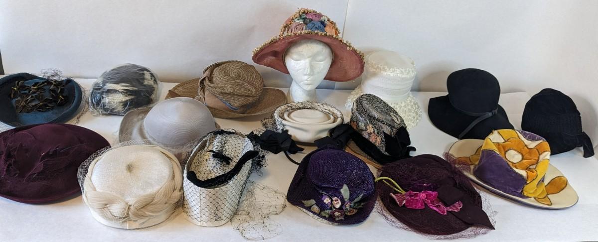 (16) Varied decade and occasion ladies hats, all are in remarkable condition for age showing minor discoloration if any, light wear in accordance to age. Names include Fiskhats, Lasdon, The Lymon Hat, Clover Lane wool, Austelle, Premier, Lansco, Merrimac gardenia hat, Gage Brothers, Town and Country hat, Dover, and Betty Coed. As well as standard union made pieces. There is also a phenomenal Gene Arlette real feather piece. A couple of loose nets are included. Wear is noted as found in photos. Most of these hats were purchased froms Dobbs Fifth Avenue. Extra handling fees will apply. Hat boxes can be found in Lot 79