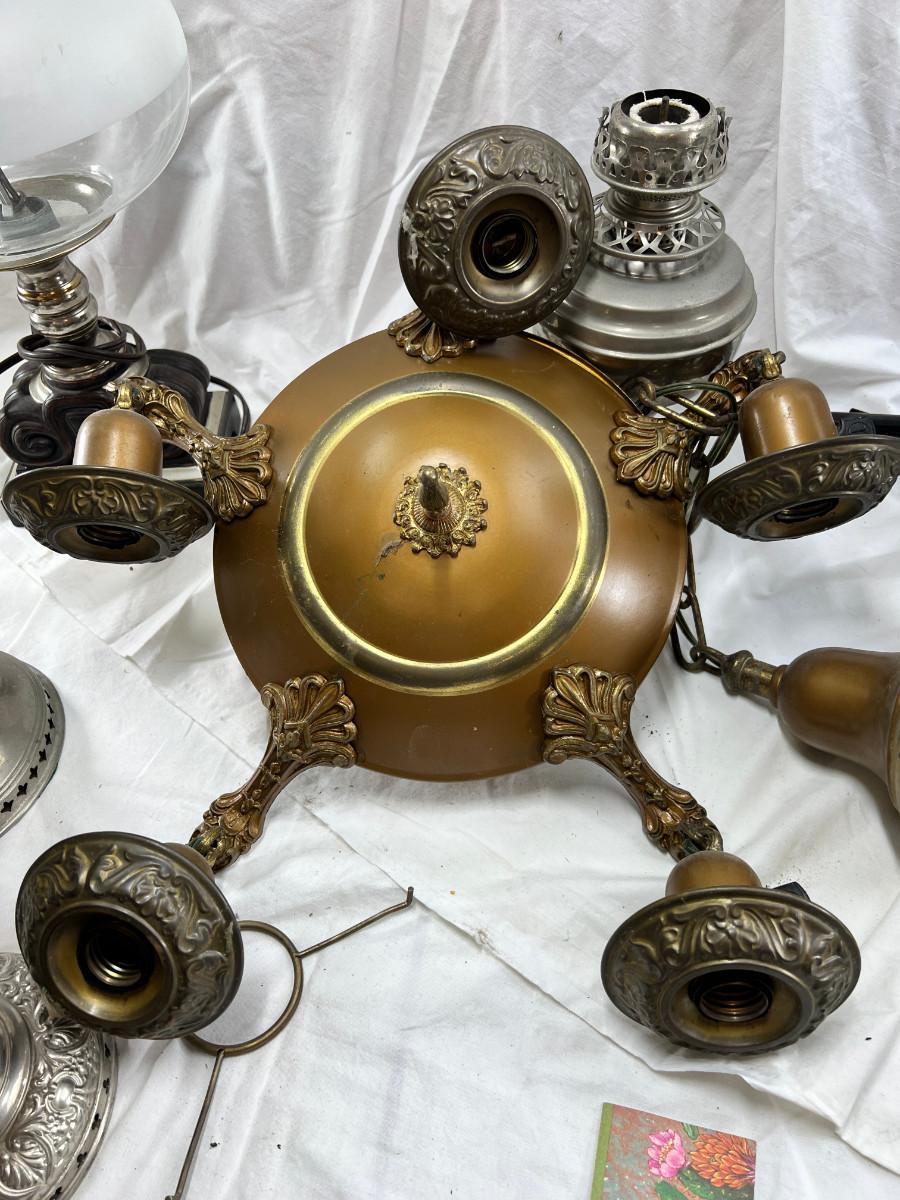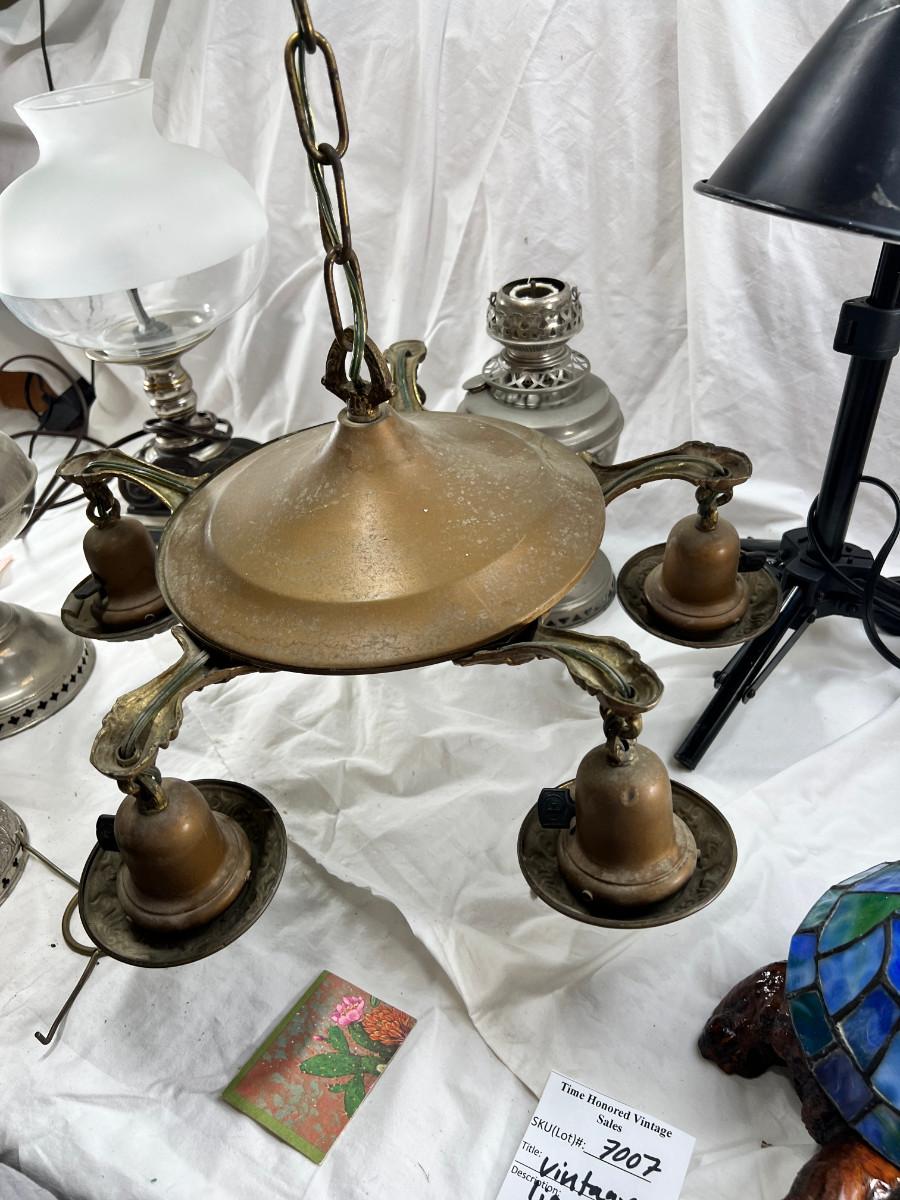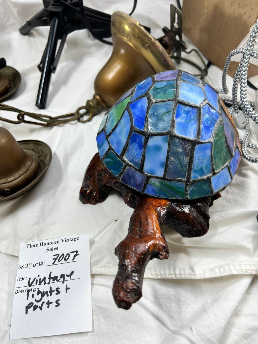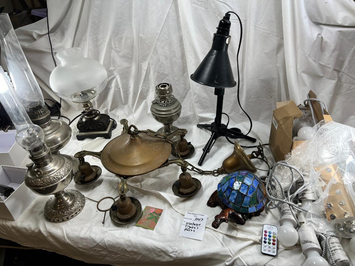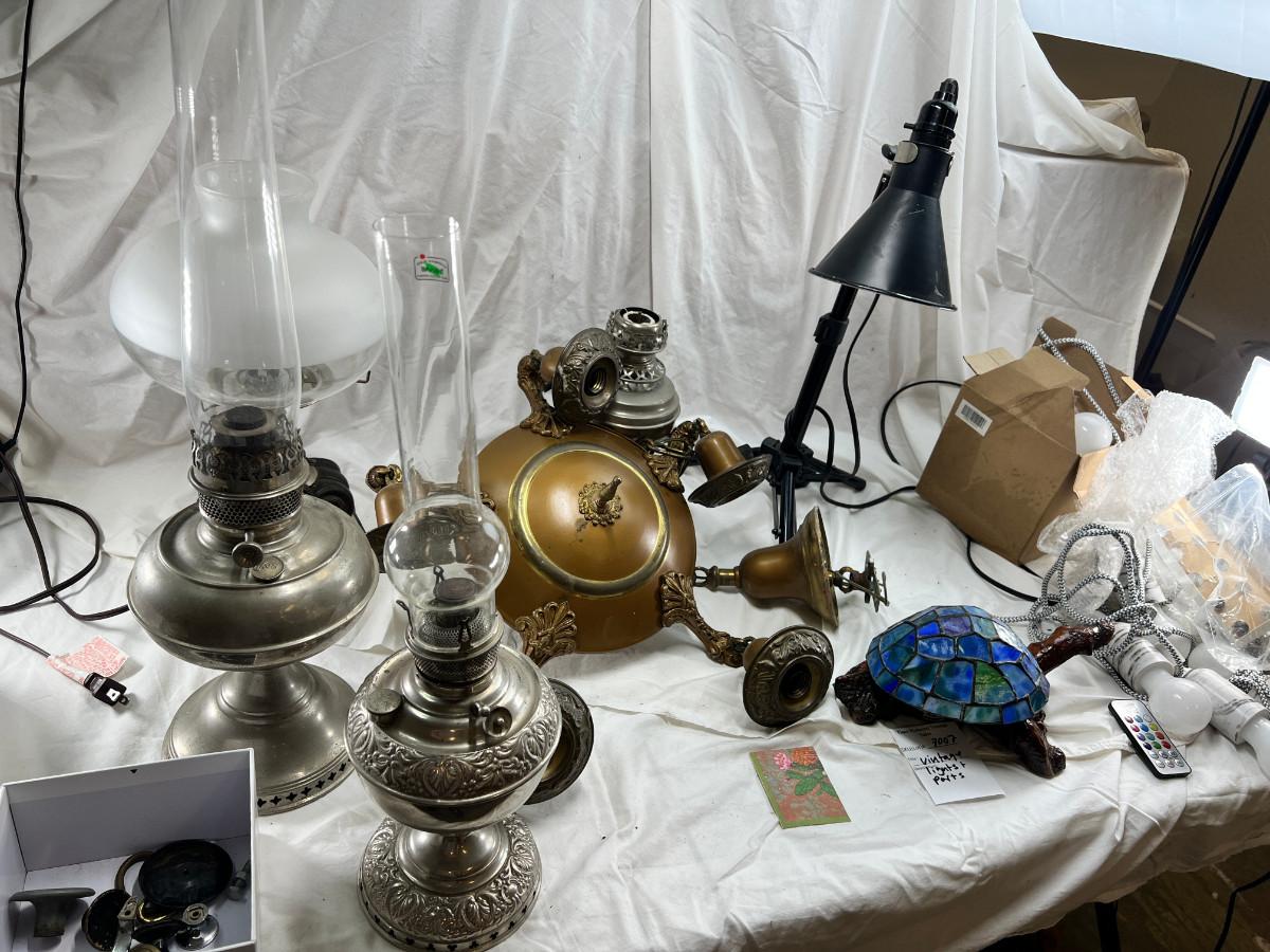 Metal hall light antique swag, for repair or parts. Oil lamps with glass chimneys . Electric light with large mat and clear glass shade, for parts, Do you see the turtle? Its a stained glass shell on top of a wooden pen holder. Hanging electric bulb lights with controller. $25.00 surcharge to ship.