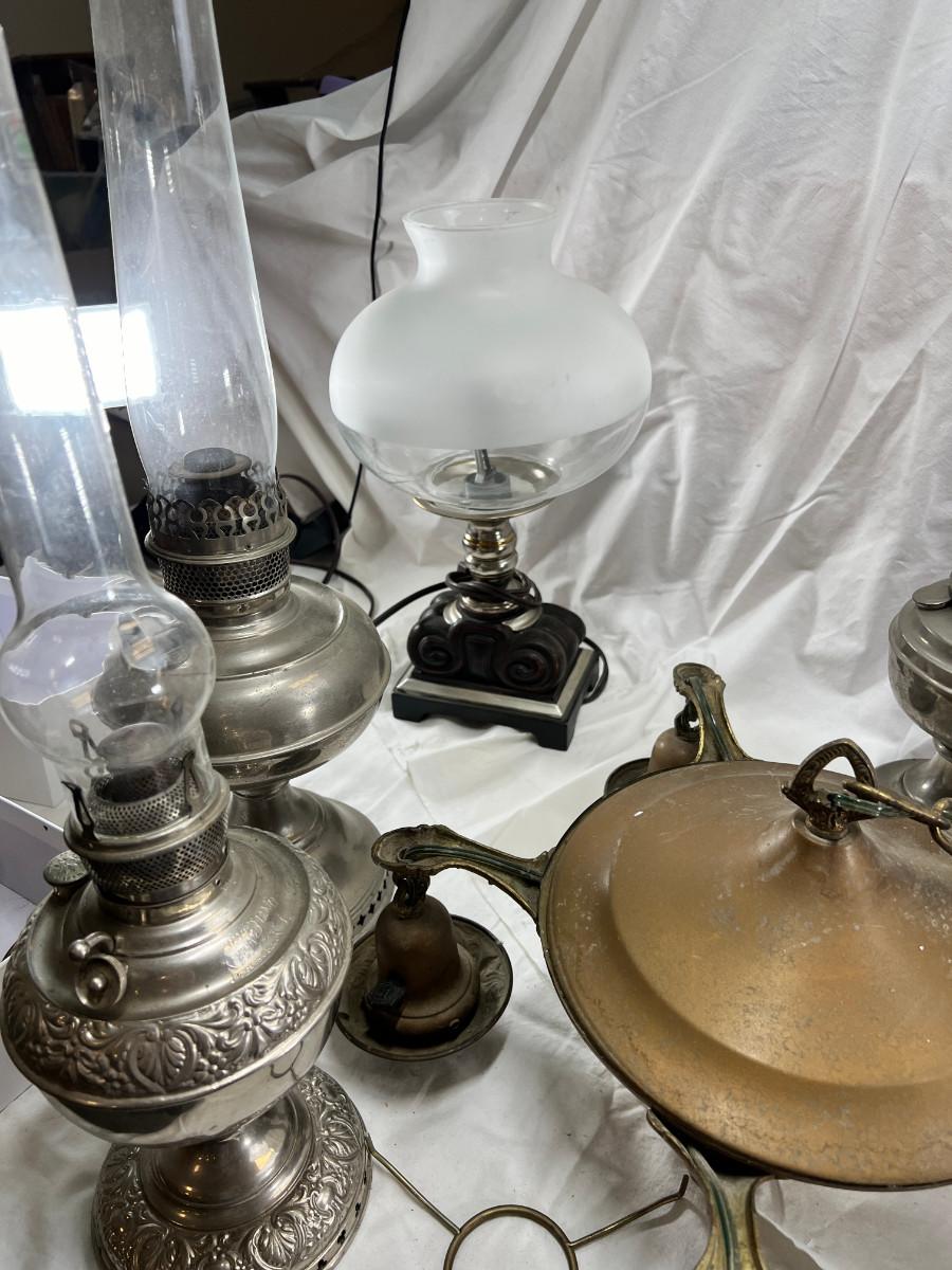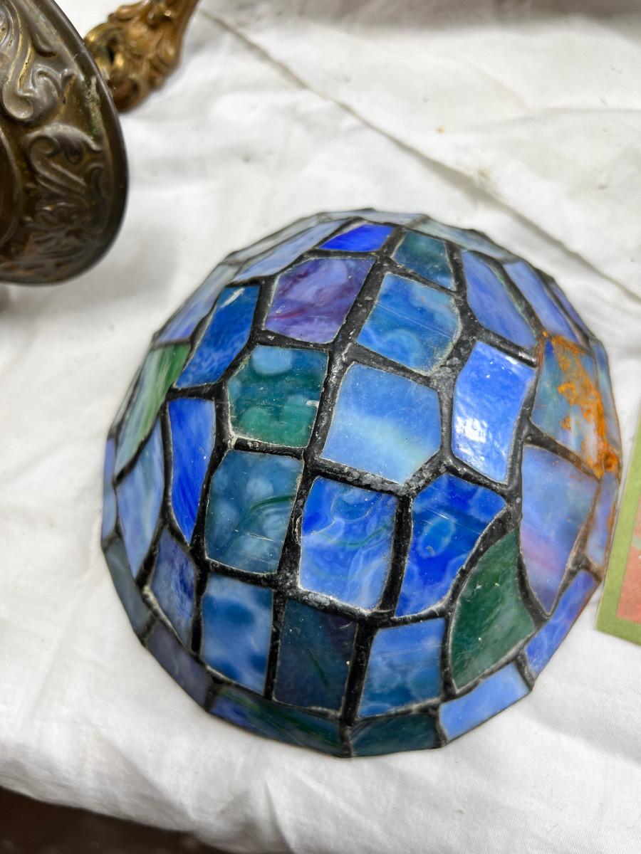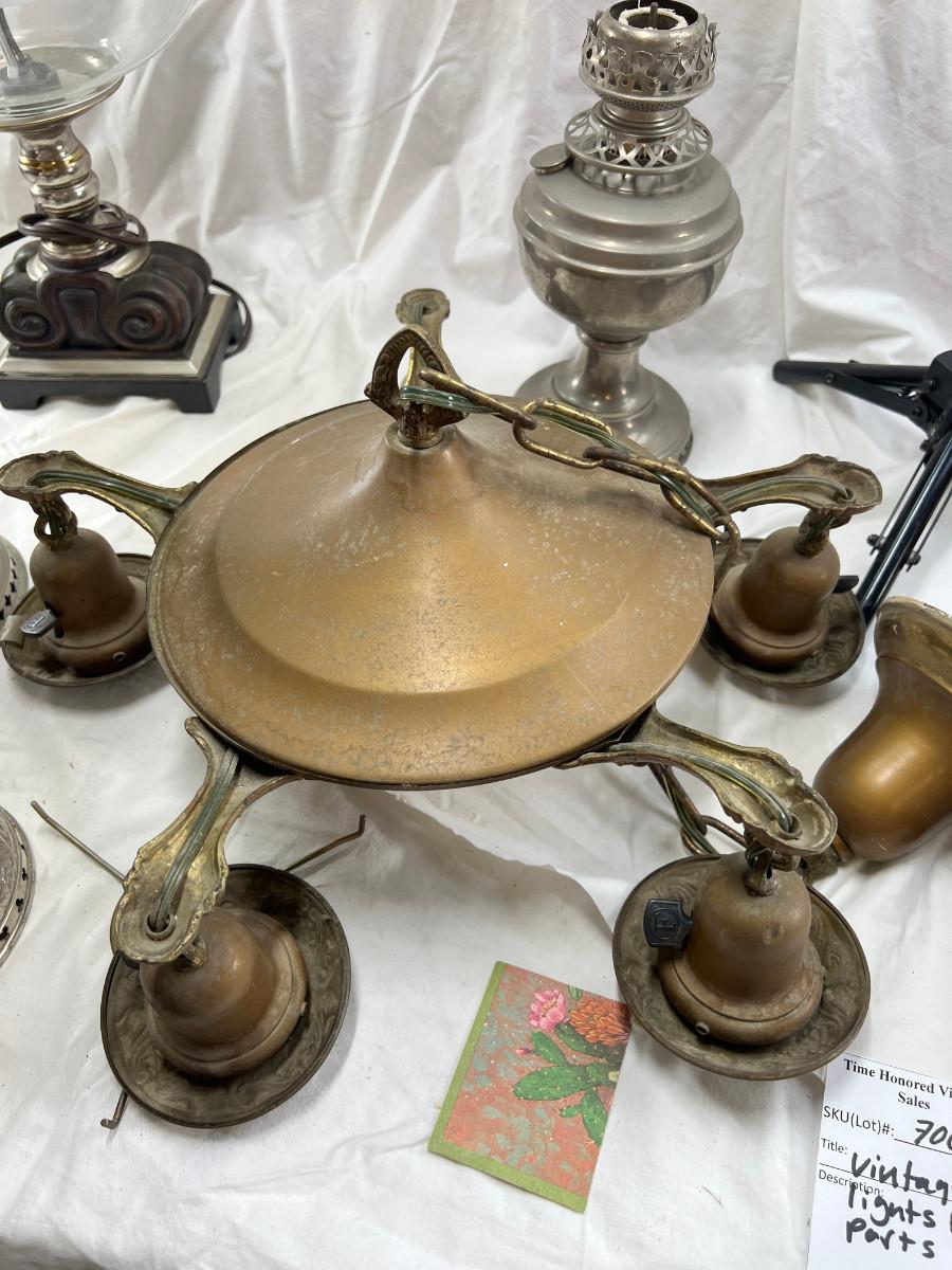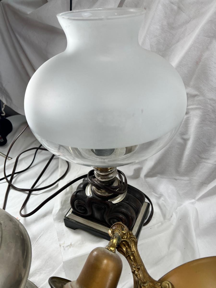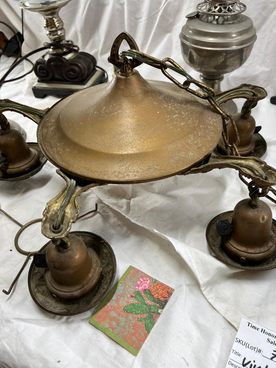 Metal hall light antique swag, for repair or parts. Oil lamps with glass chimneys . Electric light with large mat and clear glass shade, for parts, Do you see the turtle? Its a stained glass shell on top of a wooden pen holder. Hanging electric bulb lights with controller. $25.00 surcharge to ship.