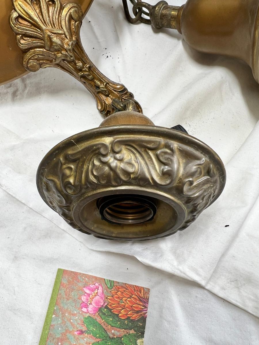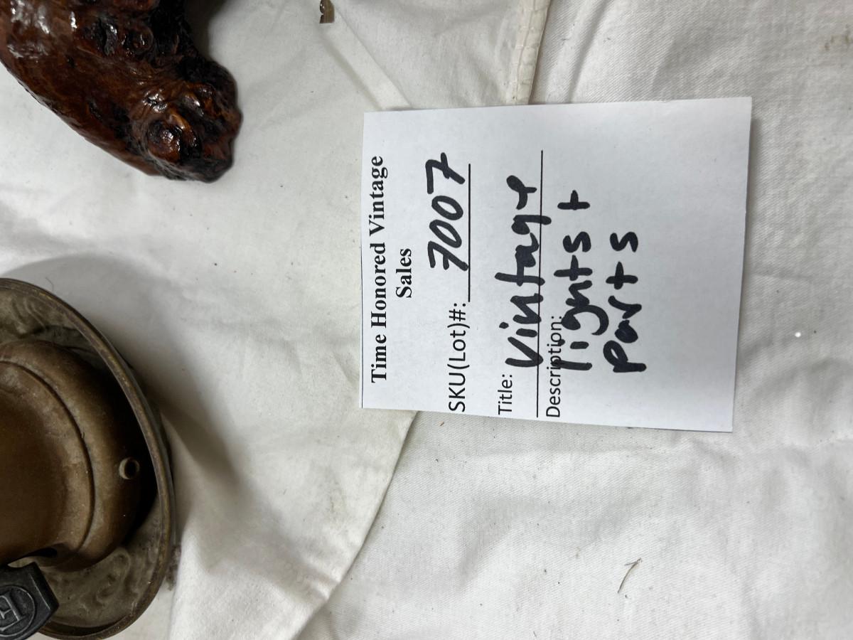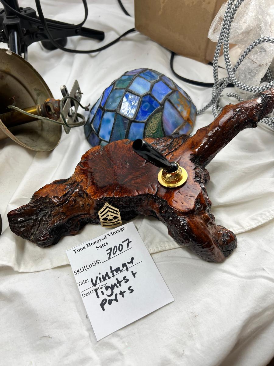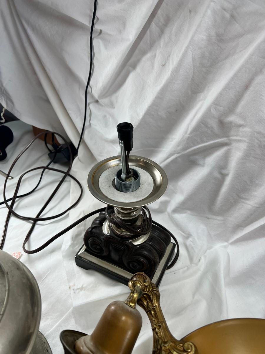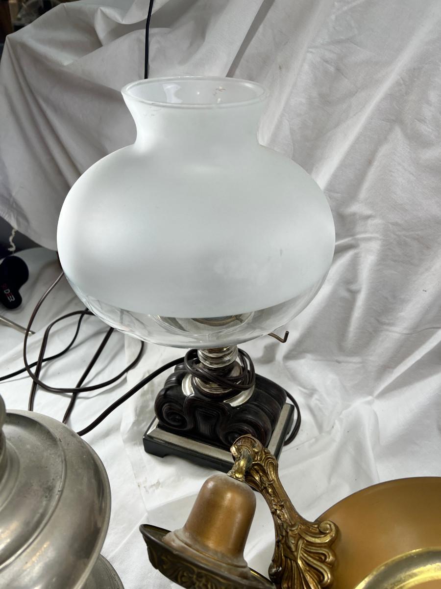 Metal hall light antique swag, for repair or parts. Oil lamps with glass chimneys . Electric light with large mat and clear glass shade, for parts, Do you see the turtle? Its a stained glass shell on top of a wooden pen holder. Hanging electric bulb lights with controller. $25.00 surcharge to ship.