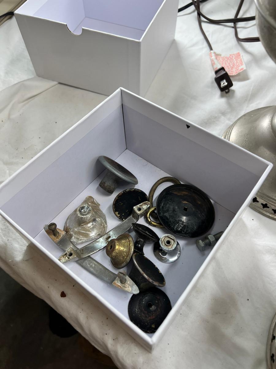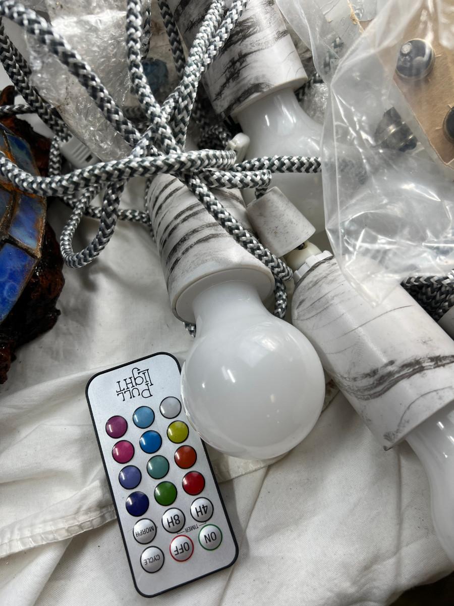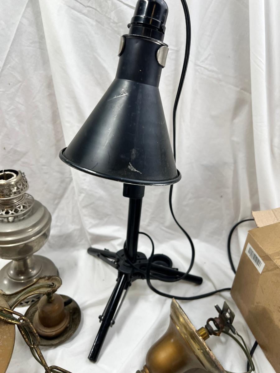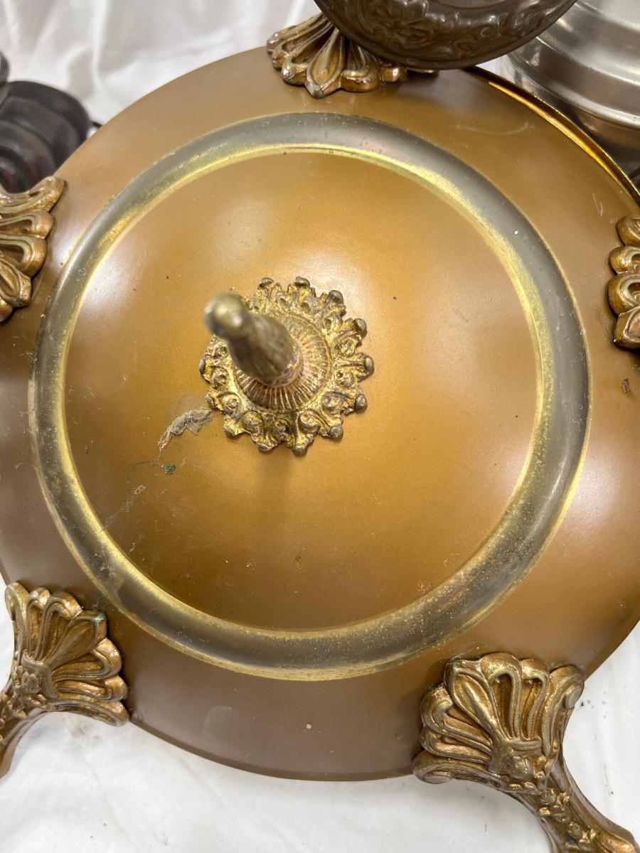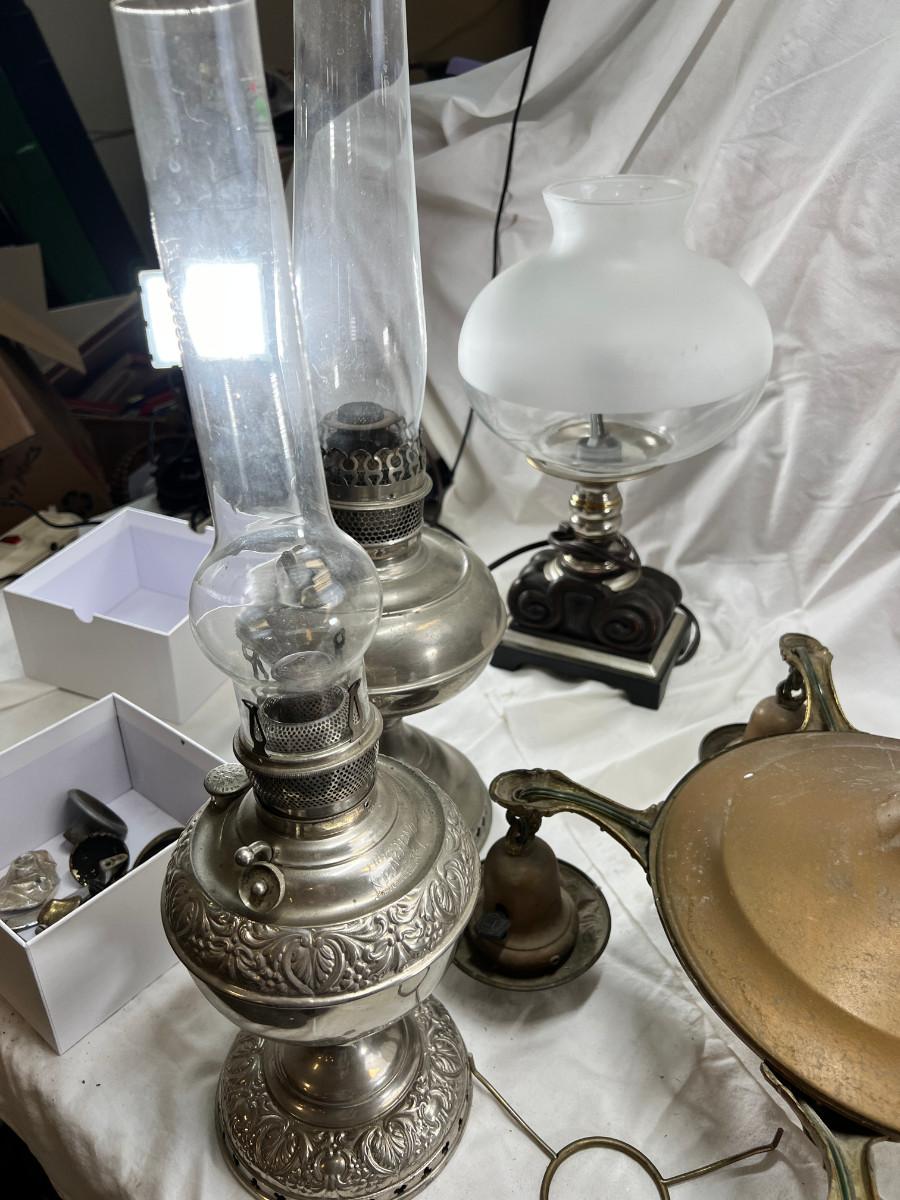 Metal hall light antique swag, for repair or parts. Oil lamps with glass chimneys . Electric light with large mat and clear glass shade, for parts, Do you see the turtle? Its a stained glass shell on top of a wooden pen holder. Hanging electric bulb lights with controller. $25.00 surcharge to ship.