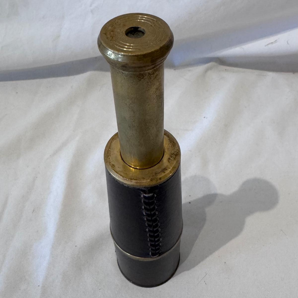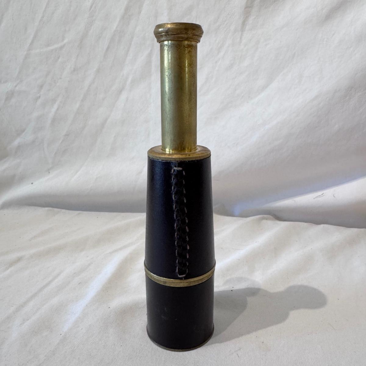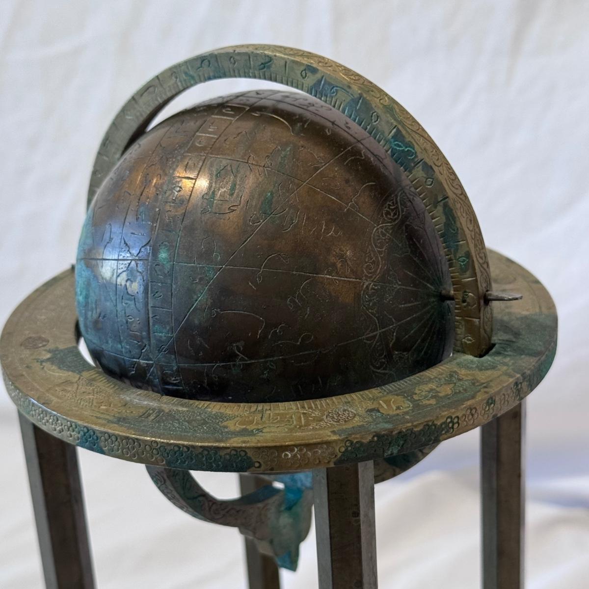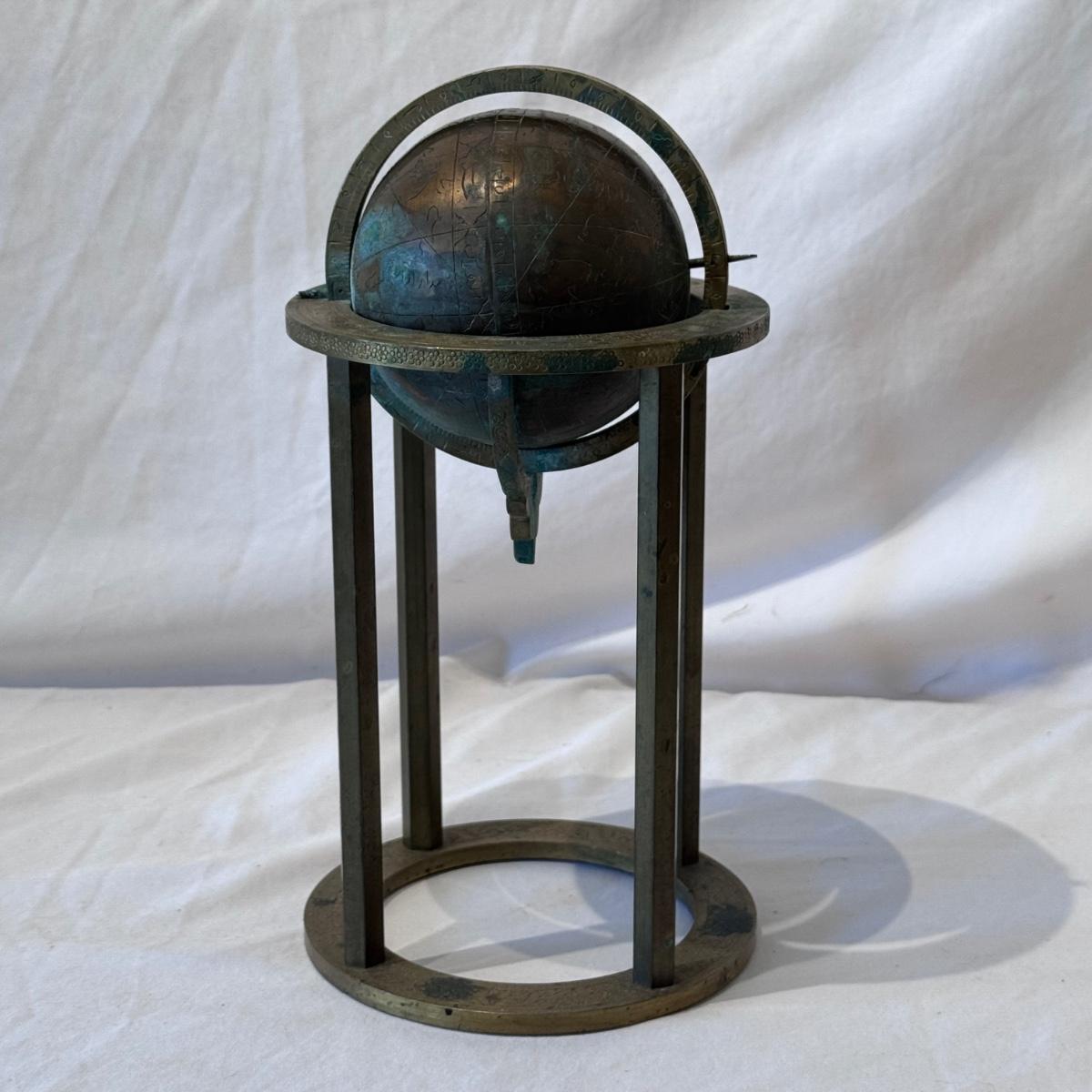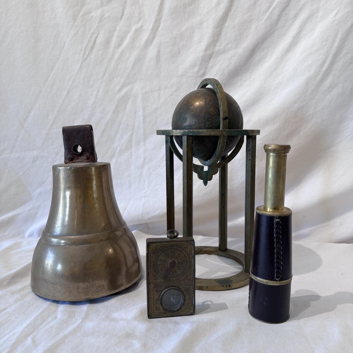 This lot includes one antique Arabic brass pocket compass, one leather wrapped brass nautical telescope/spy glass, one antique brass Persian/Islamic celestial globe, and one brass bell that appears to be antique. All items have a bit of tarnish on them. The globe is removable from its base - see pictures included. The bell makes a lovely dinging sound and measures 5”D x 8”H. Shipping available.