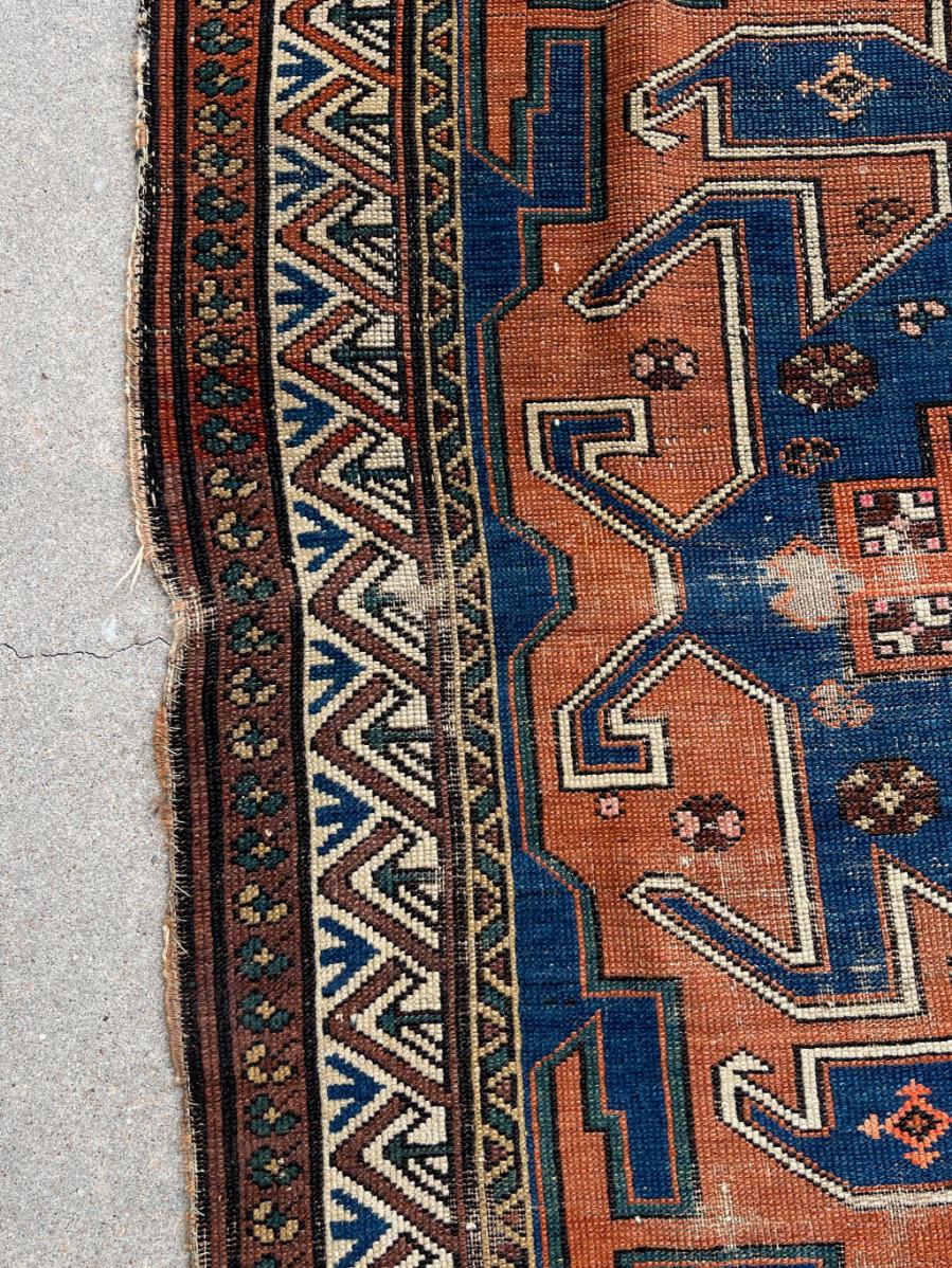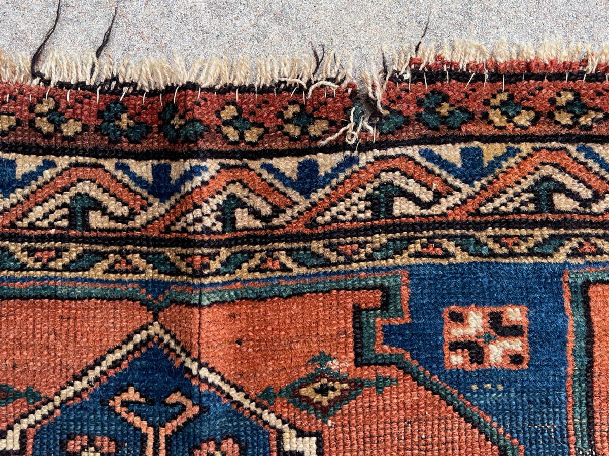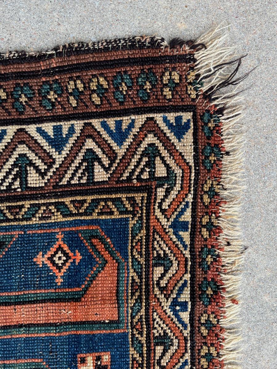 This rug exhibits expected high traffic wear, with one central 2.5 x 2.5 patch of pile worn down to the weft. Still, the well defined tribal pattern and colors are a fine early example from this region. Please refer to the photos for your own assessment of condition.